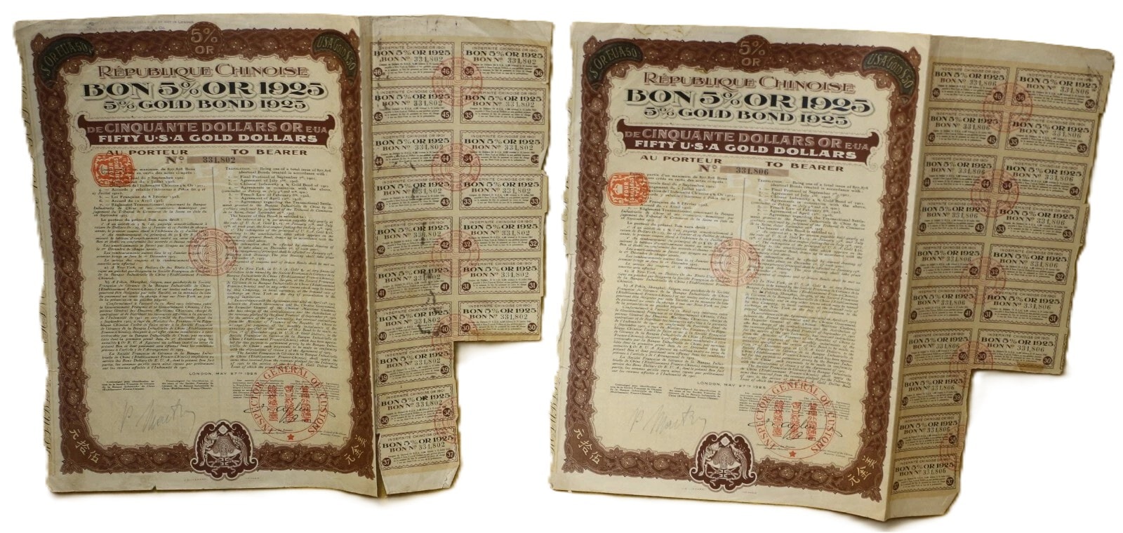 A pair of historical paper securities, specifically 5% Gold Bonds issued by the Chinese Republic (République Chinoise) on May 27, 1925, from London. Each bond is denominated for Fifty U.S.A. Gold Dollars (“DE CINQUANTE DOLLARS OR EUA / FIFTY U.S.A GOLD DOLLARS”) and issued “AU PORTEUR” (To Bearer). The documents feature decorative borders and extensive bilingual text in French and English detailing terms, alongside Chinese characters (“天陆伍拾元” and “陆伍拾元” confirming the “Fifty Yuan” denomination. Visible bond numbers are 331.802 and 331.806. Numerous red official stamps and seals are present, including those from the “GENERAL INSPECTORATE OF CUSTOMS” and “BUREAU GENERAL DES DOUANES MARITIMES CHINOISES.” Each main bond document includes a perforated sheet of detachable coupons, individually numbered and bearing the inscription “INDEMNITÉ CHINOISE OR 1901” (Chinese Indemnity Gold 1901), with payment dates extending into the 1940s, linking them to the Boxer Protocol indemnity payments. An additional document, an amortization table (“TABLEAU D’AMORTISSEMENT”), details repayment schedules.