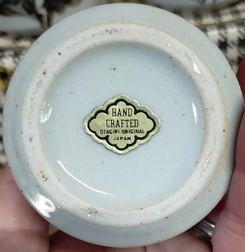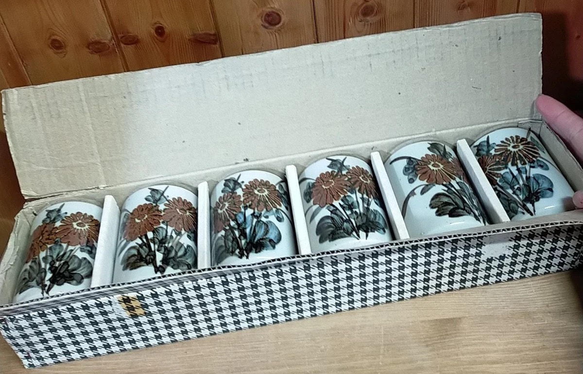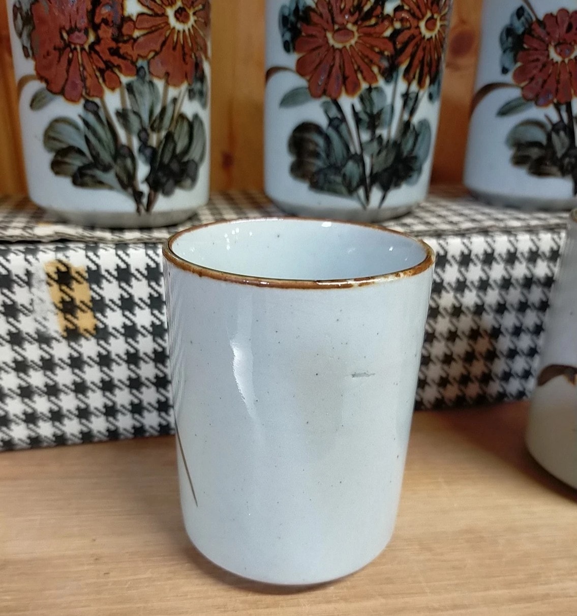 A set of six Otagiri Hand Crafted Japanese ceramic tumblers, each featuring a light, speckled glaze and hand-painted floral decoration. The motif depicts orange-brown, daisy-like flowers with green and blue foliage, rendered in a style consistent with mid-20th century Japanese folk art ceramics. The base of at least one tumbler bears a gold foil sticker reading “HAND CRAFTED OTAGIRI ORIGINAL JAPAN.” The set is presented in its original houndstooth-patterned cardboard box with internal dividers. 8.5cm tall