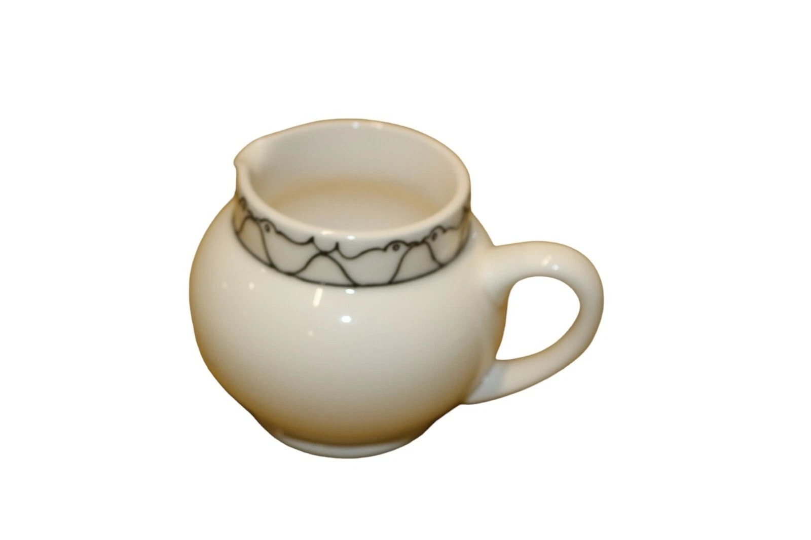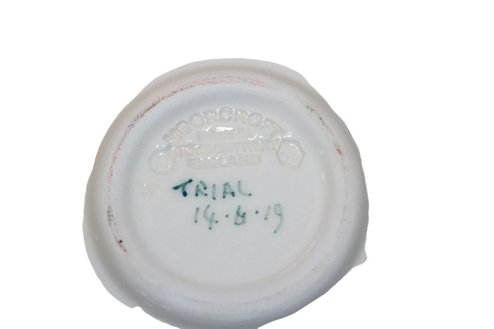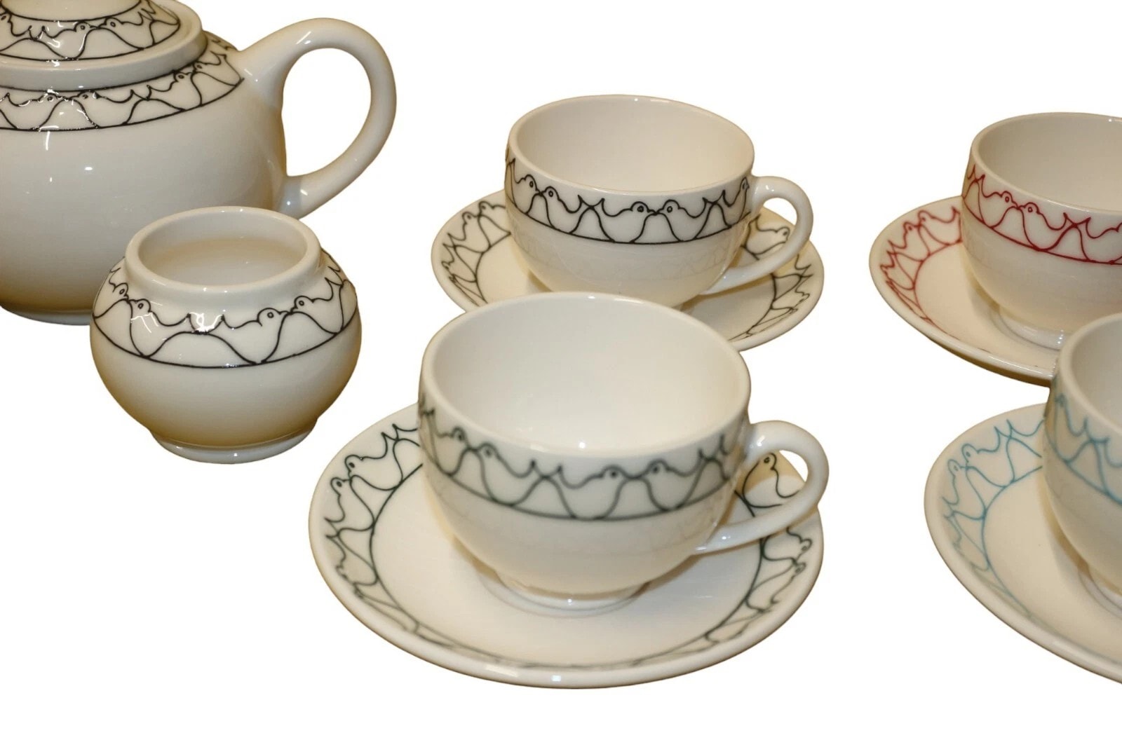 A ceramic tea service by Moorcroft, marked ‘TRIAL 14.8.19’. The service comprises a lidded teapot, a creamer, a sugar bowl, and five cups with their corresponding saucers. Each piece is crafted from white glazed ceramic and adorned with a distinctive, repeating curvilinear pattern, which appears to depict stylized birds, applied as a decorative band. The pattern is executed in black on the teapot, creamer, sugar bowl, and one cup/saucer set, with the remaining four cup and saucer sets featuring the pattern in red, dark blue, light blue, and yellow respectively. Visible impressed manufacturer’s mark ‘MOORCROFT MADE IN ENGLAND’ is present on the bases, along with a handwritten green script ‘TRIAL 14.8.19’, indicating these are prototype or sample pieces. Various retail stickers with item codes (e.g., ‘T/D BIRDCR’, ‘T/D BIRDT/POT’) and associated pricing are also present.