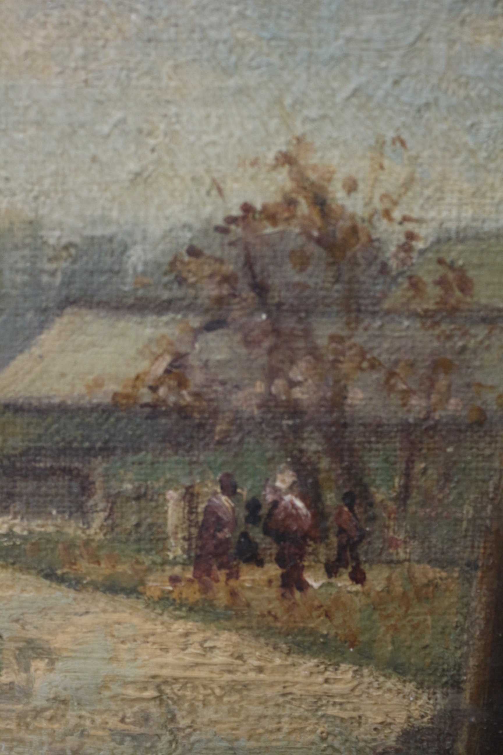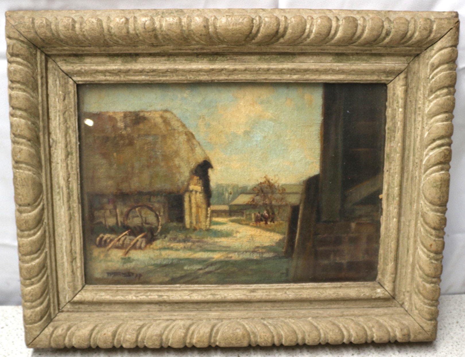 An early 20th-century oil painting on board by Morgan Alfred THORNLEY, titled ‘The OLD BARN’. The work depicts a rural or farmyard scene, featuring a thatched-roof building, various agricultural implements, and distant figures, executed in a naturalistic or impressionistic style. It is signed ‘THORNLEY 37’ in the lower left corner, indicating the artist’s name and a likely execution date of 1937. The painting is presented in a carved, light-coloured wooden frame with a shell-like motif. The reverse of the board features a ‘UNITED SOCIETY OF ARTISTS’ Exhibition label, which confirms the artist as M. THORNLEY and identifies the title as ‘The OLD BARN’. The label also bears a handwritten date of ‘1939’ and an original price of ‘£5:5:0’ (five guineas), along with additional notes including ‘J. S. A. Stanley Studios’. 51.5x40cm