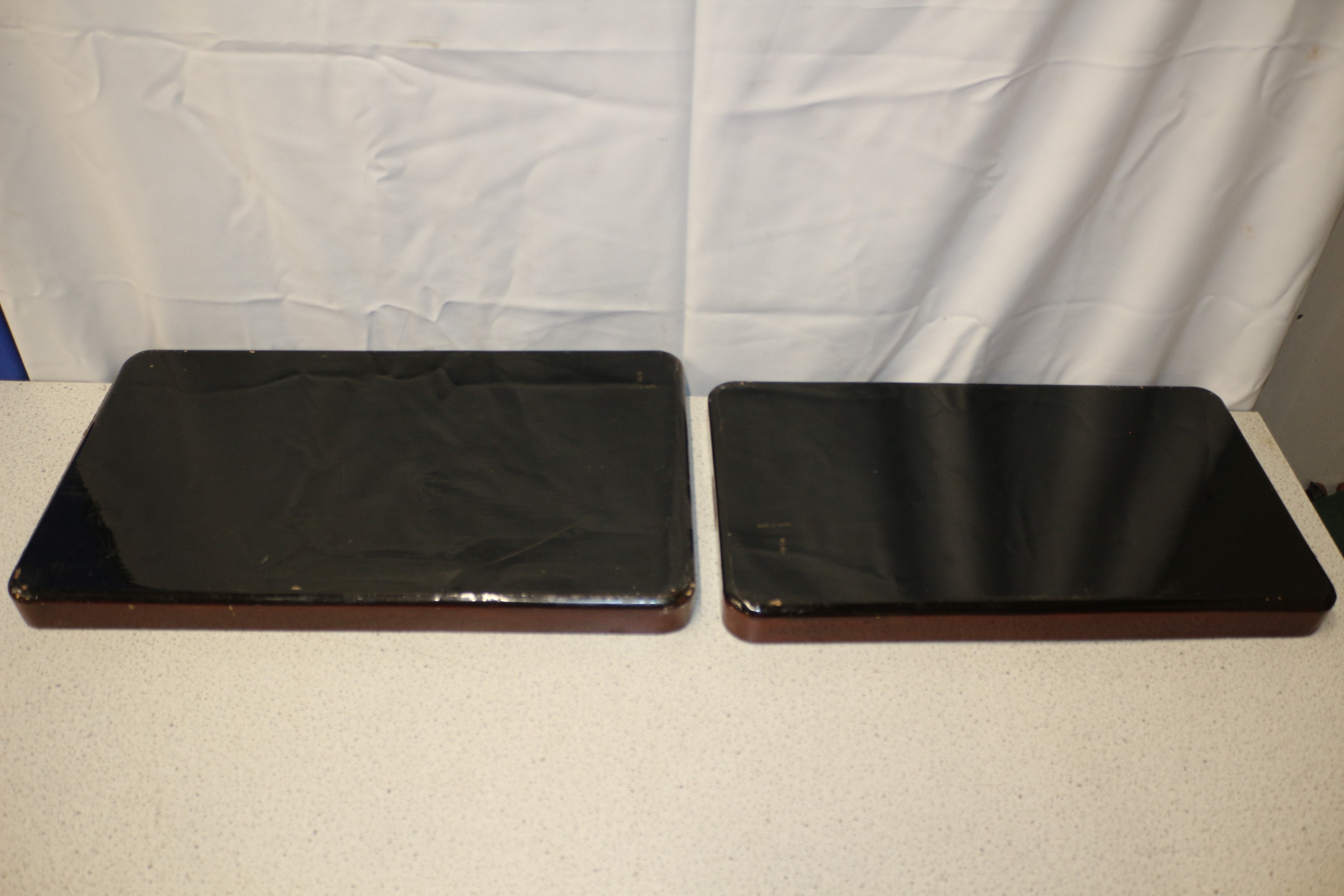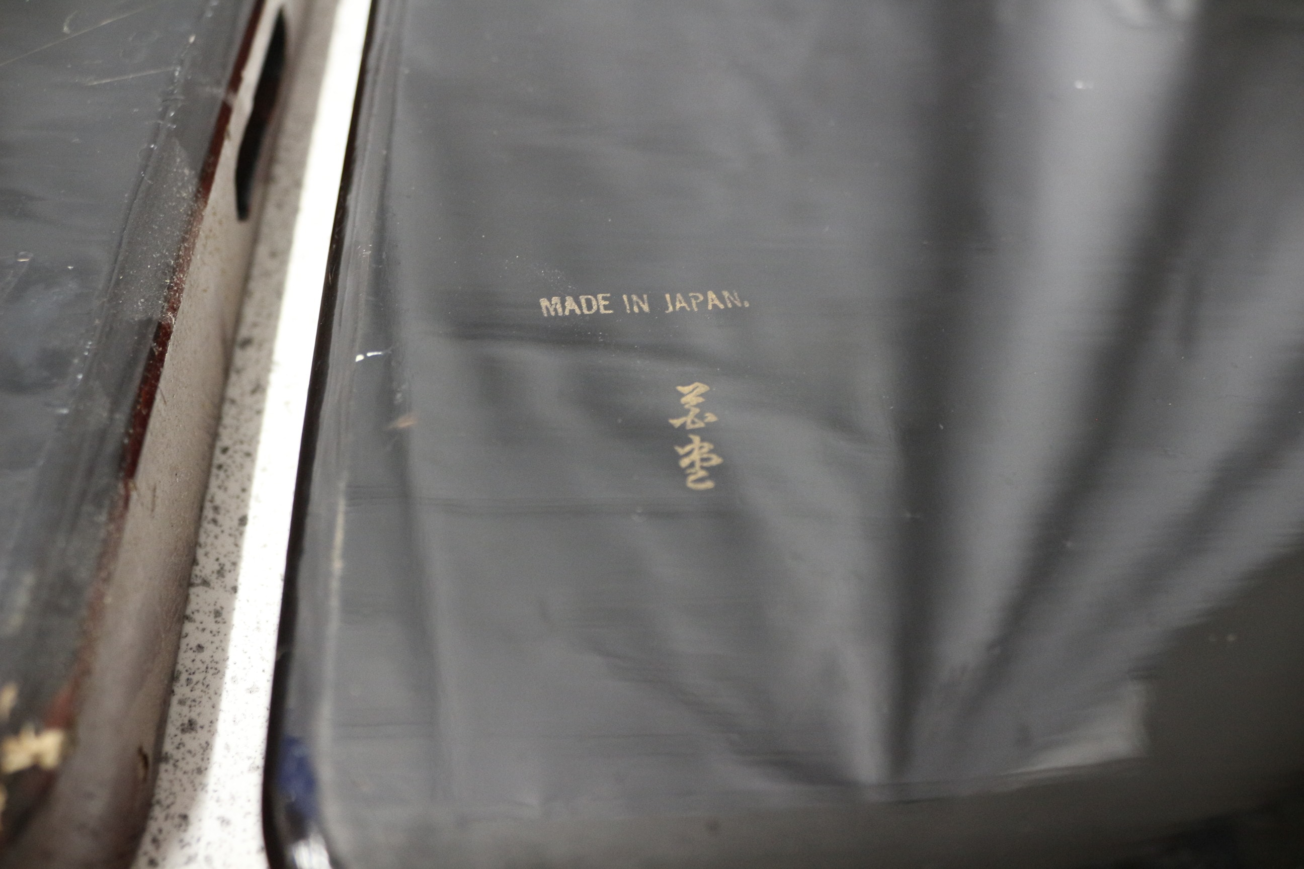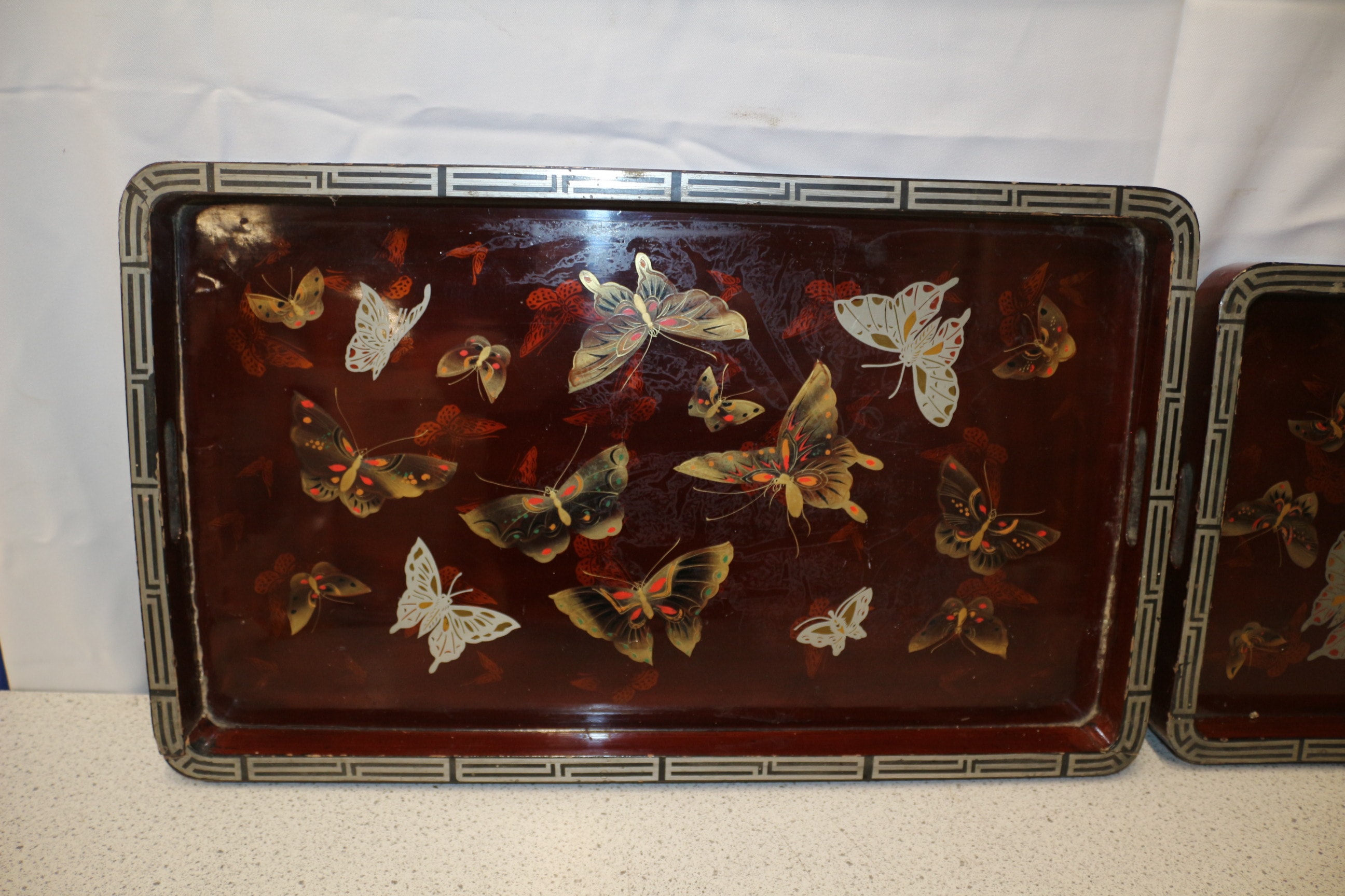 A pair of rectangular Japanese lacquerware trays, one larger and one smaller, featuring a dark reddish-brown ground embellished with a dynamic arrangement of numerous butterflies rendered in gold, white, and earthy tones, some appearing to be mother-of-pearl inlay. The perimeter of each tray is decorated with a geometric fretwork pattern in alternating black and silver-grey. The undersides are marked with “MADE IN JAPAN” and Japanese characters, identified as 芝山 (Shibayama), indicating a specific style of inlay work.
