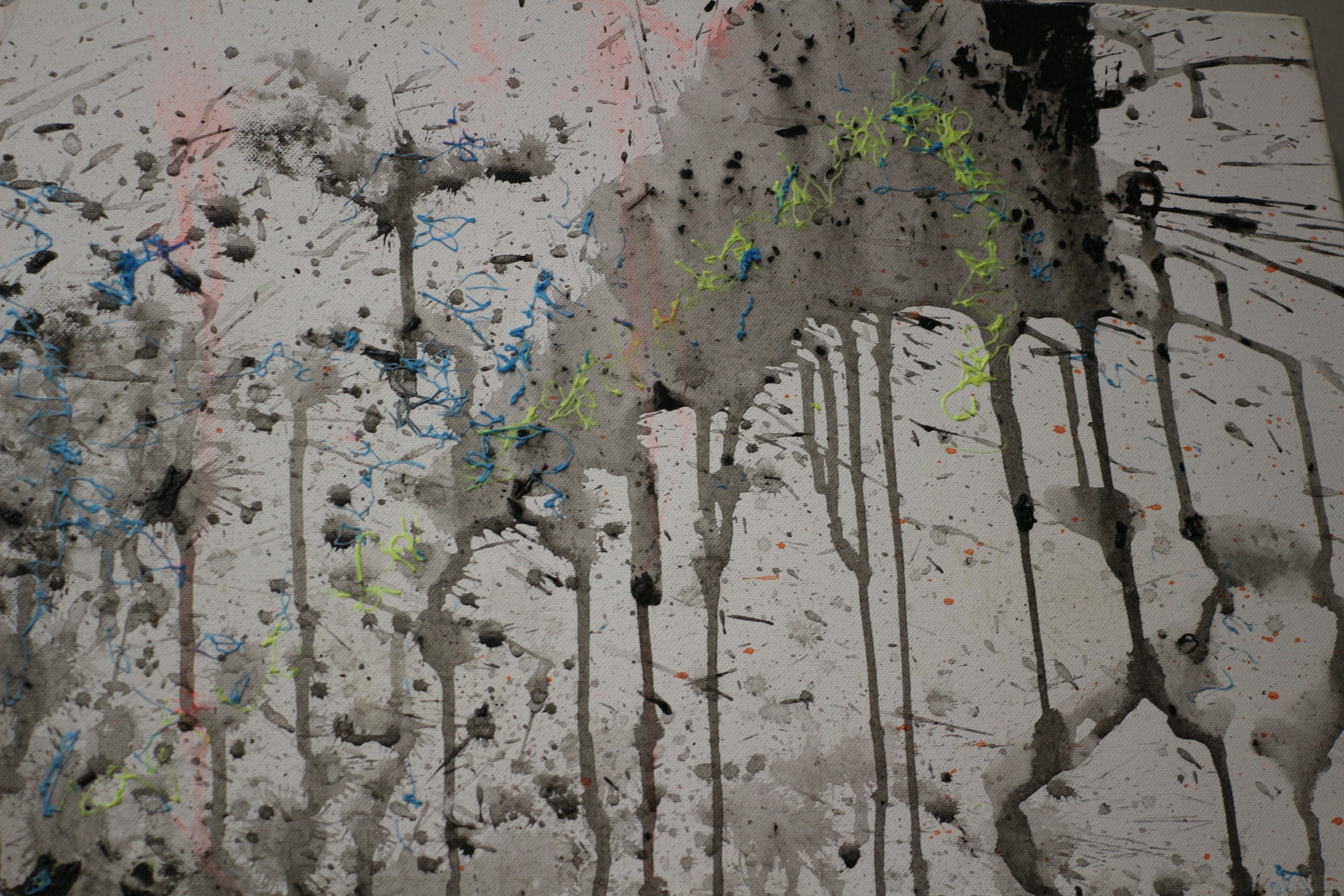 A large-scale contemporary abstract painting on stretched canvas, executed in an action painting style. In the style of Norbert Engel. The composition is characterized by extensive dripping, splattering, and gestural marks, primarily featuring black and various shades of grey. Vibrant accents of neon yellow, electric blue, and sporadic touches of pink provide contrast. The paint, likely acrylic, exhibits a range of applications, from thin, vertical drips to textured impasto areas, particularly with the neon yellow. No visible text, signature, or identifying markings are present. 91x122cm
