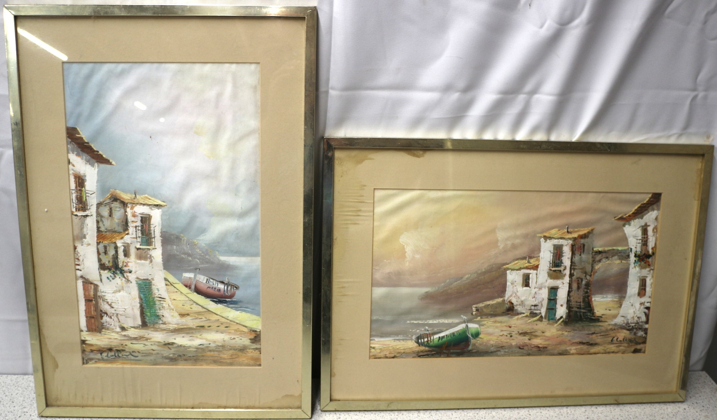 A pair of framed oil paintings, executed in an impasto technique depicting Mediterranean-style coastal landscapes, likely from the mid-to-late 20th century. Each artwork, rendered in oil on canvas or board, is housed under glass with a tan mat and set within a thin brass-tone metal frame. Both paintings bear a signature of “F. Cullell” (or similar) in the lower corner, with the vertically oriented piece also featuring the English word “HAIDA” on the hull of a boat. 52.5x37cm. AF