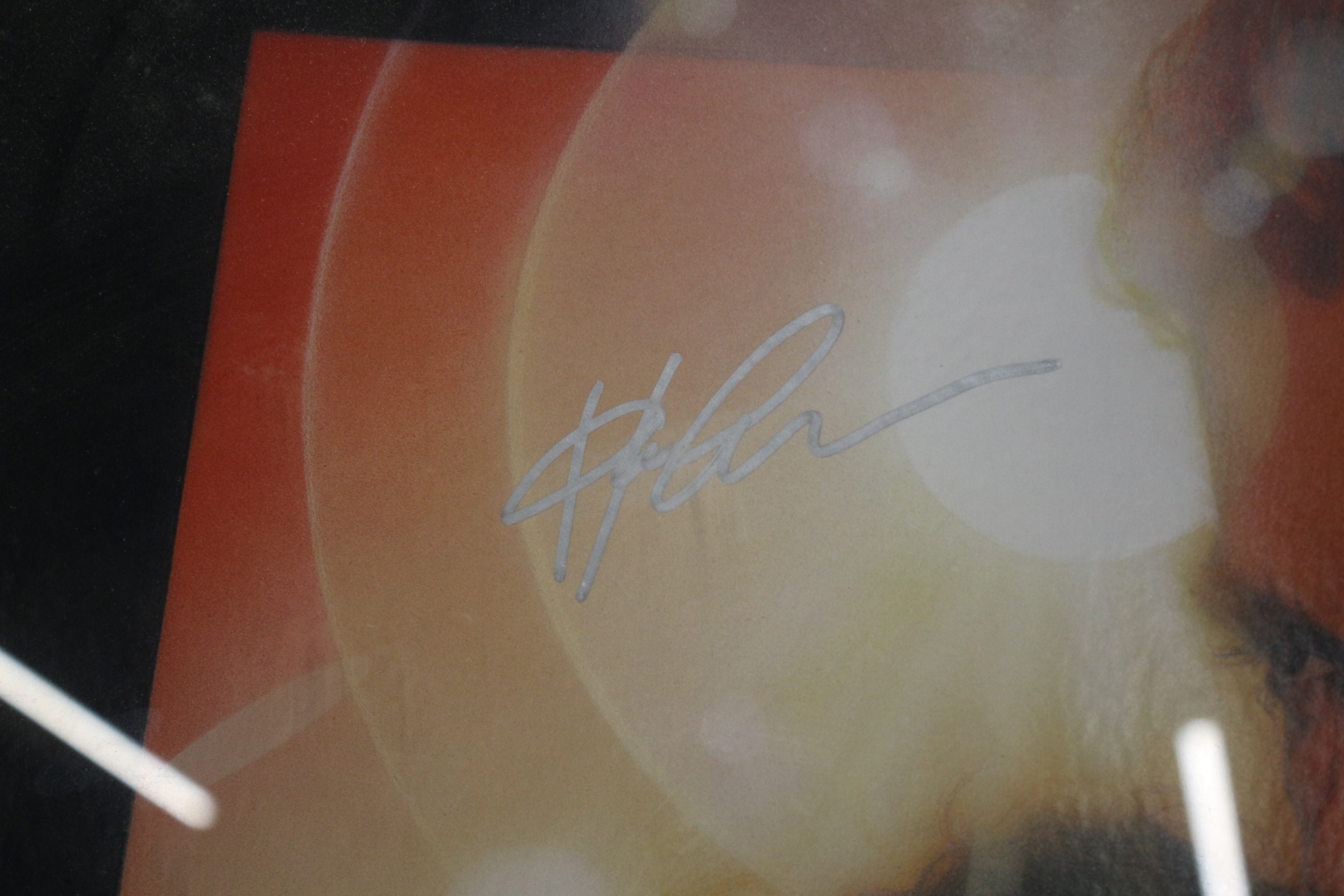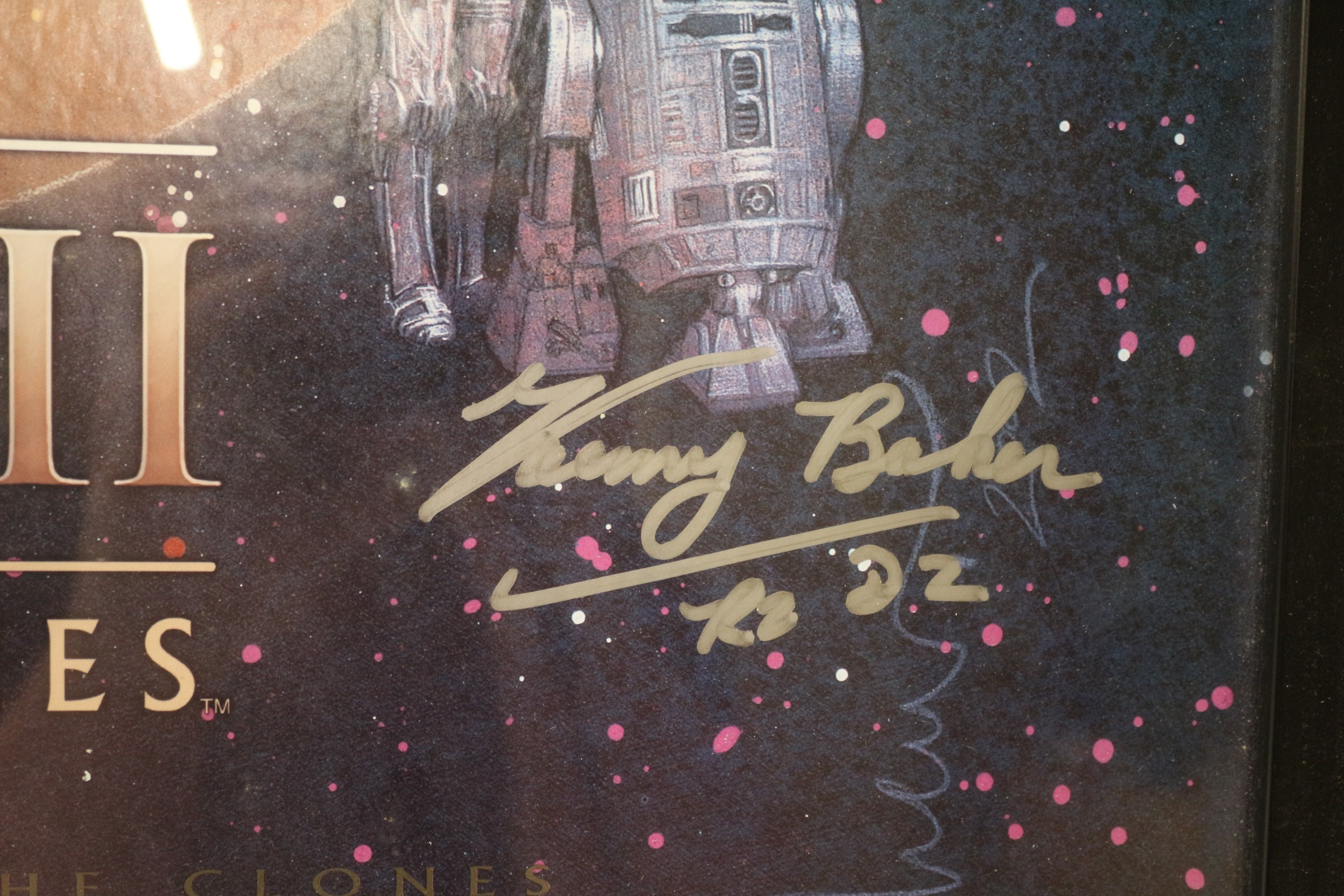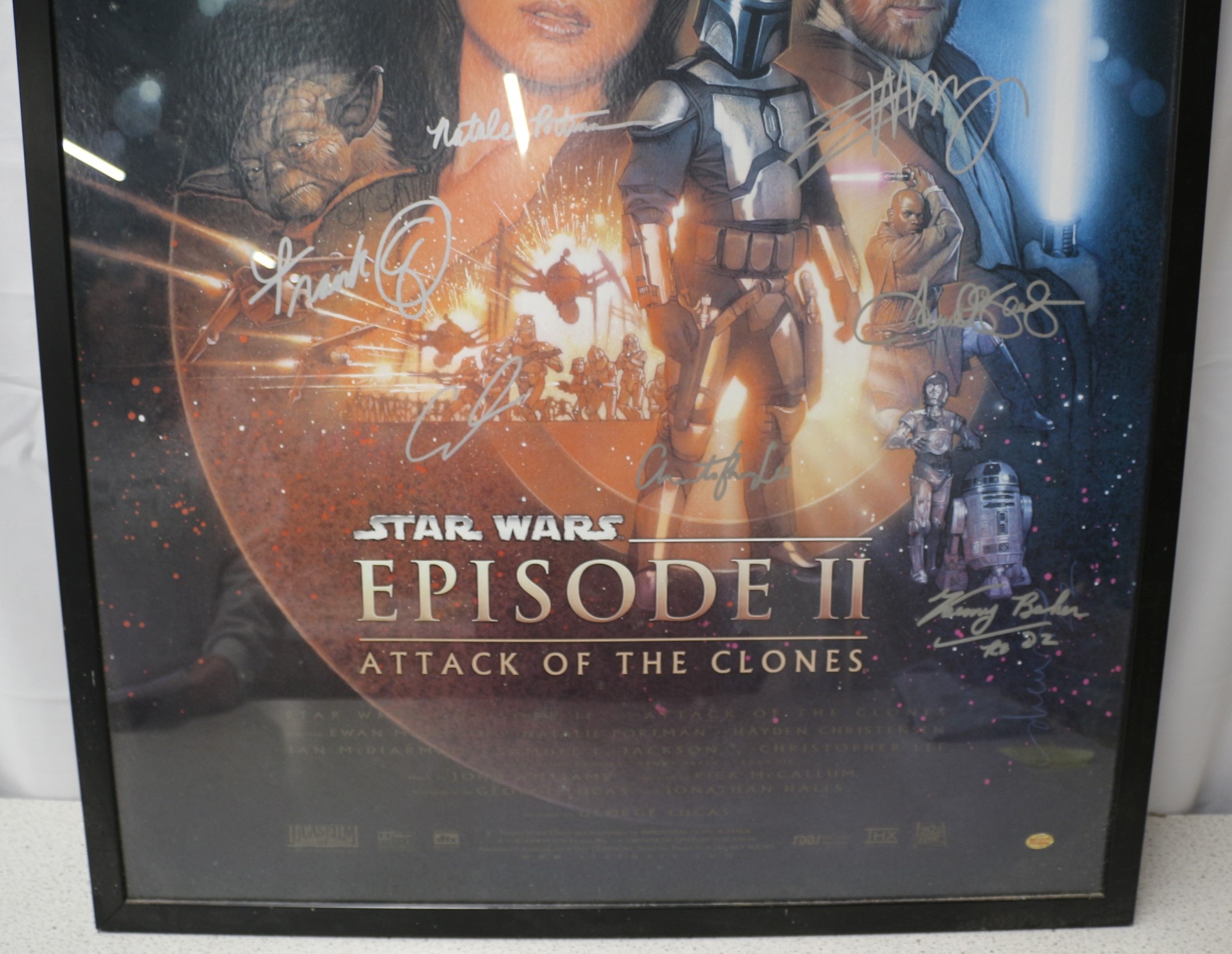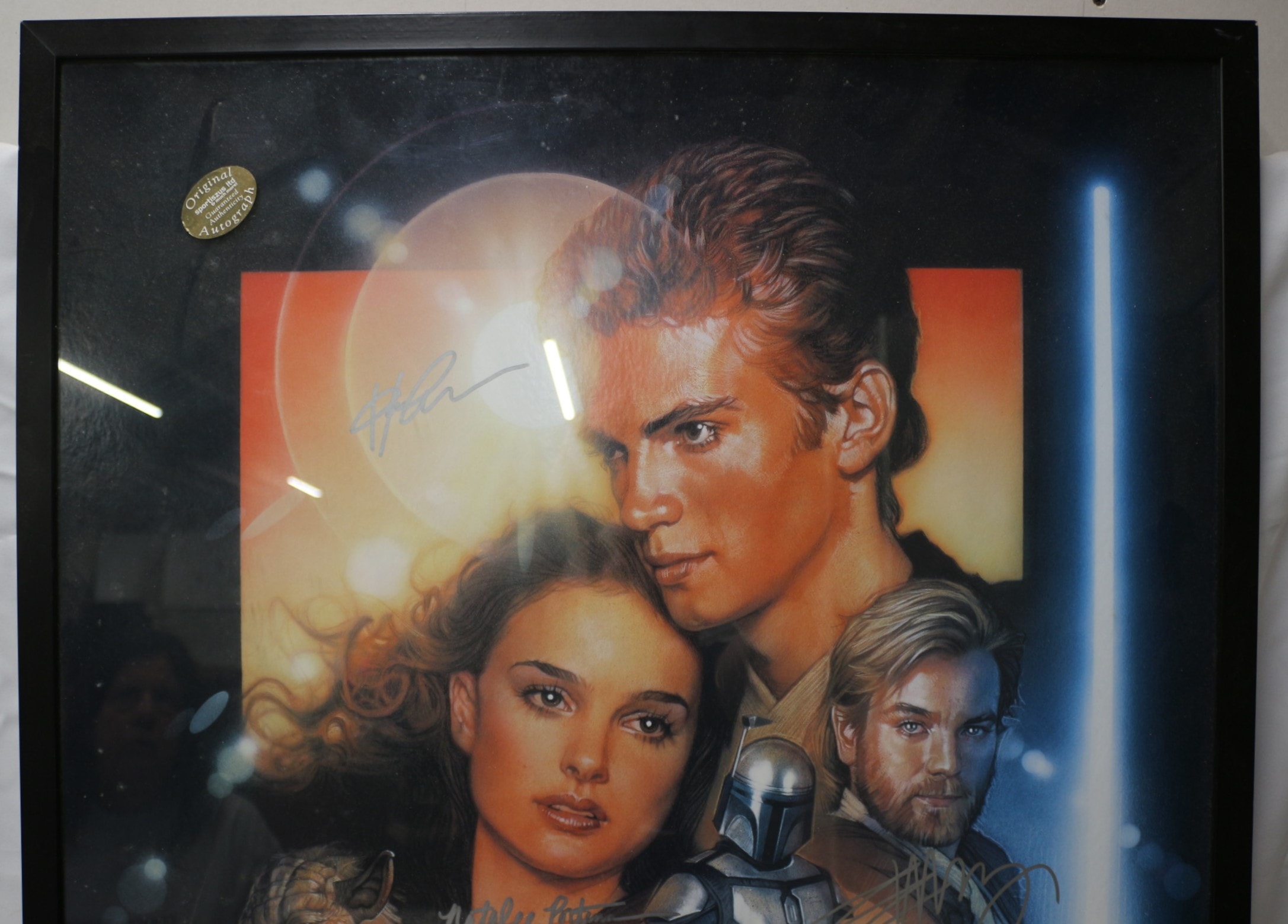 A framed movie poster for “Star Wars Episode II: Attack of the Clones, ” dating from 2002. The paper poster features a composite image of characters including Anakin Skywalker, Padmé Amidala, Obi-Wan Kenobi, Yoda, Mace Windu, Count Dooku, and R2-D2. It is protected under glass within a plain black frame. The poster bears multiple autographs in silver ink, identifiable as those of Hayden Christensen, Natalie Portman, Ewan McGregor, Samuel L. Jackson, Frank Oz, Christopher Lee, and Kenny Baker. A gold oval sticker on the front of the glass reads “Original Sportiszus Ltd & much more Guaranteed Authenticity Autograph.” A “Certificate of Authenticity” from Sportizus Limited is affixed to the reverse, bearing the unique identification number “TVA 11183” and an original retail price of £450. 72.5×105.5cm