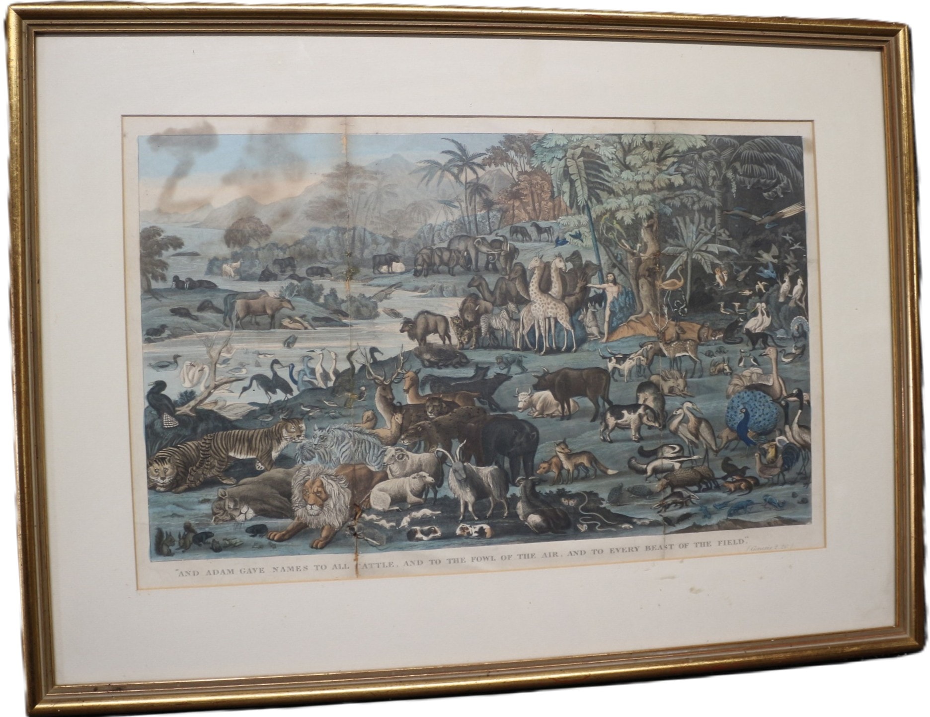 A print depicting Adam Naming the Creation, by Covens & Mortier/Corneille, originally published in Amsterdam circa 1685. This framed artwork features a vibrantly coloured print depicting a detailed biblical scene of Adam naming a multitude of animals within a verdant landscape, including elephants, giraffes, lions, tigers, and various fowl. The bottom border prominently displays the inscription “AND ADAM GAVE NAMES TO ALL CATTLE, AND TO THE FOWL OF THE AIR, AND TO EVERY BEAST OF THE FIELD.” with “(Genesis. 2. 20.)” noted in smaller script in the lower right corner. It is housed within a gilded wooden frame.