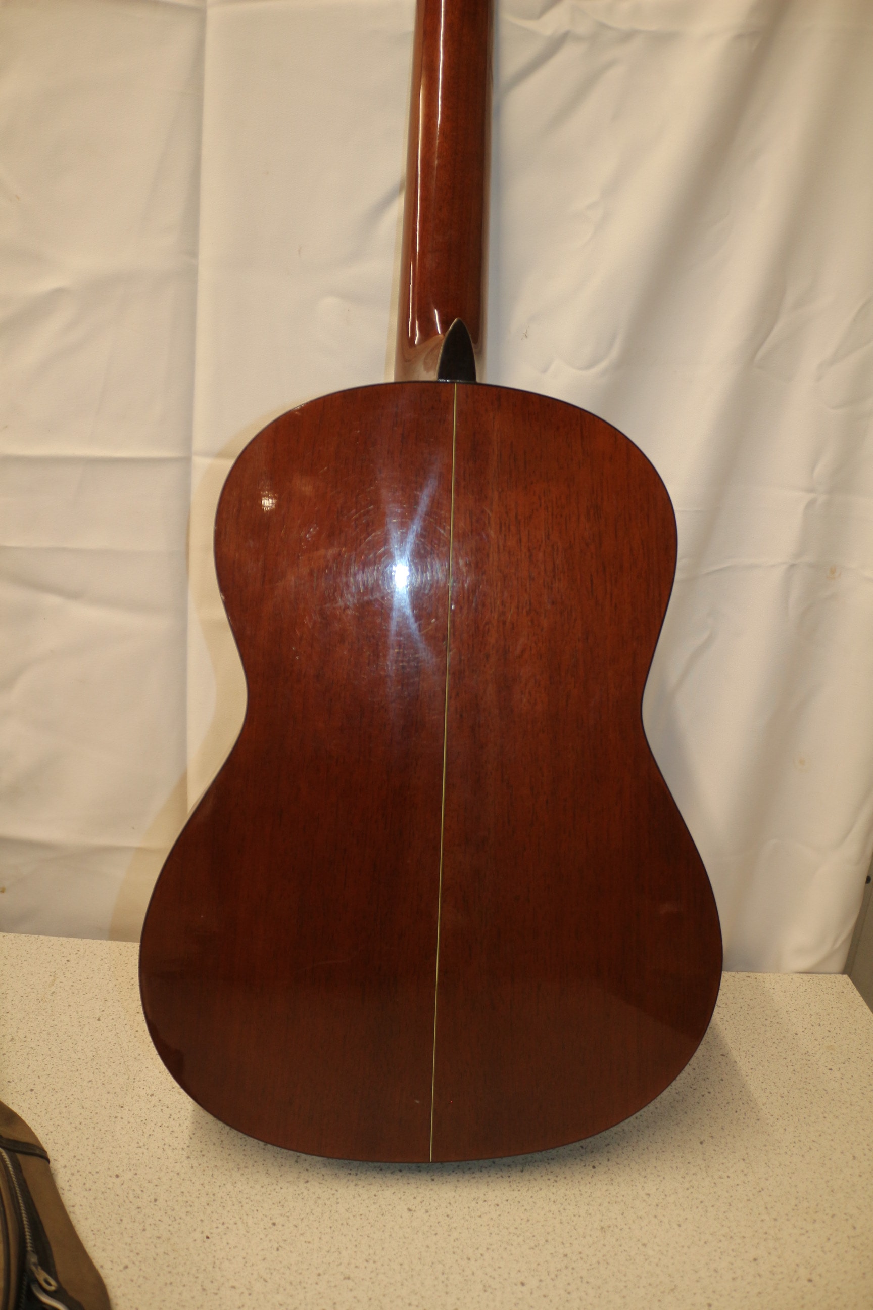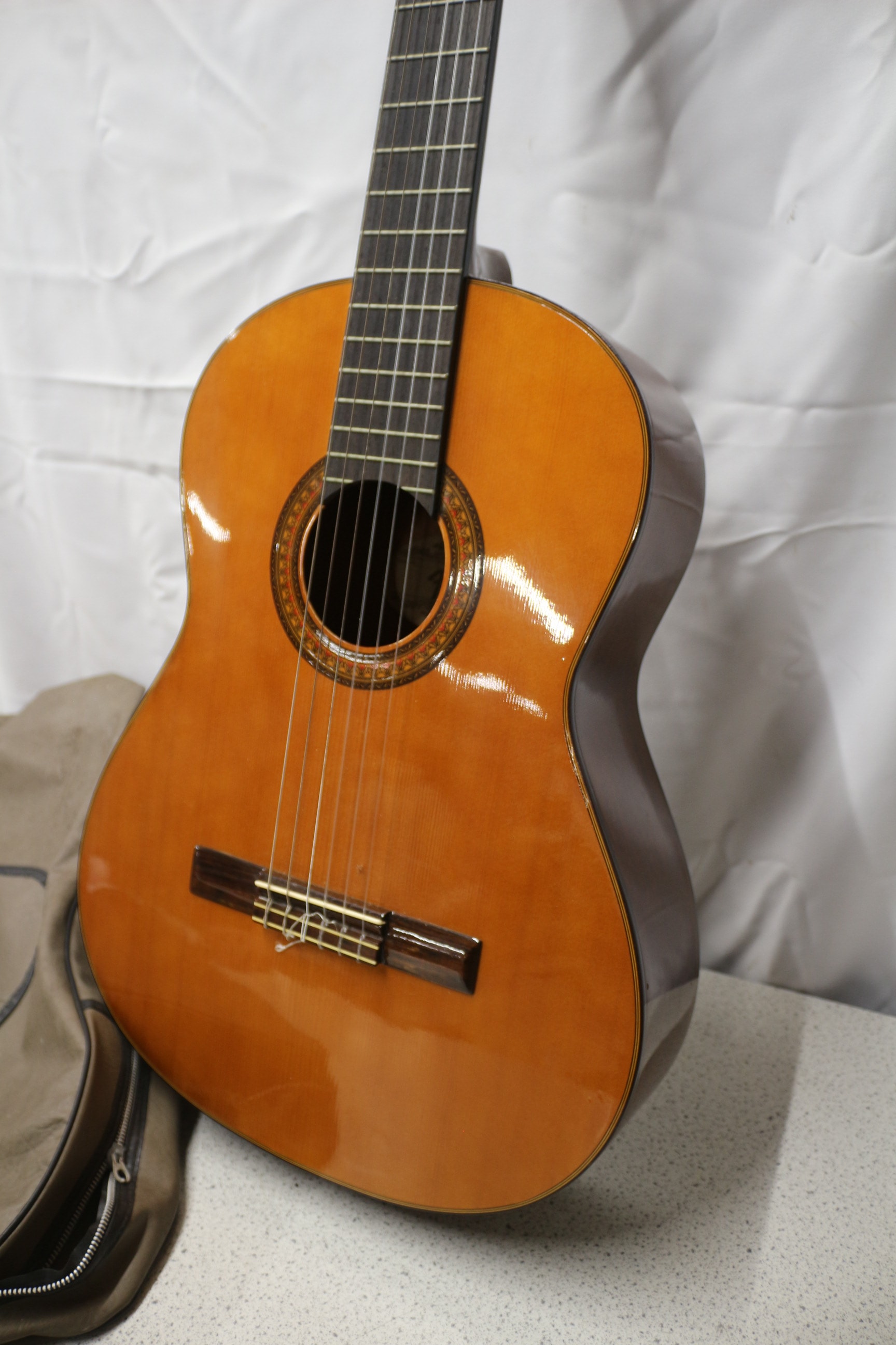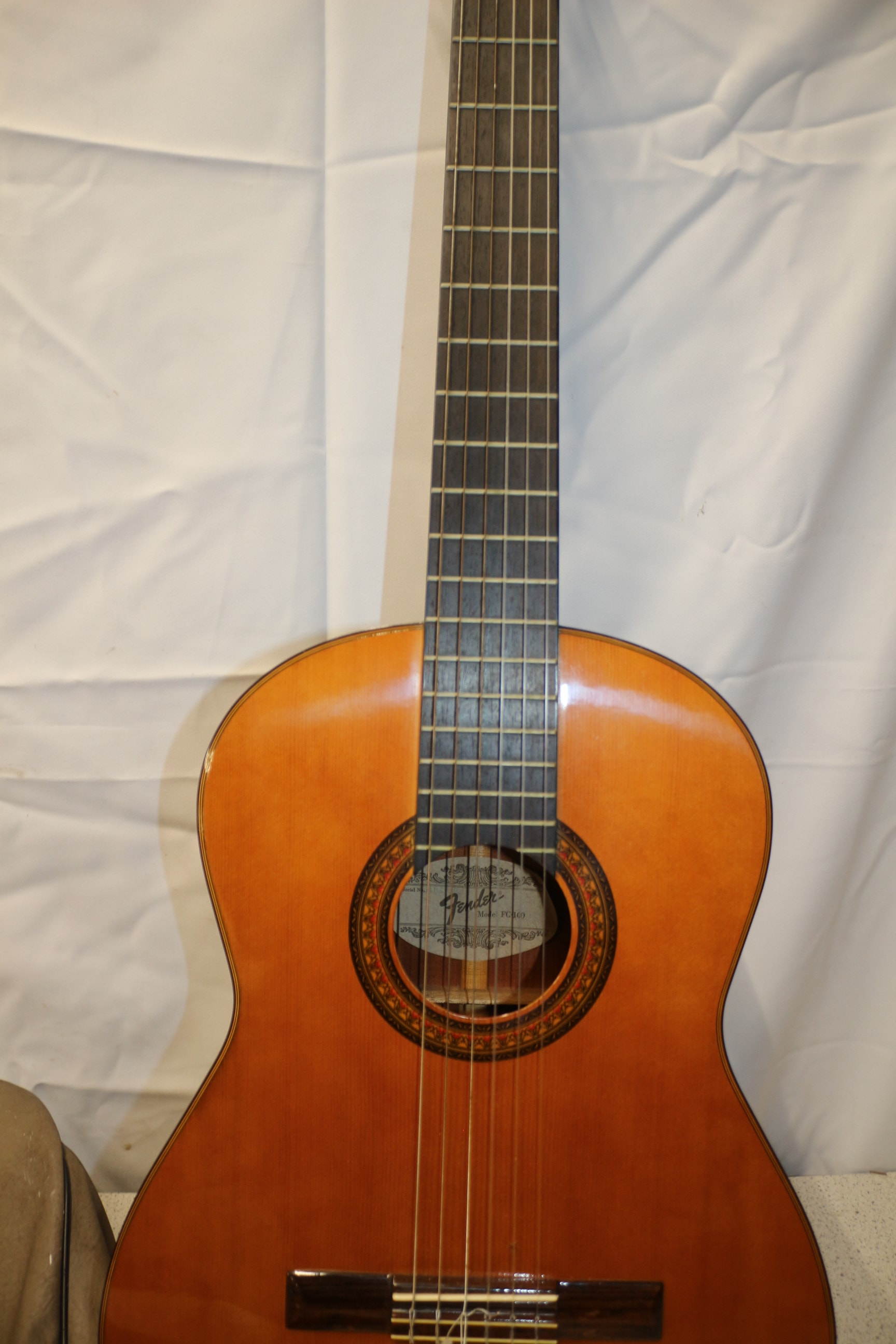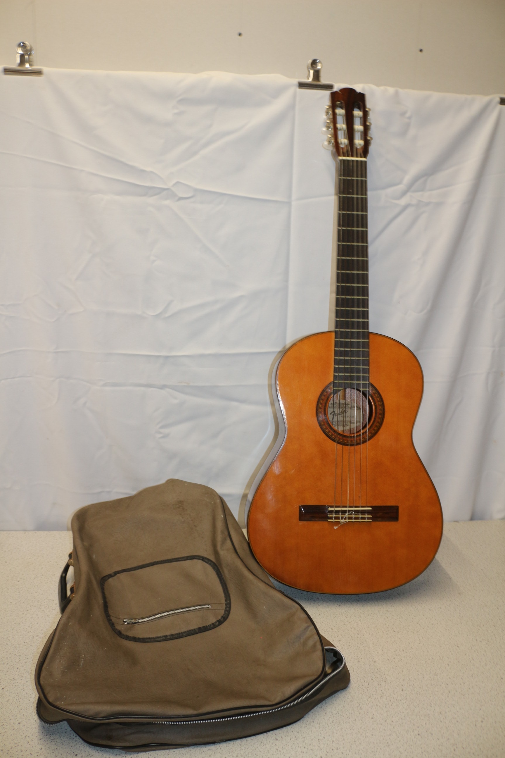 One brown/natural wood Fender Model FC-100 classical guitar, made in Korea, 1982-1988, with a dark brown/tan soft guitar case.