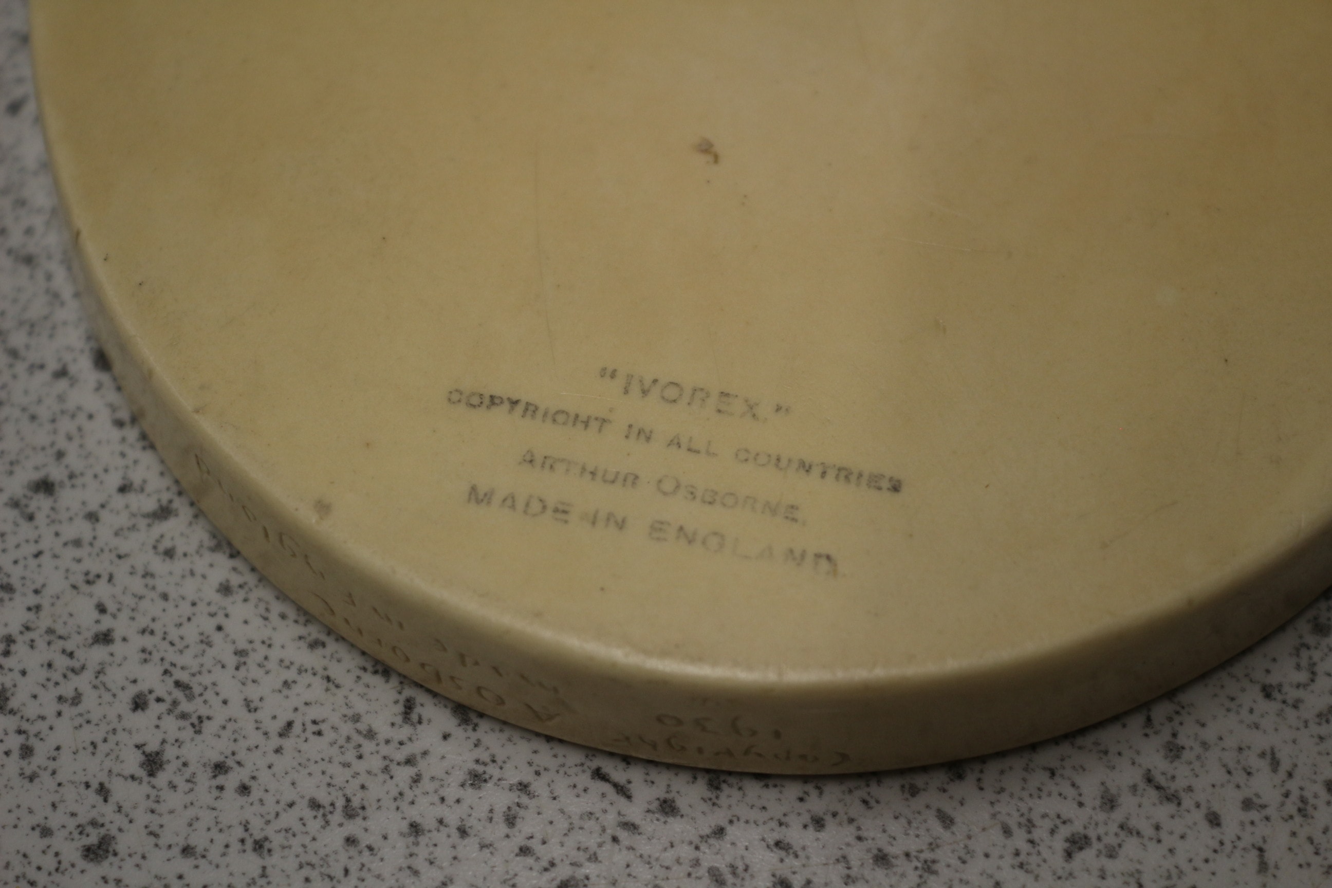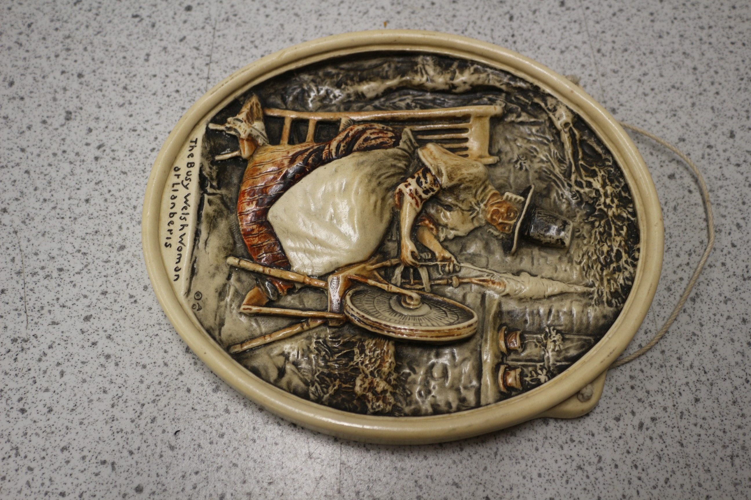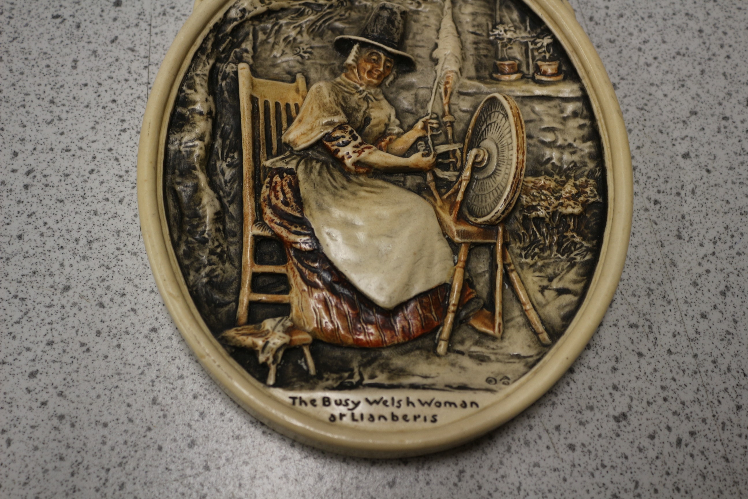 An Arthur Osborne Ivorex wall plaque, titled ‘The Busy Welsh Woman of Llanberis’. This oval-shaped decorative plaque, crafted from a molded composition material known as Ivorex, dates from the early 20th century, likely around 1930. The relief depicts a naturalistic genre scene of a smiling Welsh woman, dressed in traditional attire including a tall hat, seated and operating a spinning wheel within an interior setting with some outdoor elements visible. The front is inscribed “The Busy Welsh Woman of Llanberis, ” along with faint initials, possibly “G.S.” The reverse confirms its origin with the markings “IVOREX.”, “COPYRIGHT IN ALL COUNTRIES”, “ARTHUR OSBORNE”, and “MADE IN ENGLAND, ” accompanied by a faintly visible date, likely “1930,” along the edge. The plaque retains its original hanging cord. 17cm