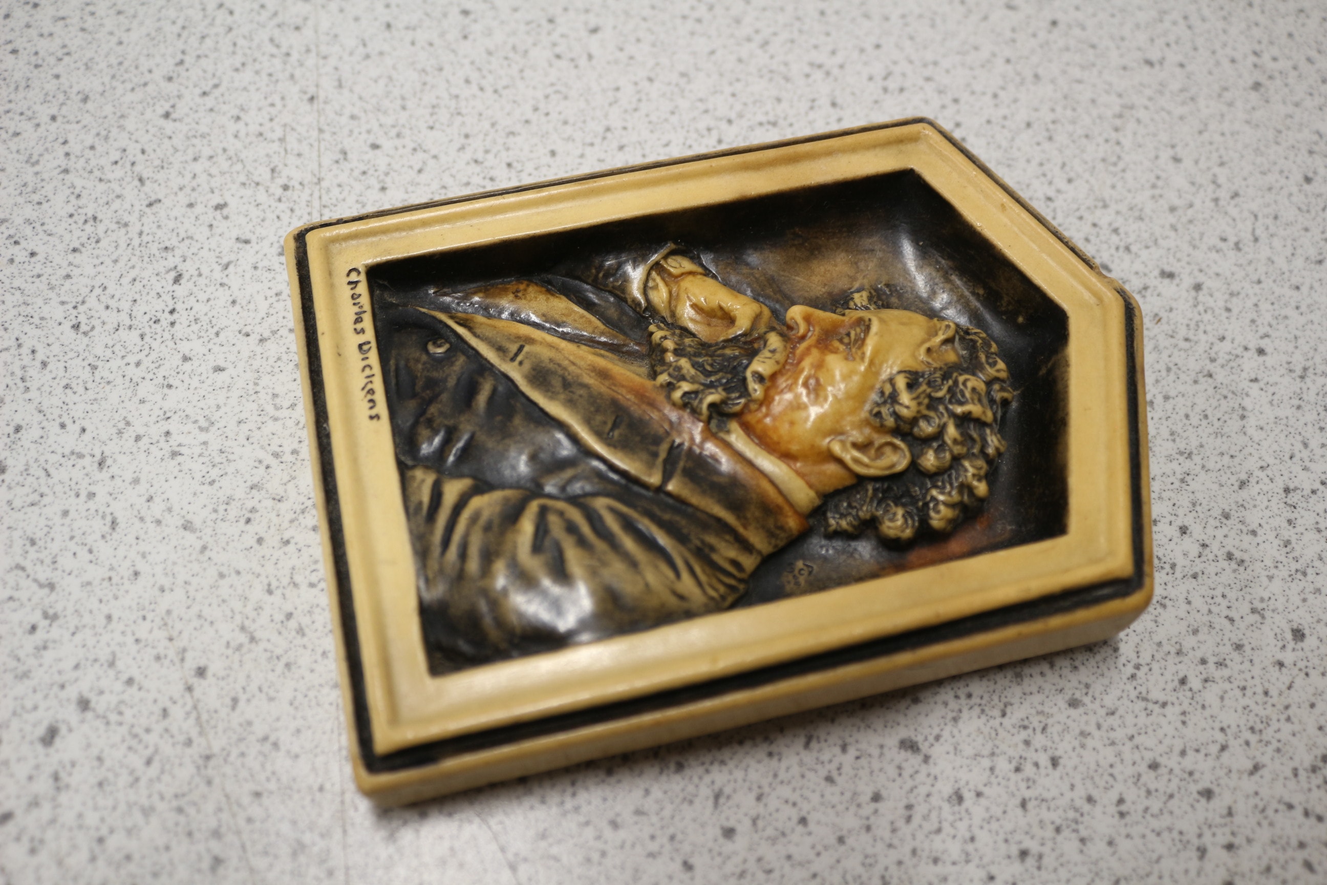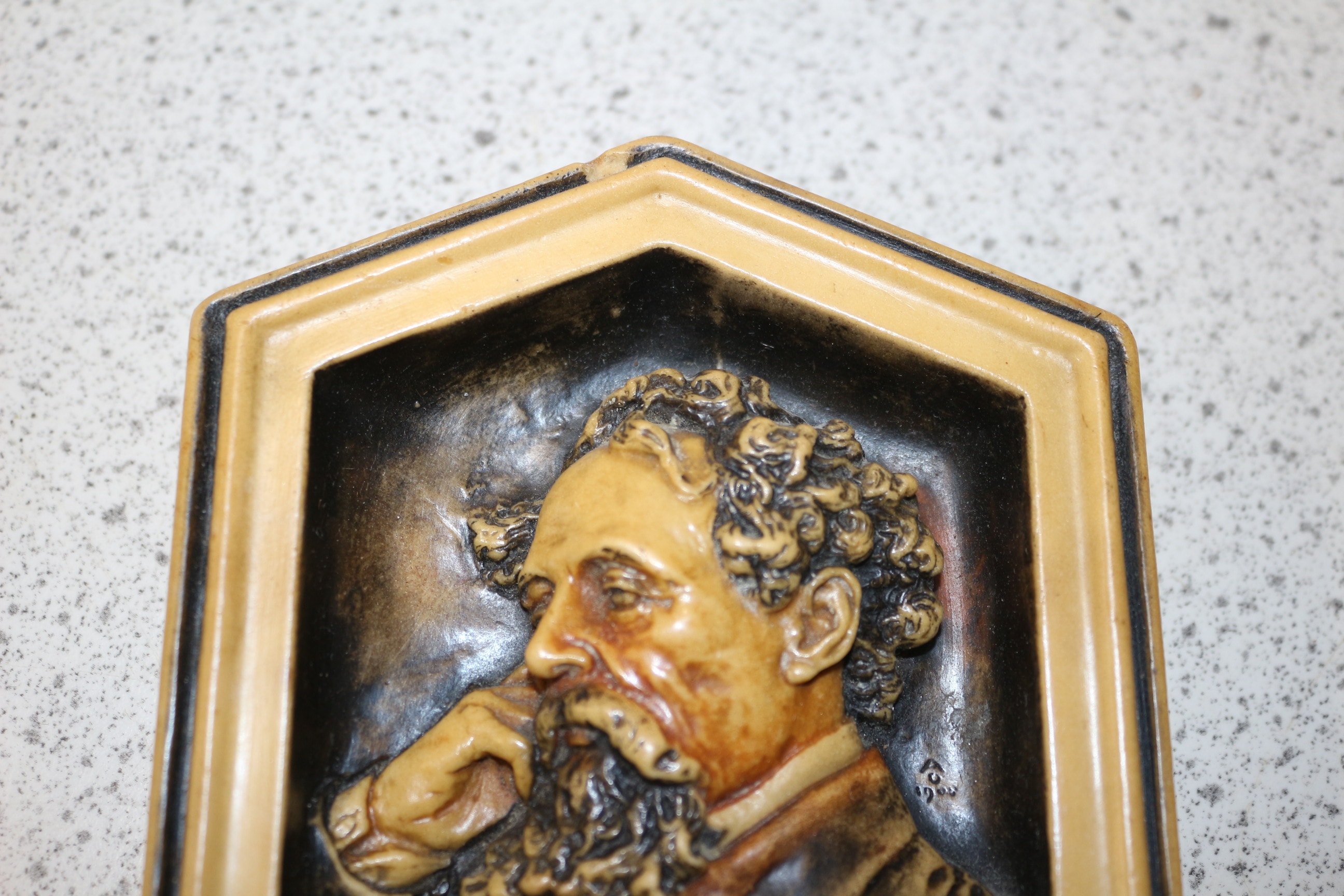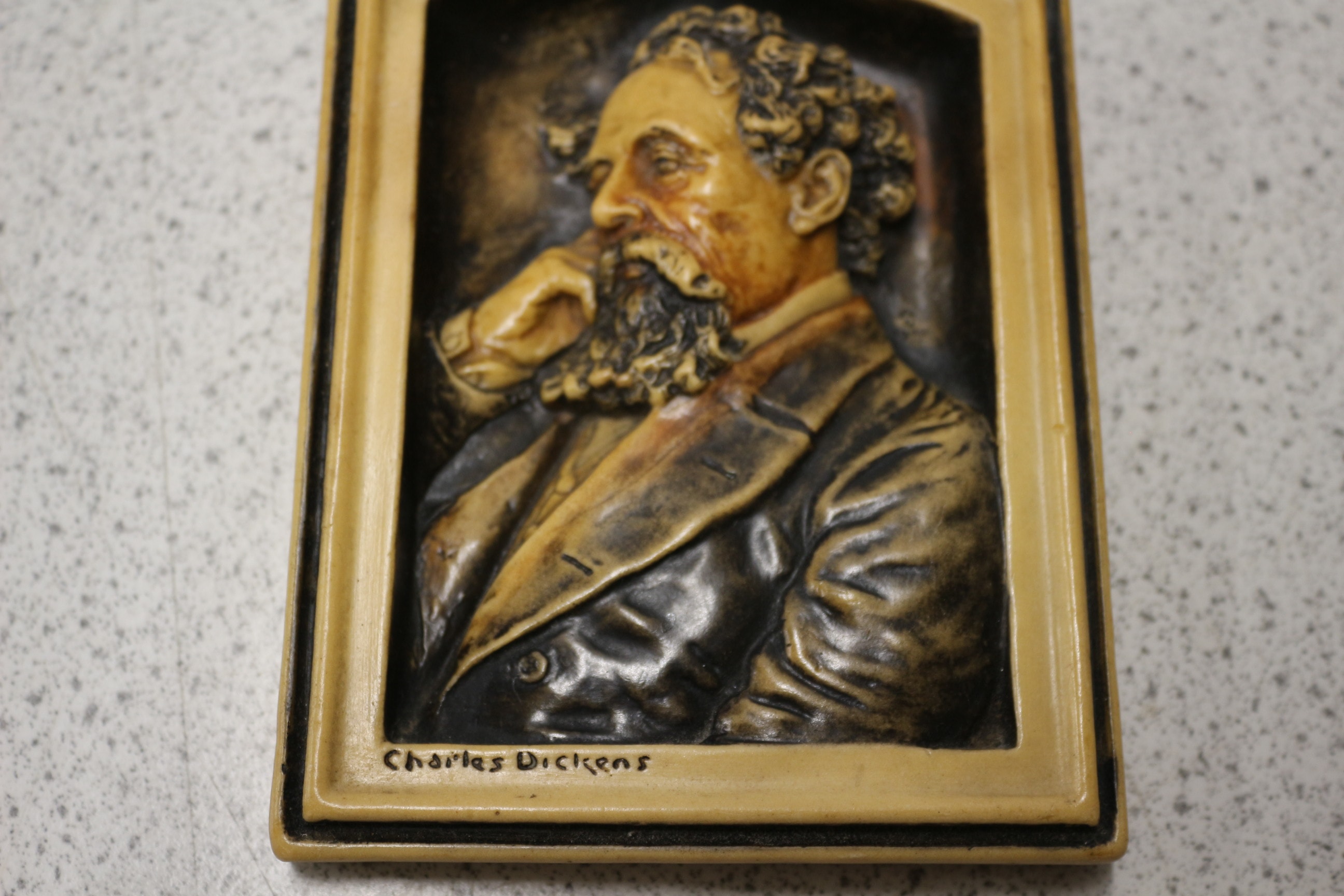 An Ivorex Osborne wall plaque depicting Charles Dickens. This rectangular molded resin or composite plaque features a high-relief portrait of a bearded man with curly hair, depicted in profile, dressed in formal attire, with his hand resting on his chin. The plaque is framed with an angled top, presenting a multi-toned, faux patinated finish in yellowish-cream, brown, and black hues. The name ‘Charles Dickens’ is inscribed in script at the bottom left of the relief, suggesting a Victorian or early 20th-century period. 14.5cm
