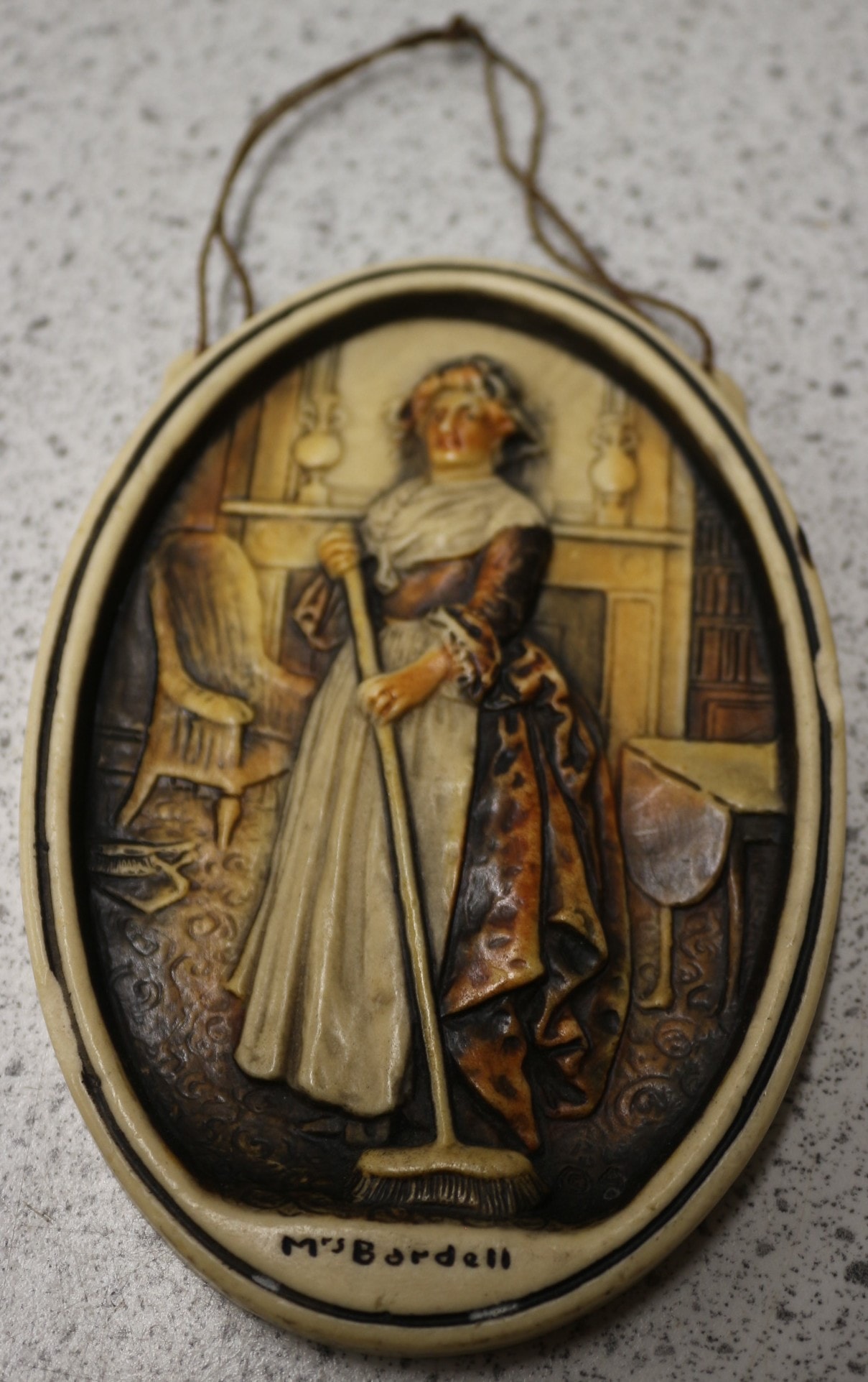 An Arthur Osborne Ivorex wall plaque depicting ‘Mrs. Bardell’ from Charles Dickens’ *The Pickwick Papers*. This oval-shaped, high-relief molded composite plaque features a genre scene of a woman in historical attire, holding a broom within a domestic interior, complete with a fireplace, chair, and table. The material has a creamy, bone-like finish with darker tones accentuating the relief details. The front lower edge is inscribed ‘M$^rs$ Bordell’. The reverse is impressed with ‘IVOREX’, ‘OSBORNE, ‘, ‘COPYRIGHT, ‘, ‘MADE IN ENGLAND, ‘, and ‘F. & C.O. BURNHAM, ENG.’. A braided cord is attached for hanging. 12.5cm
