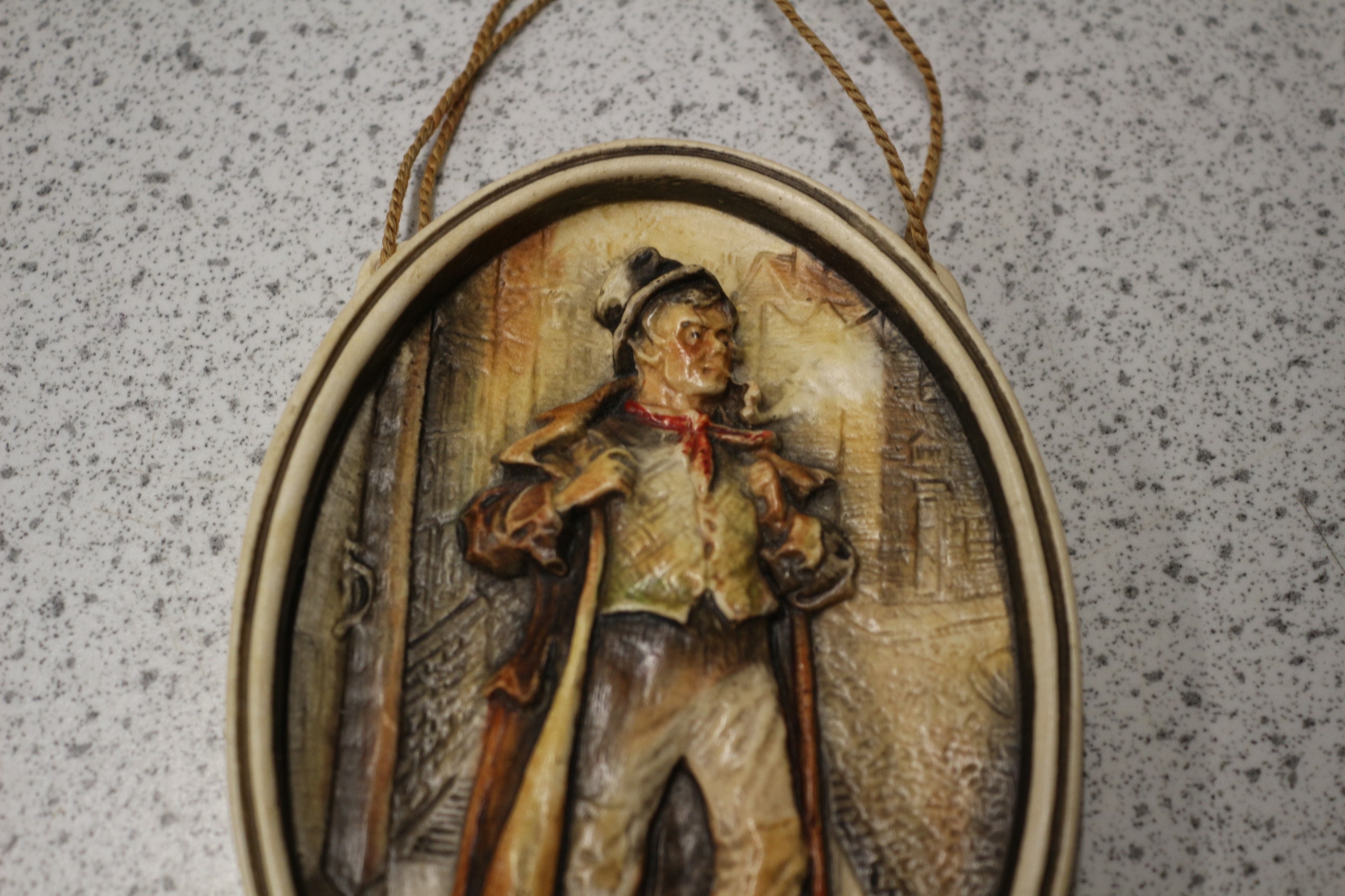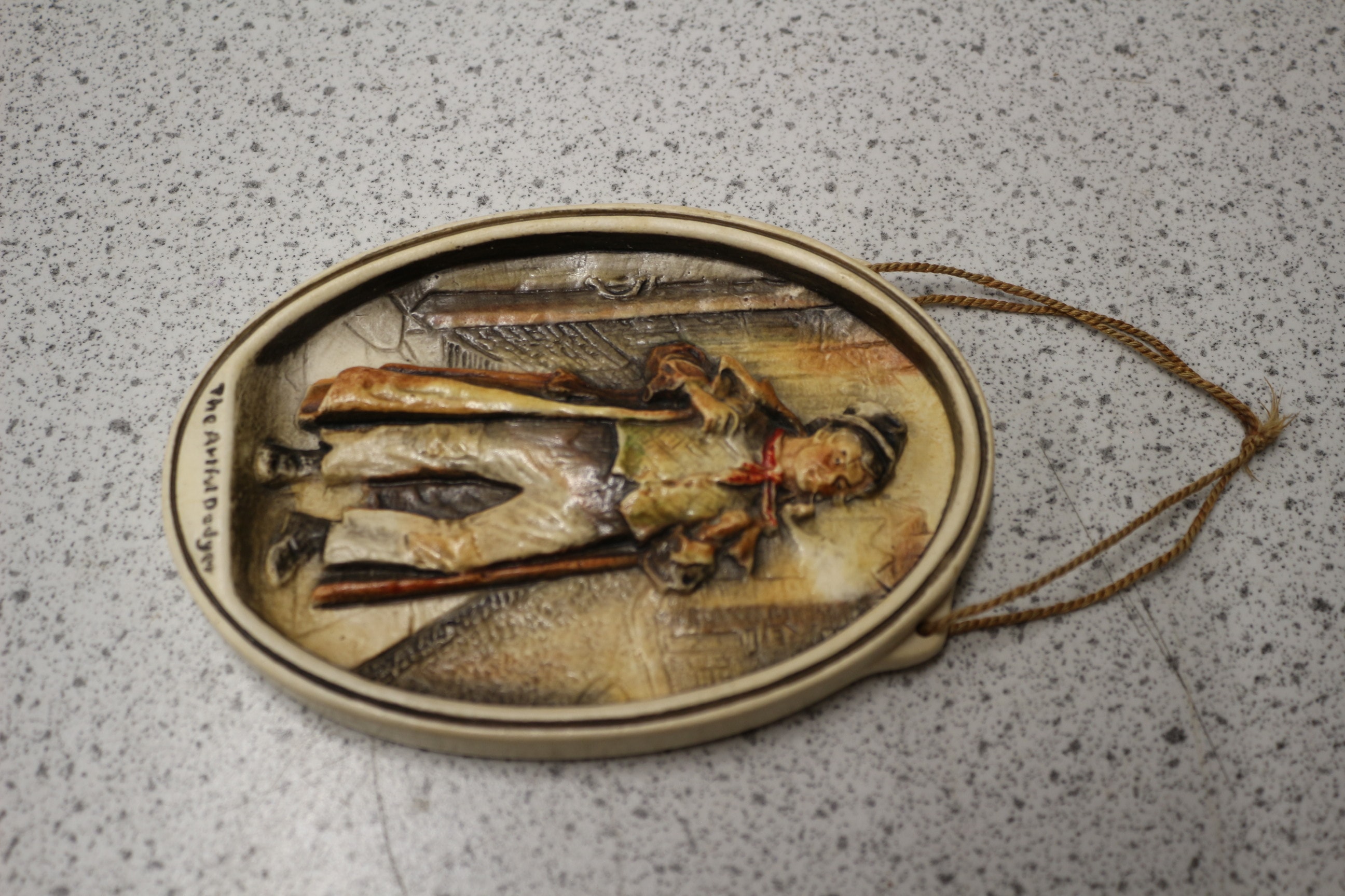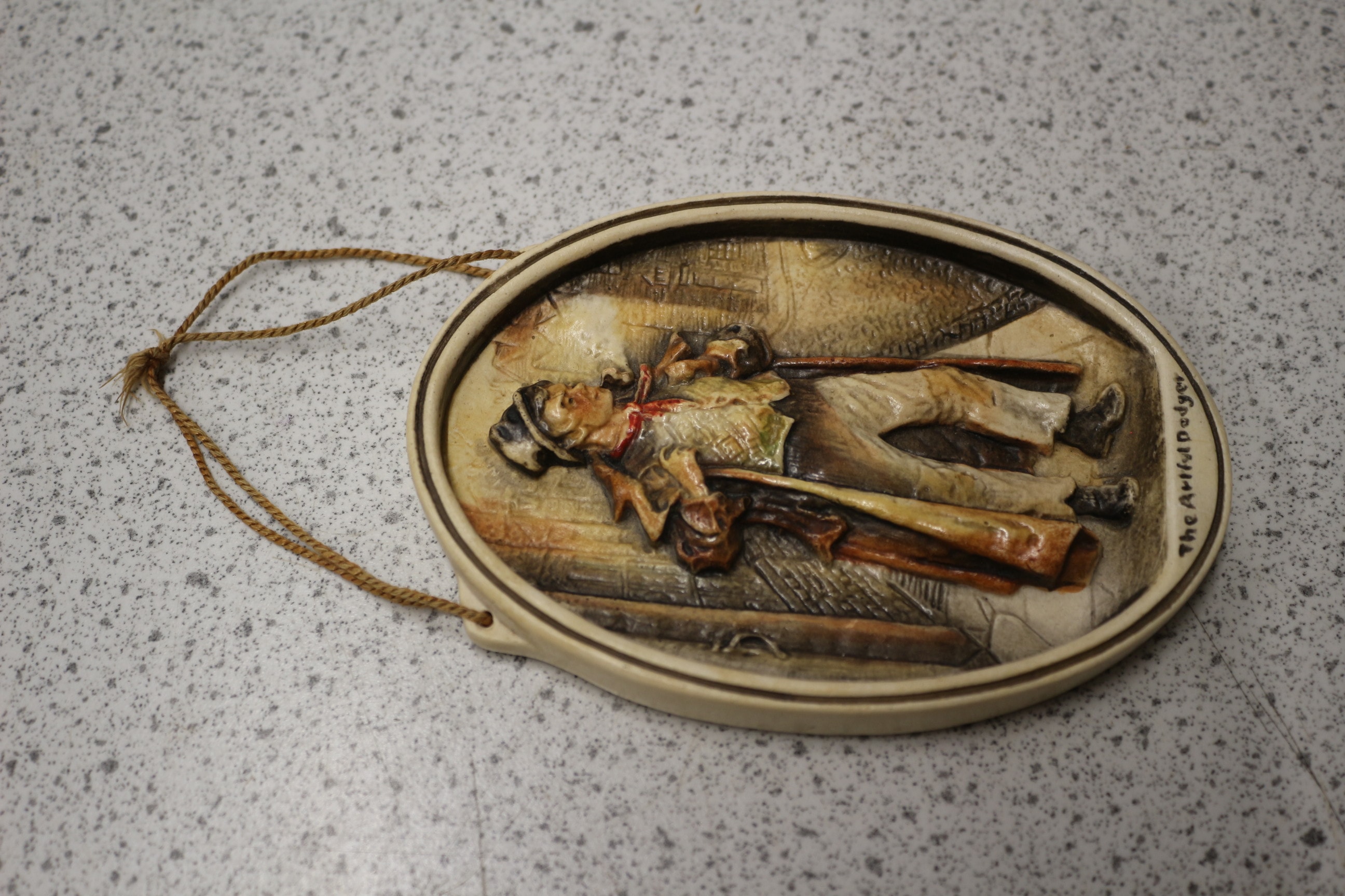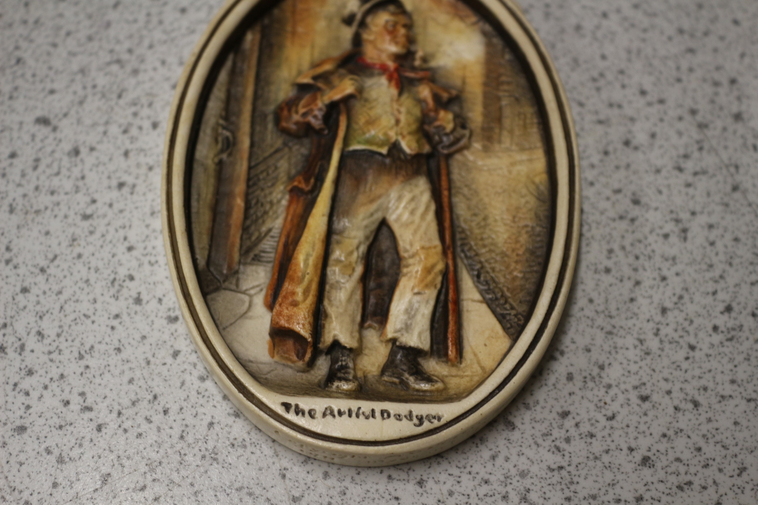 An Osborne Ivorex relief wall plaque depicting ‘The Artful Dodger’. This oval, hand-painted plaque is crafted from a composite material, likely plaster or resin, and features a three-dimensional representation of the character from Charles Dickens’ *Oliver Twist*. He is shown in period attire, wearing a hat, long coat, and waistcoat, and holding a pipe, against a textured background suggestive of an urban setting. The color palette primarily consists of earthy tones, including browns, creams, and ochres, with a touch of red on the figure’s cravat. A braided cord is attached at the top for hanging. The reverse side is stamped with the marks “IVOREX”, “OSBORNE-(COPYRIGHT)”, and “MADE & COLOURED BY HAND IN ENGLAND”. 12.5cm