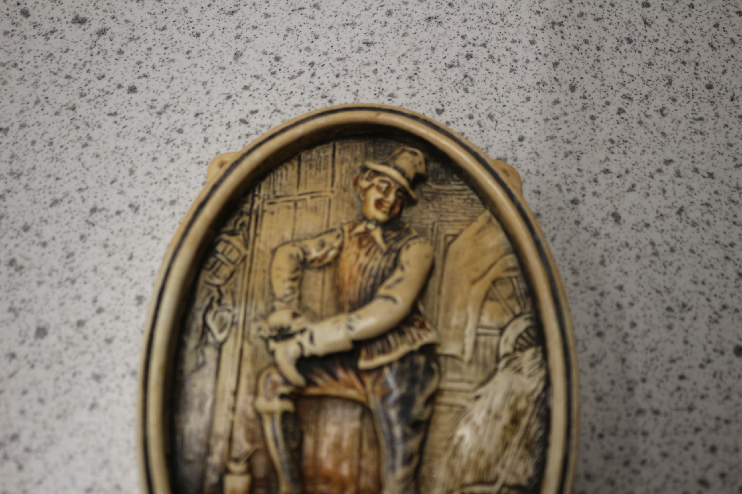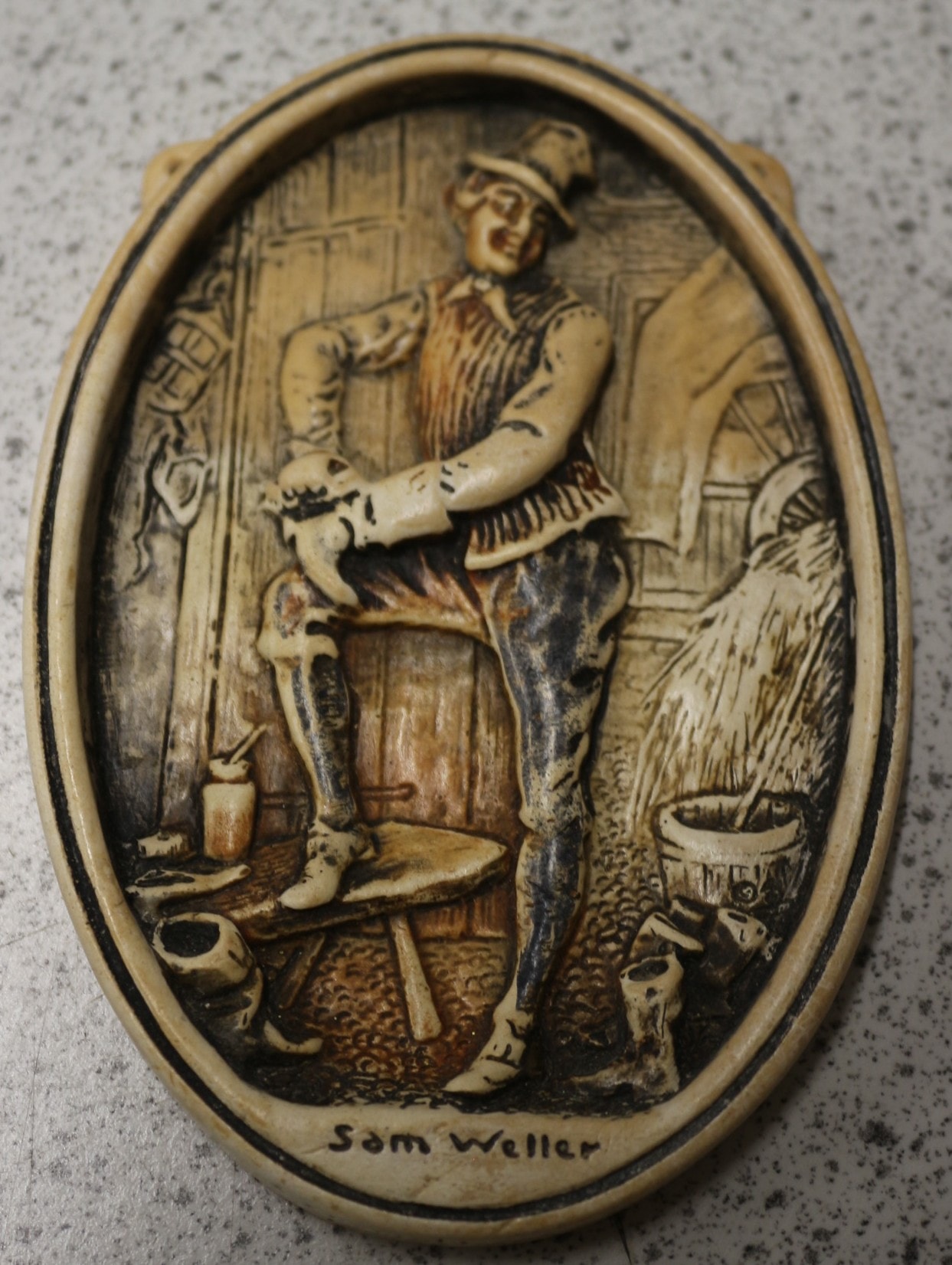 An Arthur Osborne Ivorex Plaque depicting ‘Sam Weller’. This oval, low-relief plaque is crafted from molded resin or a similar composite material, consistent with Ivorex production. It features a male figure, identified by the inscription “Sam Weller” at the bottom, dressed in 19th-century style attire. The figure is shown in a detailed interior scene, attending to a boot or shoe with one foot propped on a small stool. The plaque has a creamy off-white base with selective darker brown and blue patination, enhancing details and creating depth in an illustrative, period-specific decorative style. Two small holes are visible on the reverse, indicating it was designed for hanging. 12.5cm