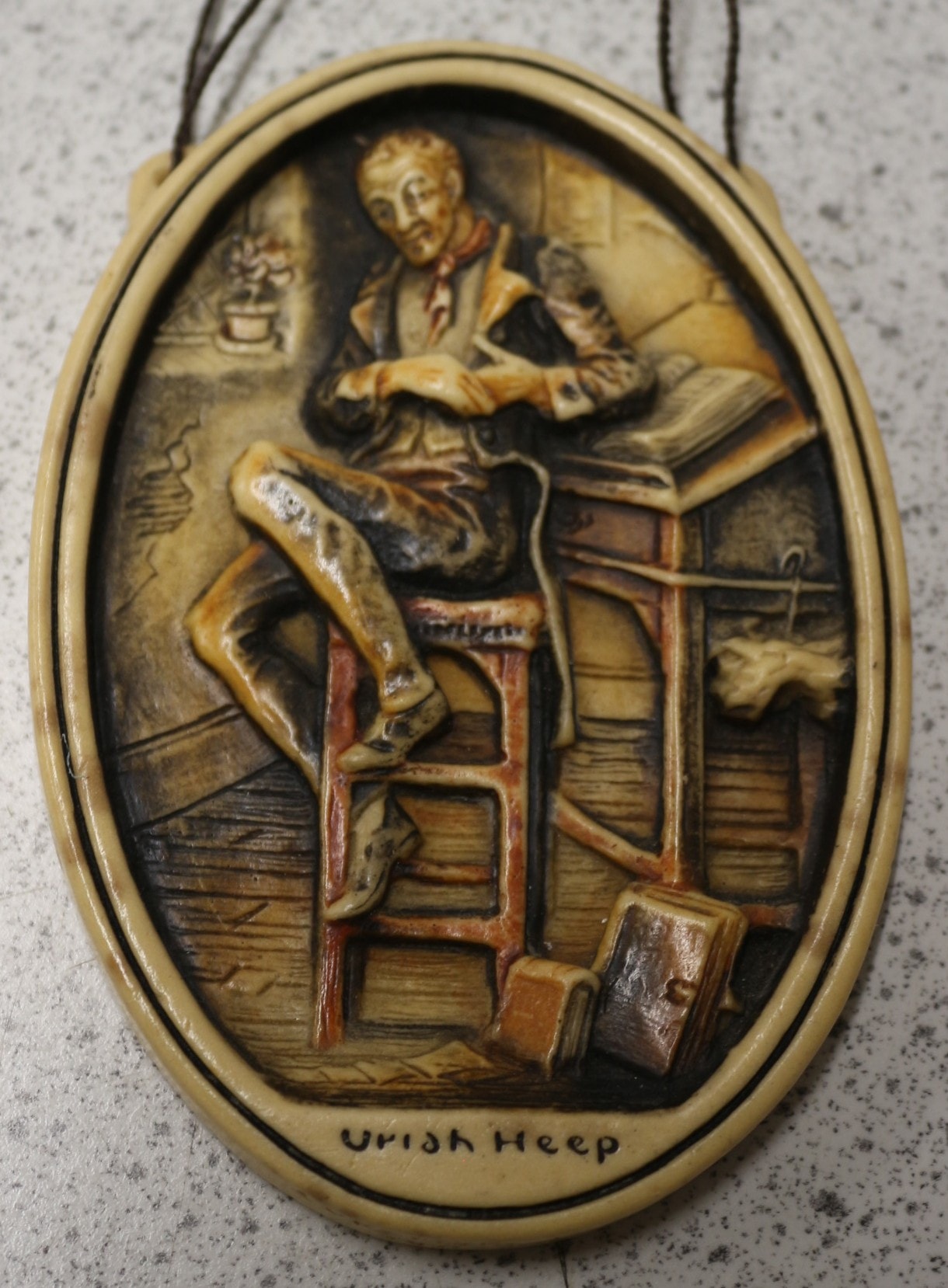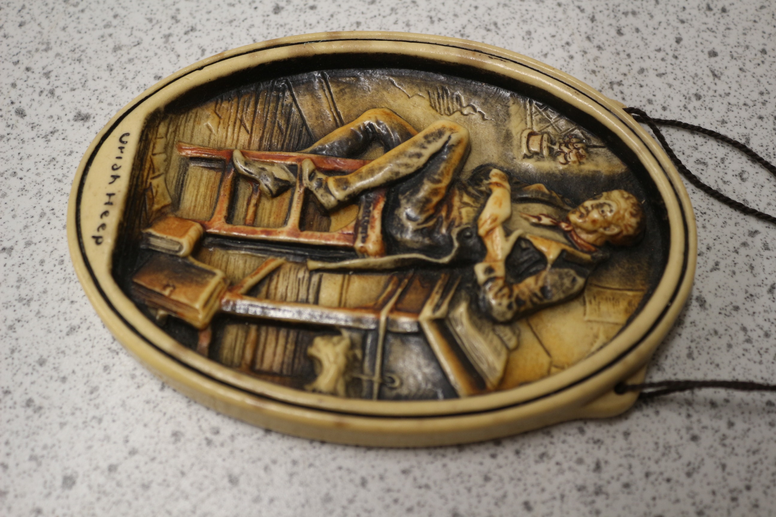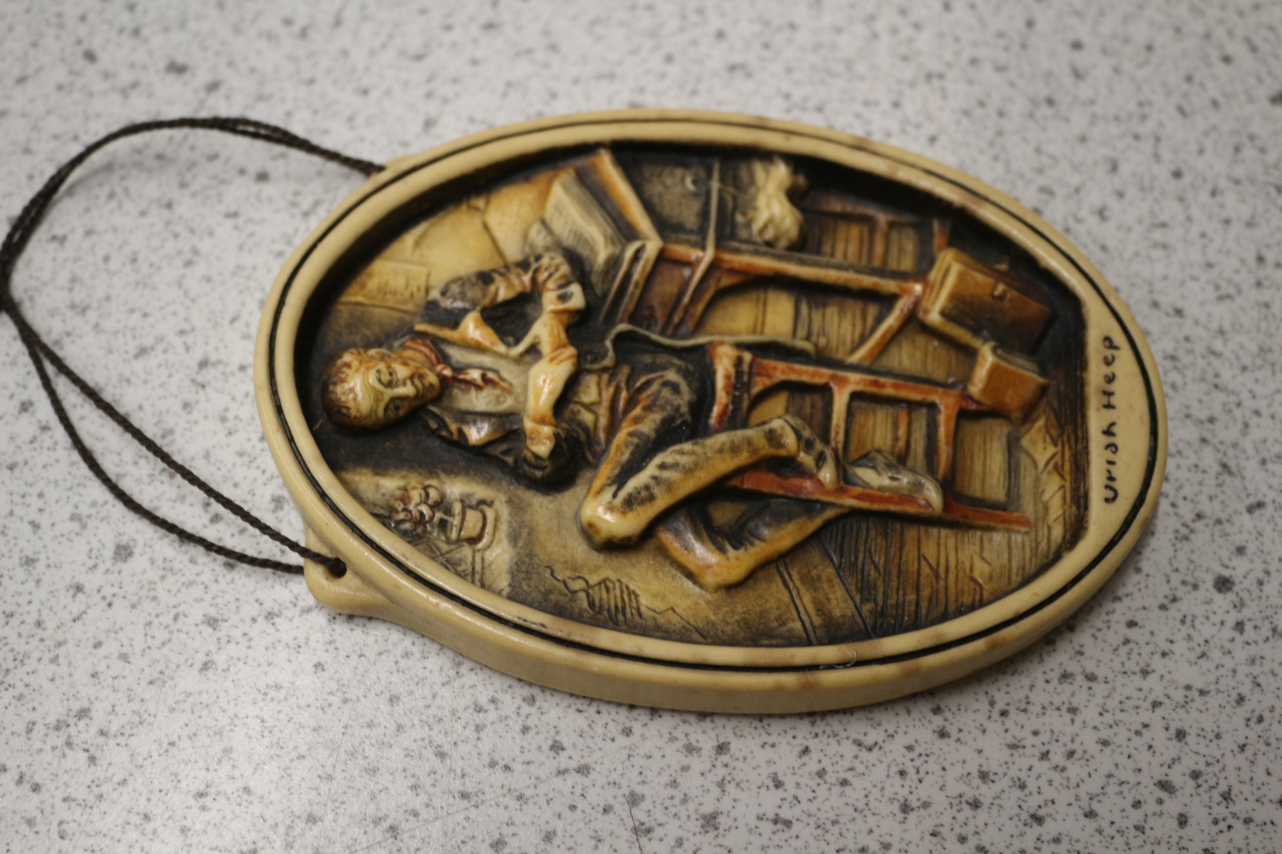 An Arthur Osborne Ivorex Charles Dickens ‘Uriah Heep’ wall plaque. This oval-shaped relief plaque is cast from resin or a similar composite material, designed as a wall hanging with an attached dark brown cord. The relief depicts a seated male figure, identified by the inscription “Uriah Heep” at the bottom, dressed in period attire and surrounded by books and furniture, suggesting a literary or scholarly scene. The plaque features a creamy base colour with intentional darker brown and reddish-brown staining to enhance detail and create an aged appearance. The visible text “Uriah Heep” refers to a character from Charles Dickens’ *David Copperfield*. The reverse bears a price sticker “£6.99” and faint impressed text which includes “MADE IN JAPAN.” 12.5cm