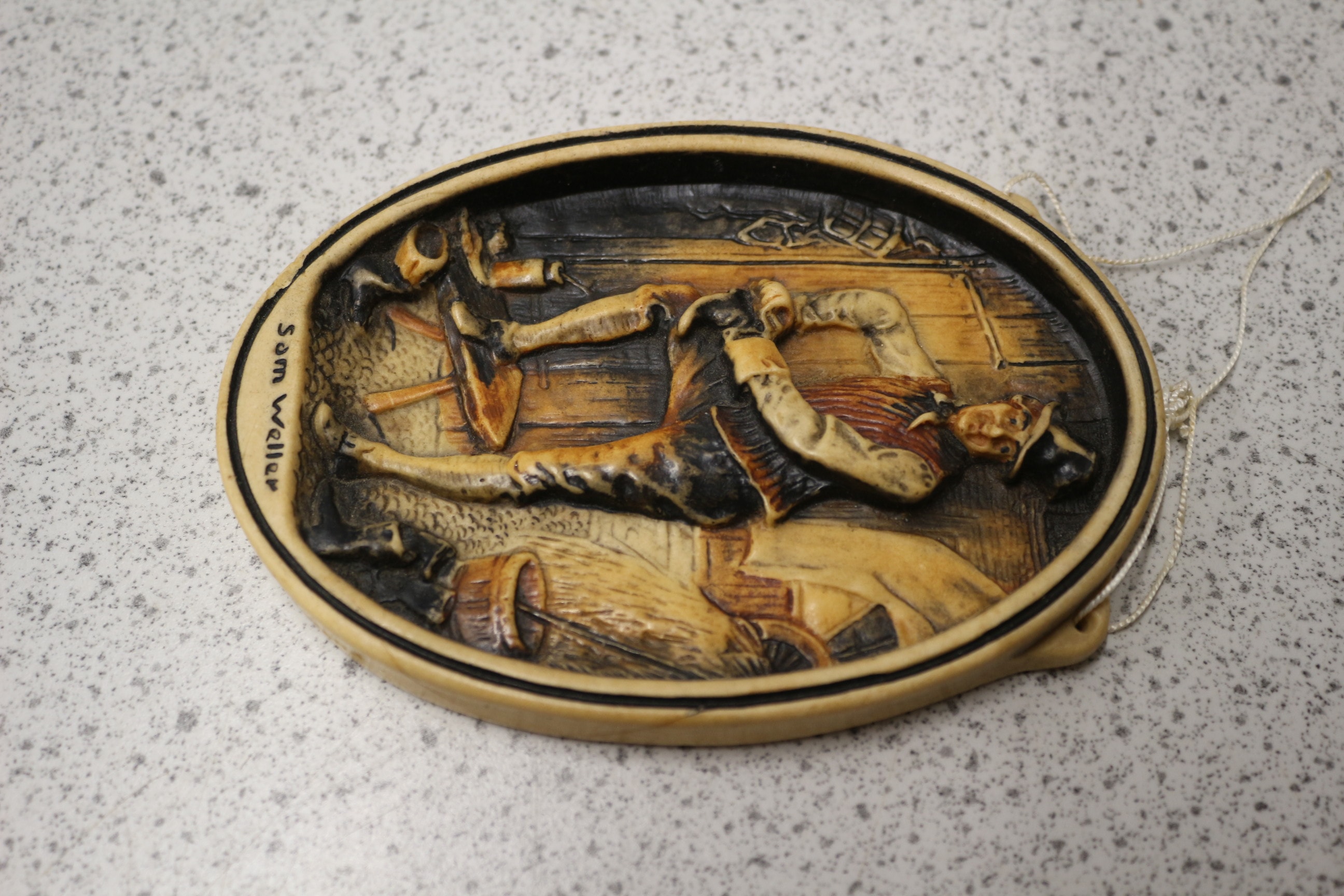 An Arthur Osborne Ivorex wall plaque, oval-shaped and featuring a high-relief molded scene. The plaque depicts a male figure, likely a shoemaker or cobbler, wearing traditional attire including a hat, waistcoat, and knee breeches, actively working on a shoe while seated on a stool within an interior workshop setting. The plaque exhibits a two-tone appearance, mimicking carved wood or aged resin, with darker recesses defining details and providing depth. In raised script along the bottom edge, the name “Sam Weller” is visible. A simple string hanger is attached at the top. 12.5cm