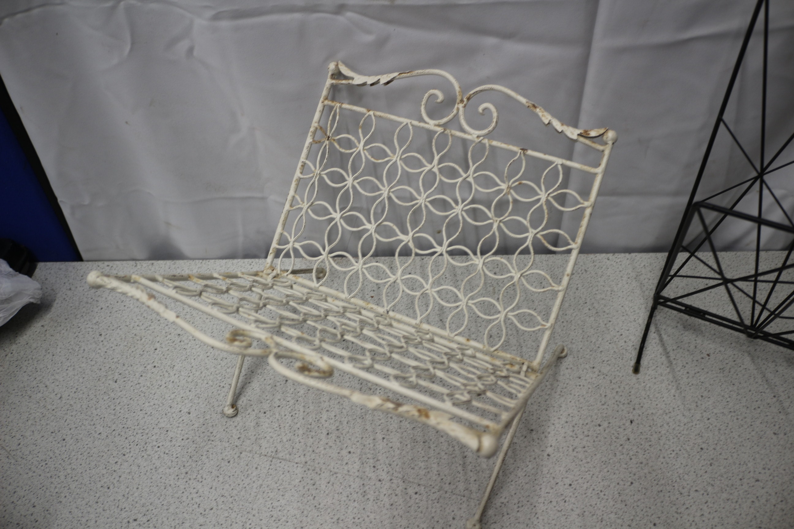 A pair of metal magazine racks, one an off-white/cream folding decorative stand with a quatrefoil pattern, and the other a black geometric wire magazine rack.