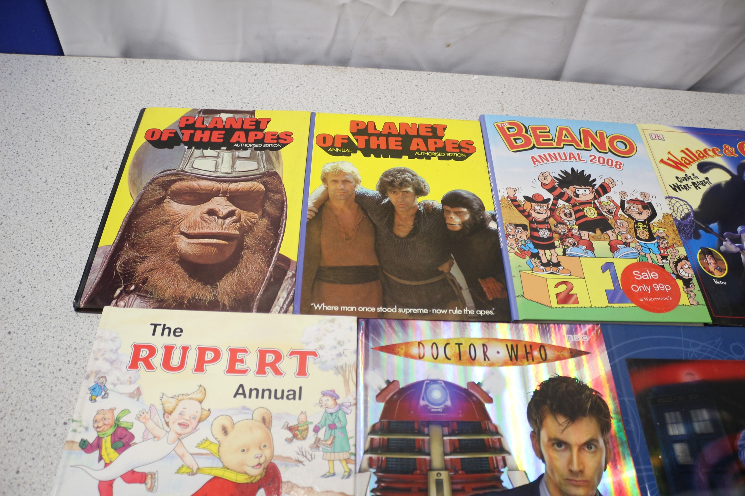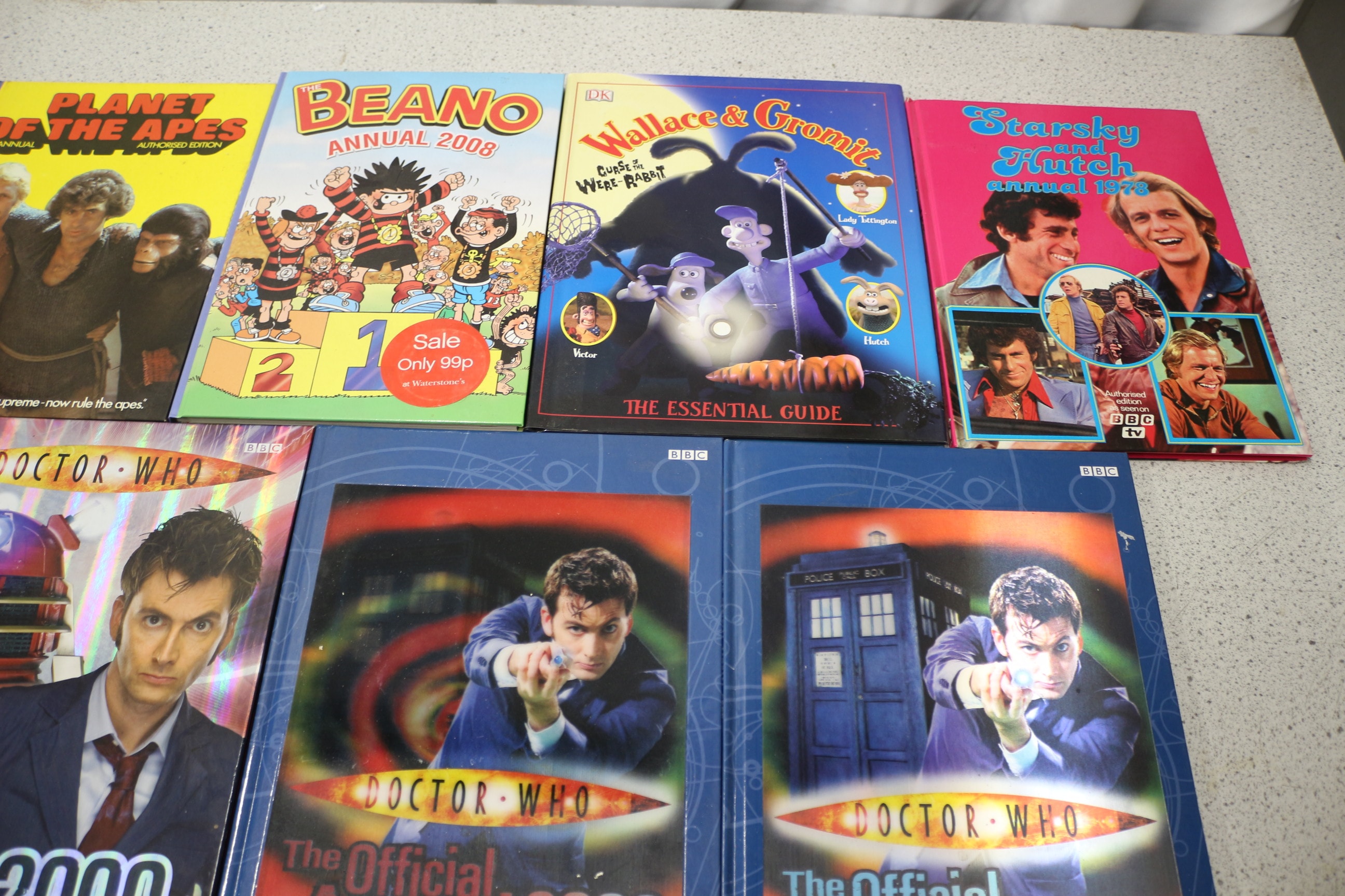 This lot comprises a collection of approximately 11 assorted hardcover annuals, spanning various popular culture franchises and publication periods. A significant portion of the collection consists of ‘Doctor Who The Official Annual’ editions for 2006, 2007, 2008, and 2009, published by BBC and Panini Books, often featuring the Ninth and Tenth Doctors. Other visible titles include ‘Planet of the Apes Annual’ (Authorized Edition), ‘Beano Annual 2008,’ ‘Wallace & Gromit The Essential Guide, ‘ ‘Starsky & Hutch Annual 1978,’ and ‘The Rupert Annual.’ Several annuals, including ‘Beano’ and ‘Doctor Who, ‘ retain original ‘Sale Only 99p at Woolworth’s’ promotional stickers.