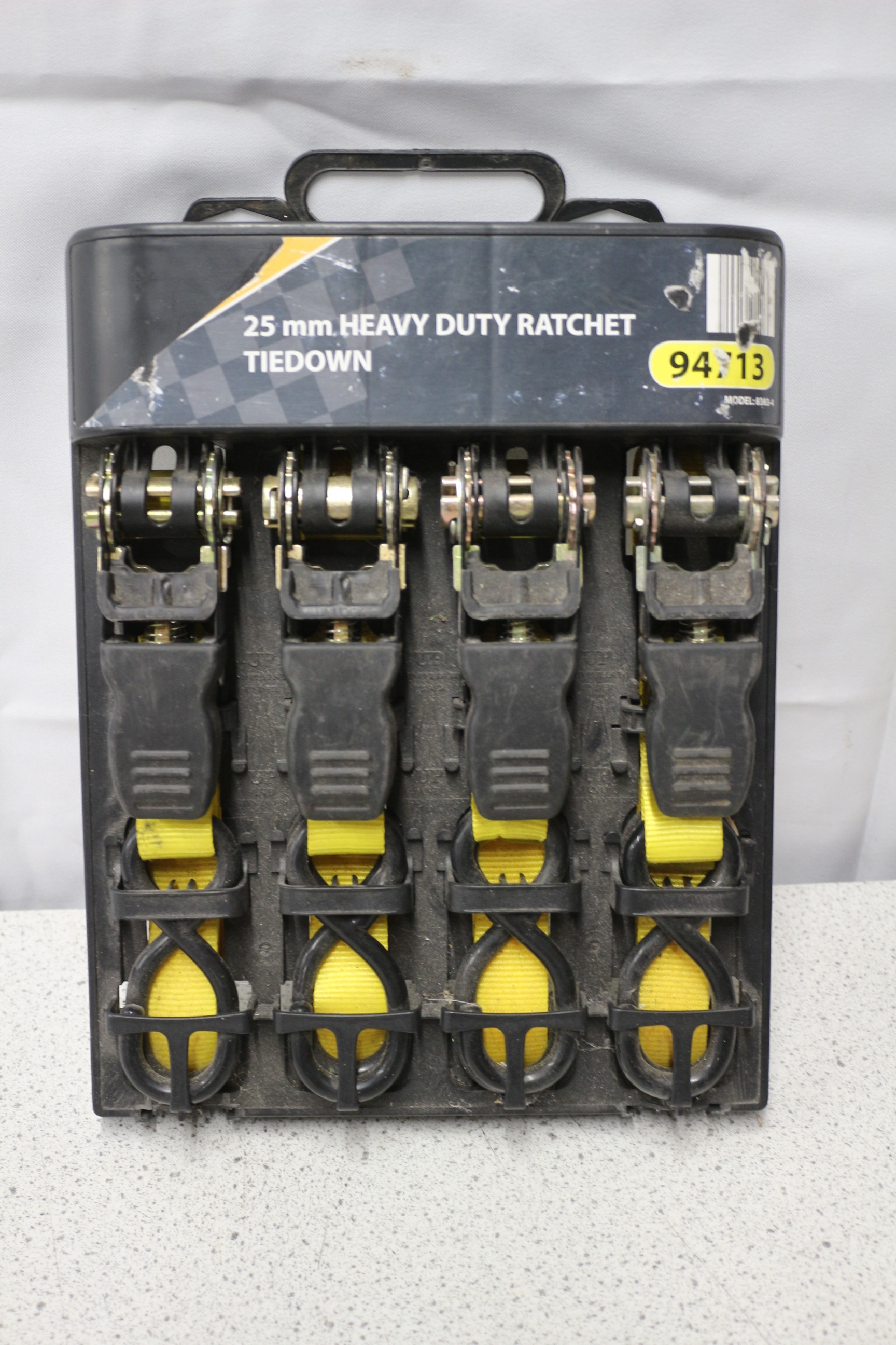A set of four CargoLoc 25mm Heavy Duty Ratchet Tiedown Straps, Model 8383-4. Each tiedown consists of a metal ratchet mechanism, black plastic buckle components, and a bright yellow woven textile strap. The straps are presented in their original black plastic retail packaging with a carrying handle, appearing unused and factory-packed within molded compartments. The packaging also displays ‘94.13’ and a barcode.