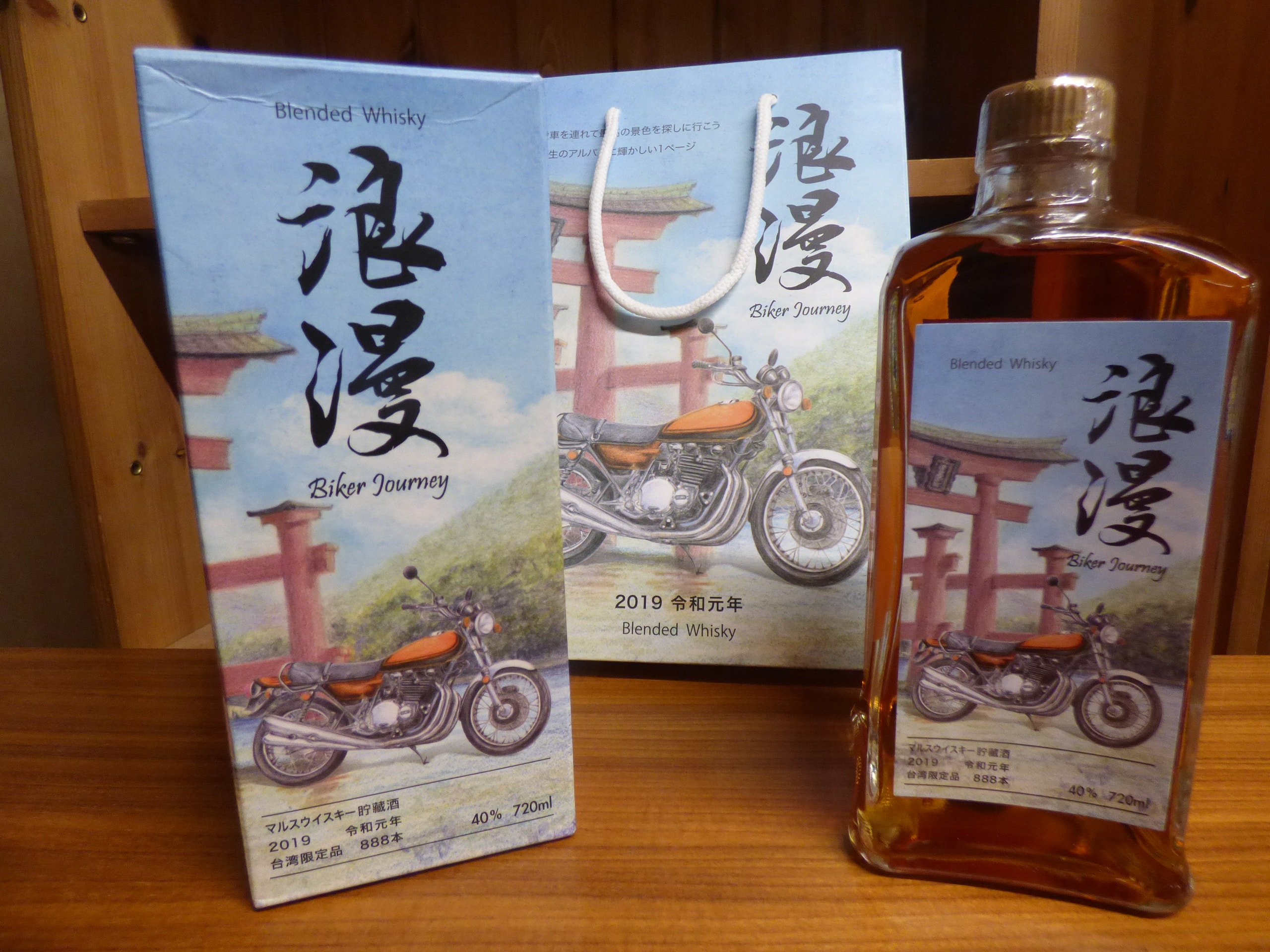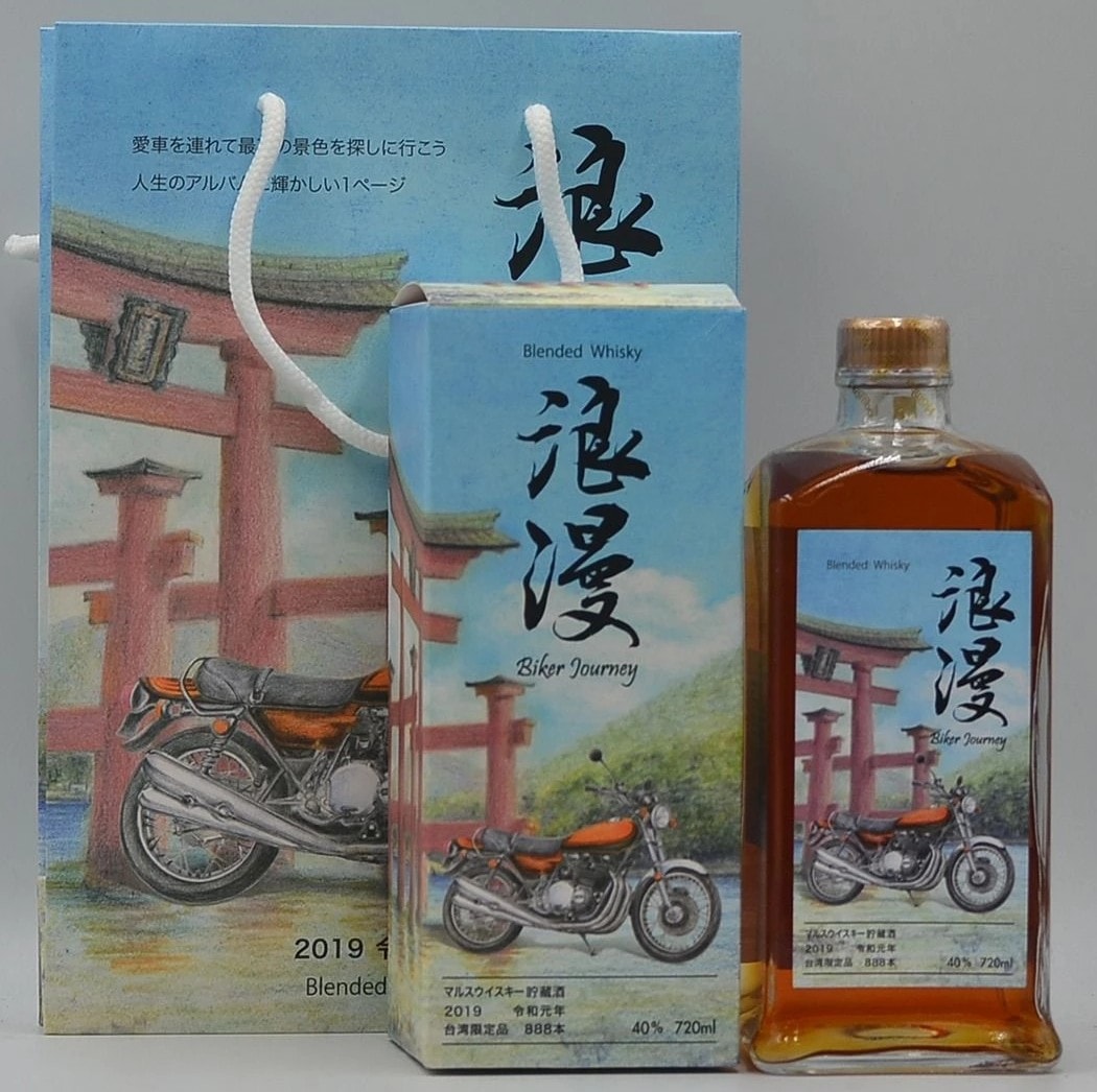 A Mars Kura Whisky Biker Journey 2019 Batch 02, Taiwan Limited Edition, comprising a 720ml glass bottle of Mars Blended Whisky, its matching cardboard retail box, and a paper gift bag. The amber-colored whisky bottle is front-labeled “Blended Whisky” and prominently features the Japanese calligraphy “浪漫” (Roman, meaning Romance or Romantic) along with “Biker Journey, ” below an illustration of a vintage motorcycle and a torii gate. The packaging indicates dating to “2019 令和元年” (2019, the first year of the Reiwa era), specifies it as a “台湾限定品” (Taiwan Limited Edition) of “888本” (888 bottles), and has an alcohol content of 40% by volume. The rear label further identifies the producer as “本坊酒造株式会社” (Honbo Shuzo Co., Ltd.) and specifies malt and grain as raw materials. The rear label also notes “Batch.02”.