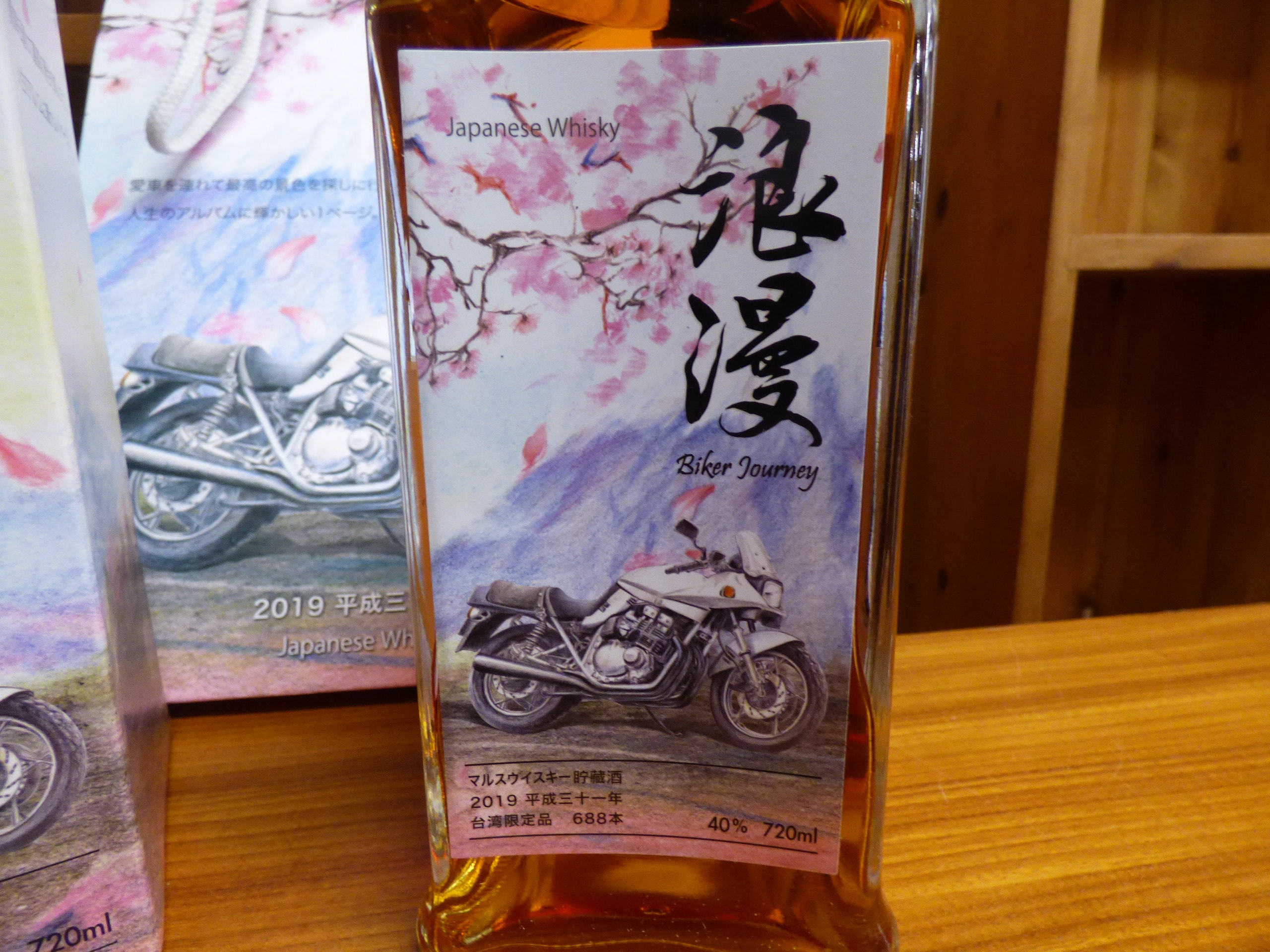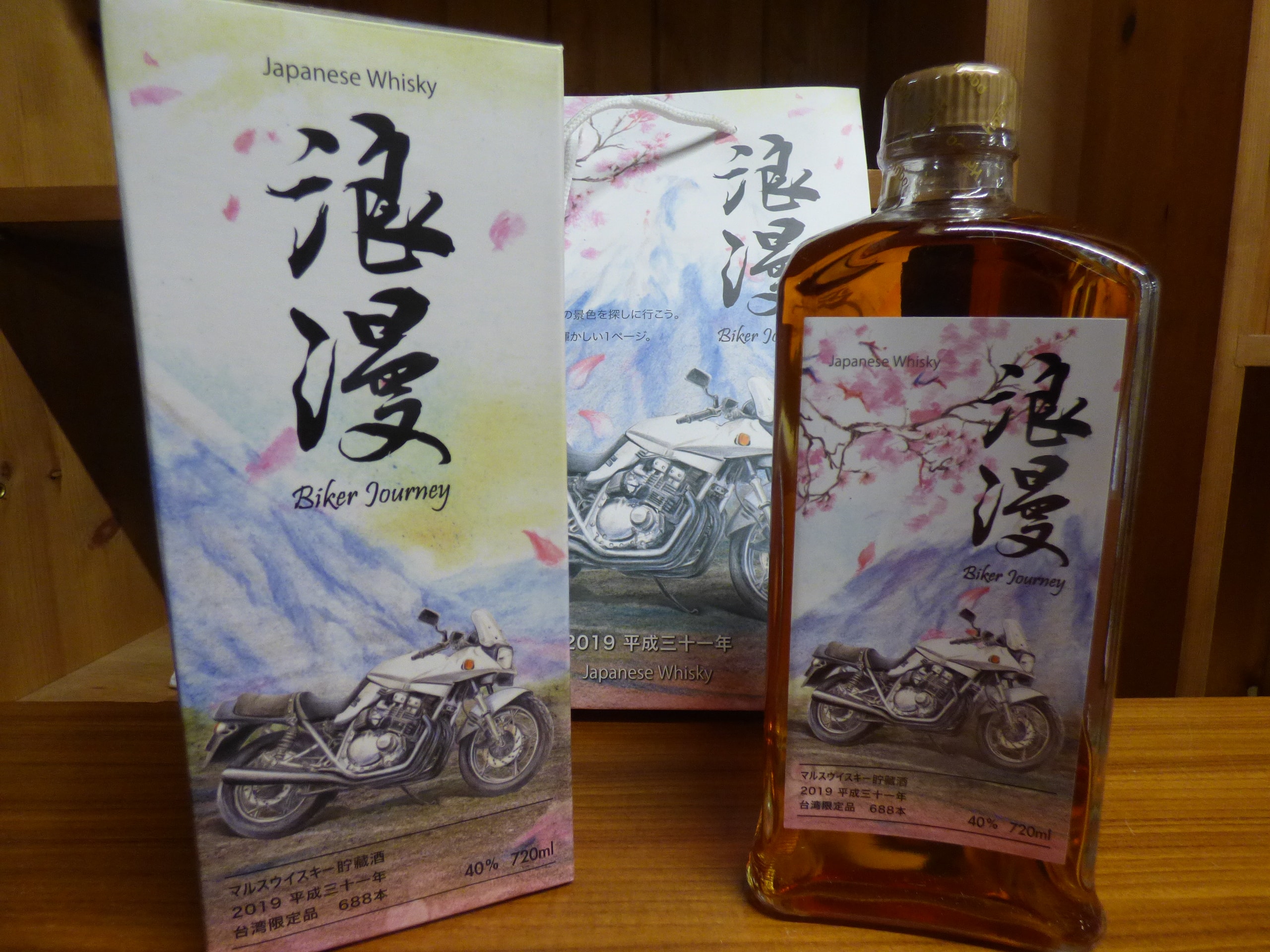 A Mars Biker Journey 2019 Taiwan Limited Edition Japanese Whisky, presented in a 720ml clear glass bottle with its original cardboard packaging box and a paper gift bag. The lot features a consistent “Biker Journey” theme, prominently displaying an illustration of a classic-style motorcycle, cherry blossoms, and mountainous landscapes, alongside the calligraphic character “浪漫” (Romance). The labels identify the contents as “Mars Whisky, ” a “Japanese Whisky” composed of “Malt” and “Grain” ingredients, bottled at “40%” alcohol by volume. Production is marked as “2019 平成三十一年” (Heisei 31st Year), part of a “Taiwan Limited Edition” of “688 bottles.” The whisky was produced by Honbo Shuzo Co., Ltd. of Kagoshima, with distribution handled by Dajun Cultural & Creative Co., Ltd. in Taipei.
