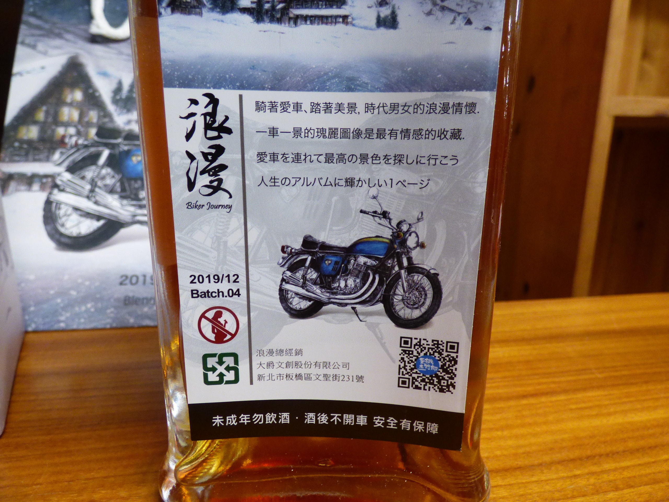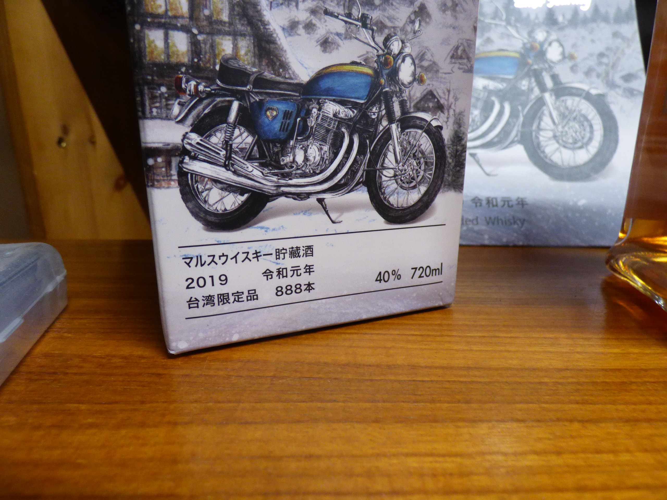 A sealed glass bottle of Mars Biker Journey Batch 4 Blended Whisky, 2019, Taiwan Limited Edition. The lot includes the original cardboard presentation box, a matching paper gift bag, and a small clear plastic case, likely containing a collectible insert. The central theme, “Biker Journey, ” is prominently displayed with English text and Japanese calligraphy “浪慢” (Rōman), translating to “Romantic Journey.” The labels feature a vintage blue and yellow motorcycle, resembling a Honda CB750 Four, depicted against a snowy, mountainous landscape with traditional gassho-zukuri style houses. The contents are identified as “Mars Whisky aged liquor, ” a “Taiwan Limited Edition” of “888 bottles” from “2019 (令和元年 – Reiwa Year 1), ” with an alcohol content of “40%” and a volume of “720ml.” The bottle’s reverse label specifies “2019/12 Batch.04” and includes additional descriptive text in Chinese/Japanese regarding “the romantic feelings of men and women of the era” and finding “the best scenery” with a “beloved car.” Distributor details for Dajue Cultural and Creative Co., Ltd., New Taipei City, are also present.