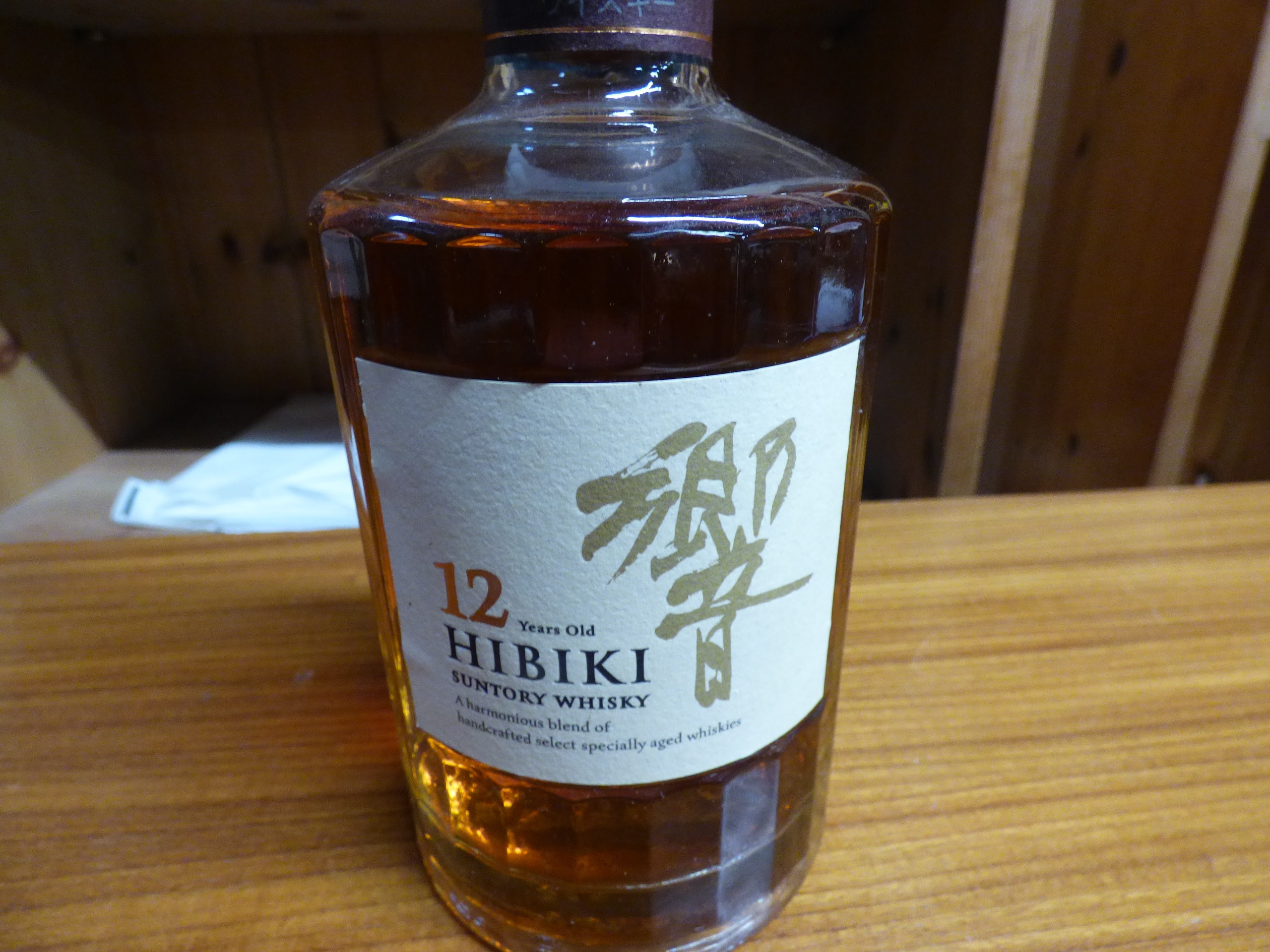 A bottle of Suntory Hibiki 12 Year Old Japanese Whisky. This contemporary glass bottle contains amber-colored whisky and features a clear stopper. The main front label displays "12 Years Old HIBIKI SUNTORY WHISKY" in English, alongside a large, gold calligraphic Japanese character 響 (Hibiki). The neck band is marked "SUNTORY WHISKY" and ウイスキー (Whisky). The rear label indicates it is intended "FOR THE UK MARKET" with a "HM Revenue & Customs" seal, and identifies Morrison Bowmore Distillers as the importer.