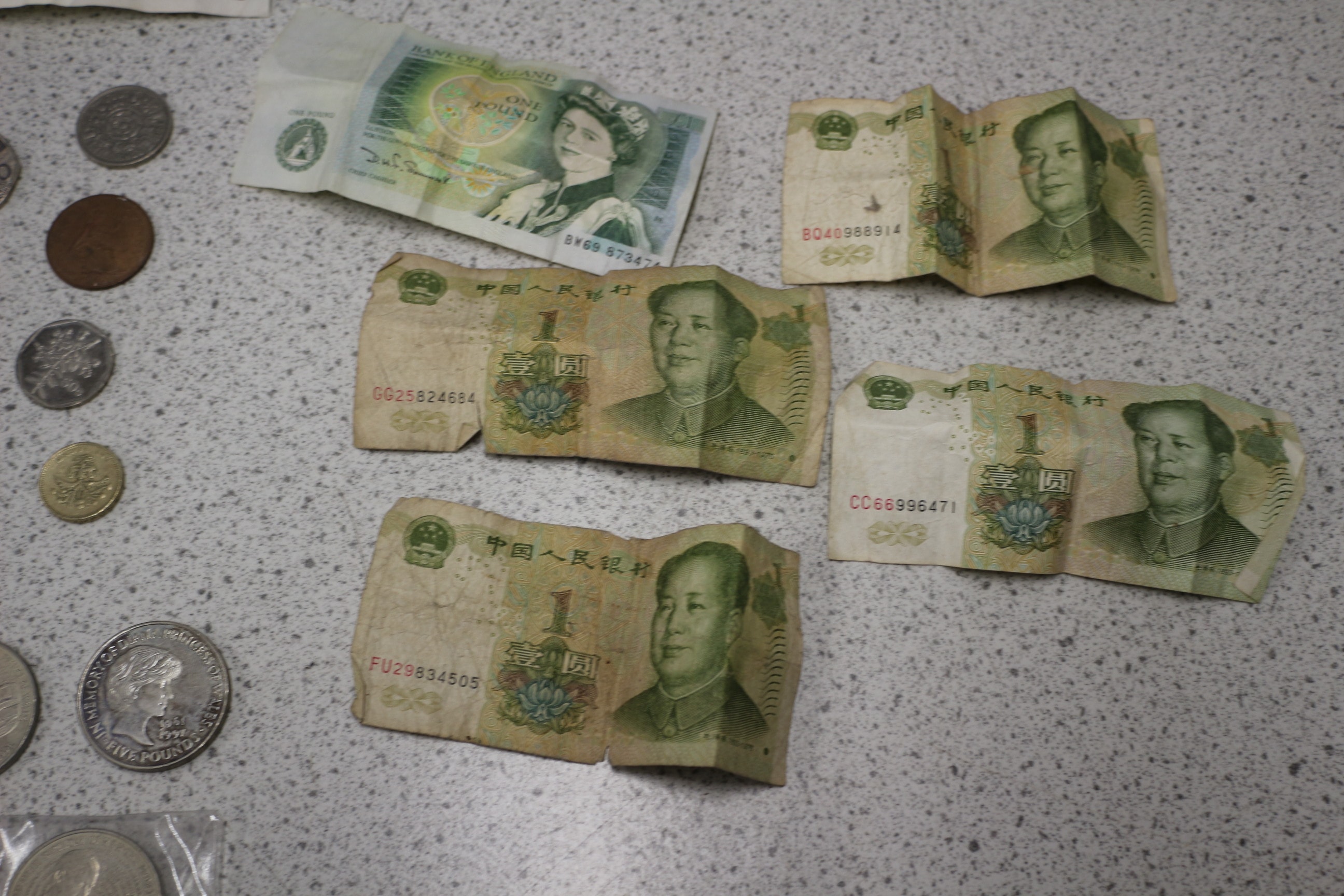 This collection comprises a group of international banknotes and coinage. The banknotes include one modern British £5 note and two £1 notes, both featuring Queen Elizabeth II. Also present is a group of Chinese 1 Yuan notes, marked “中国人民银行” (People’s Bank of China) and “壹圆” (one yuan), depicting Mao Zedong. The coinage is diverse, featuring a group of various British issues from different periods, including shillings, pence, and a 50-pence piece. Additionally, there are two modern commemorative silver-toned £5 coins, dated 1997 (“Memory of Diana Princess of Wales”) and 1998 (“The Prince’s Trust”), with some still sealed in protective plastic. The lot also includes a group of multiple older, worn, primarily copper-toned coins of indeterminate origin. The materials consist of paper for the banknotes and various metals for the coins.