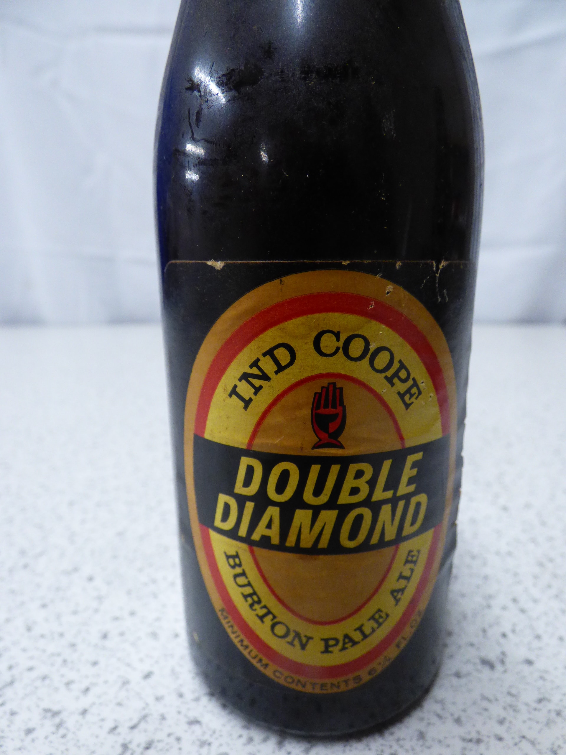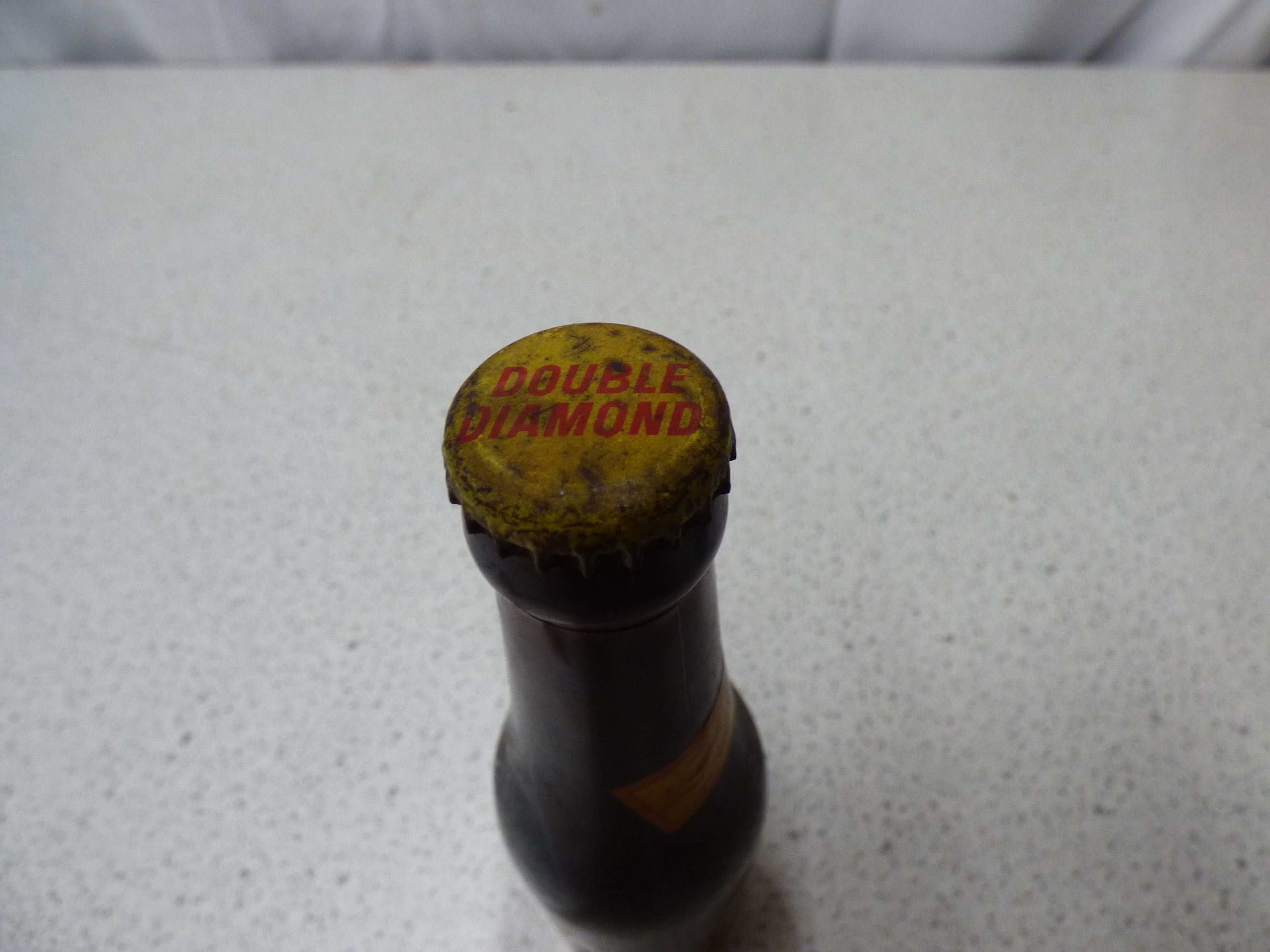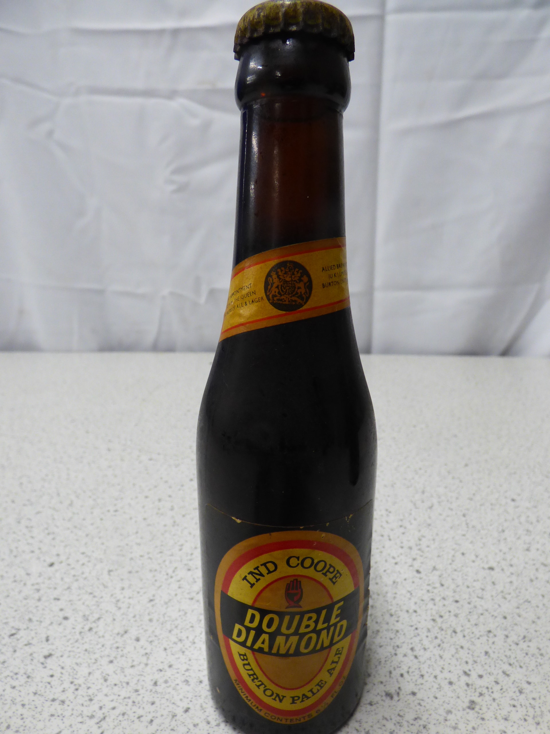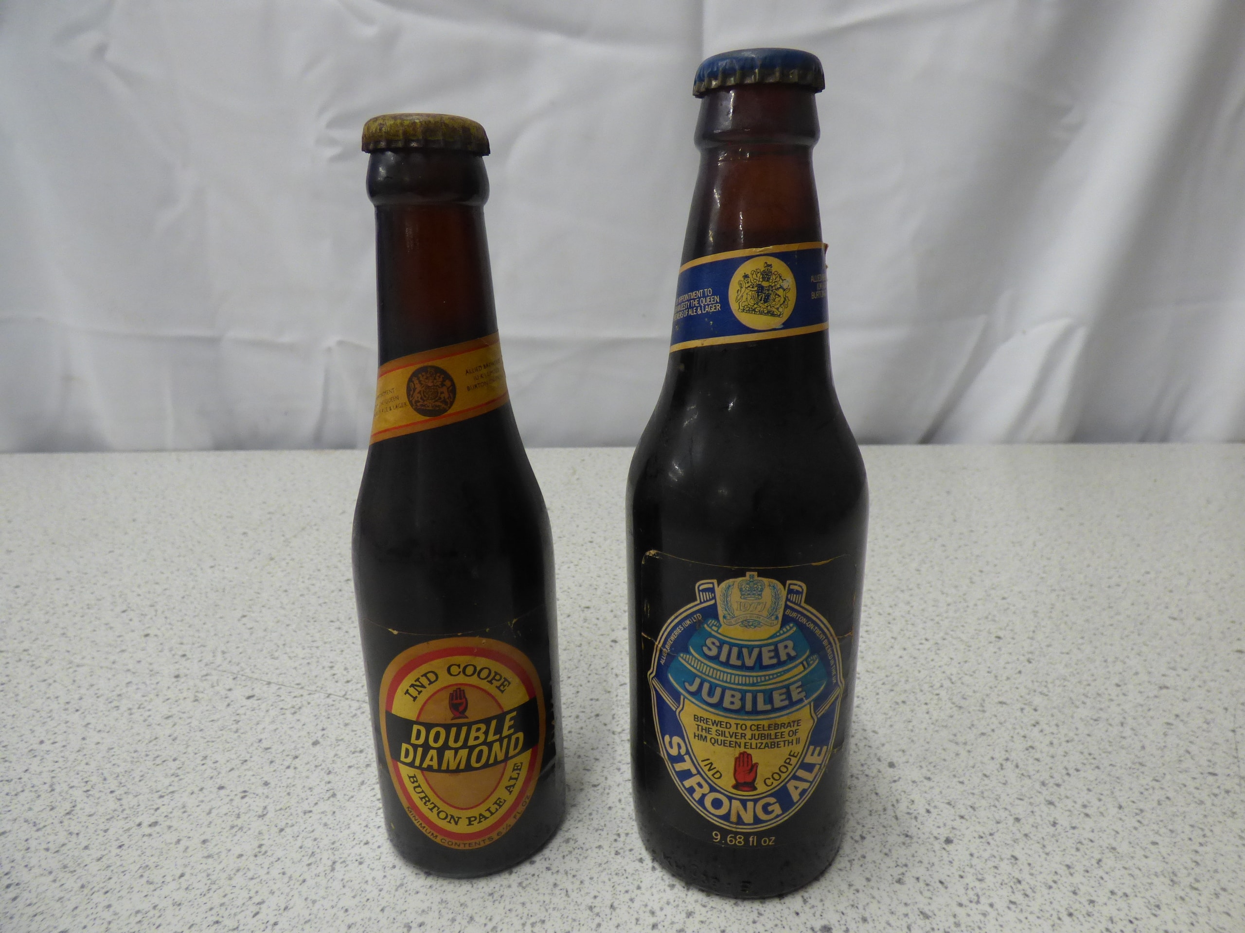 A pair of dark brown glass beer bottles, including an Ind Coope Double Diamond Burton Pale Ale and a 1977 Ind Coope Silver Jubilee Strong Ale (9.68 fl oz) celebrating HM Queen Elizabeth II.