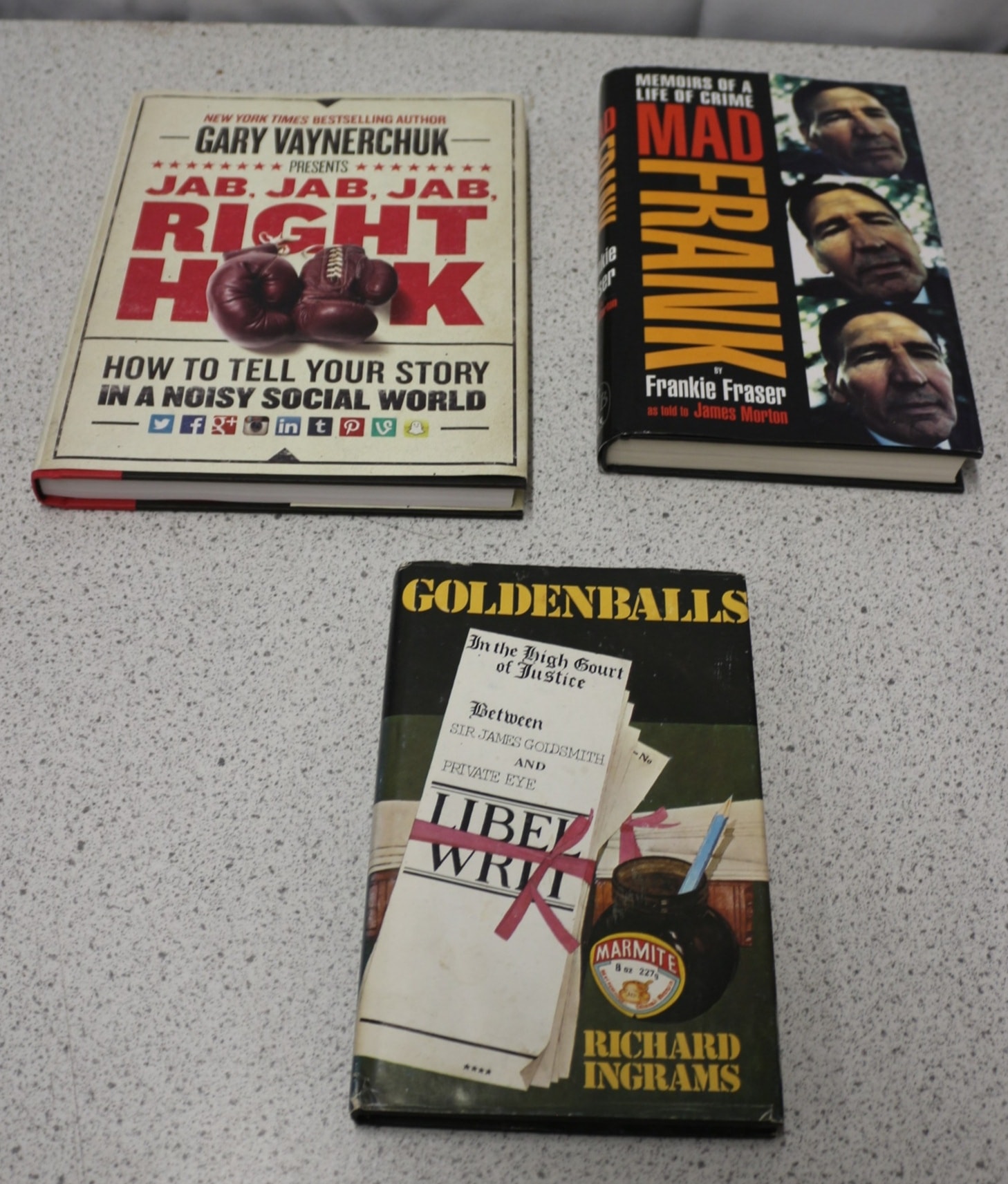 Hardcover book titled ‘JAB, JAB, JAB, RIGHT HOOK HOW TO TELL YOUR STORY IN A NOISY SOCIAL WORLD’ by Gary Vaynerchuk, with a ‘gv’ signature on the red endpaper. Memoirs of a life of Crime Mad Frank and Goldenballs