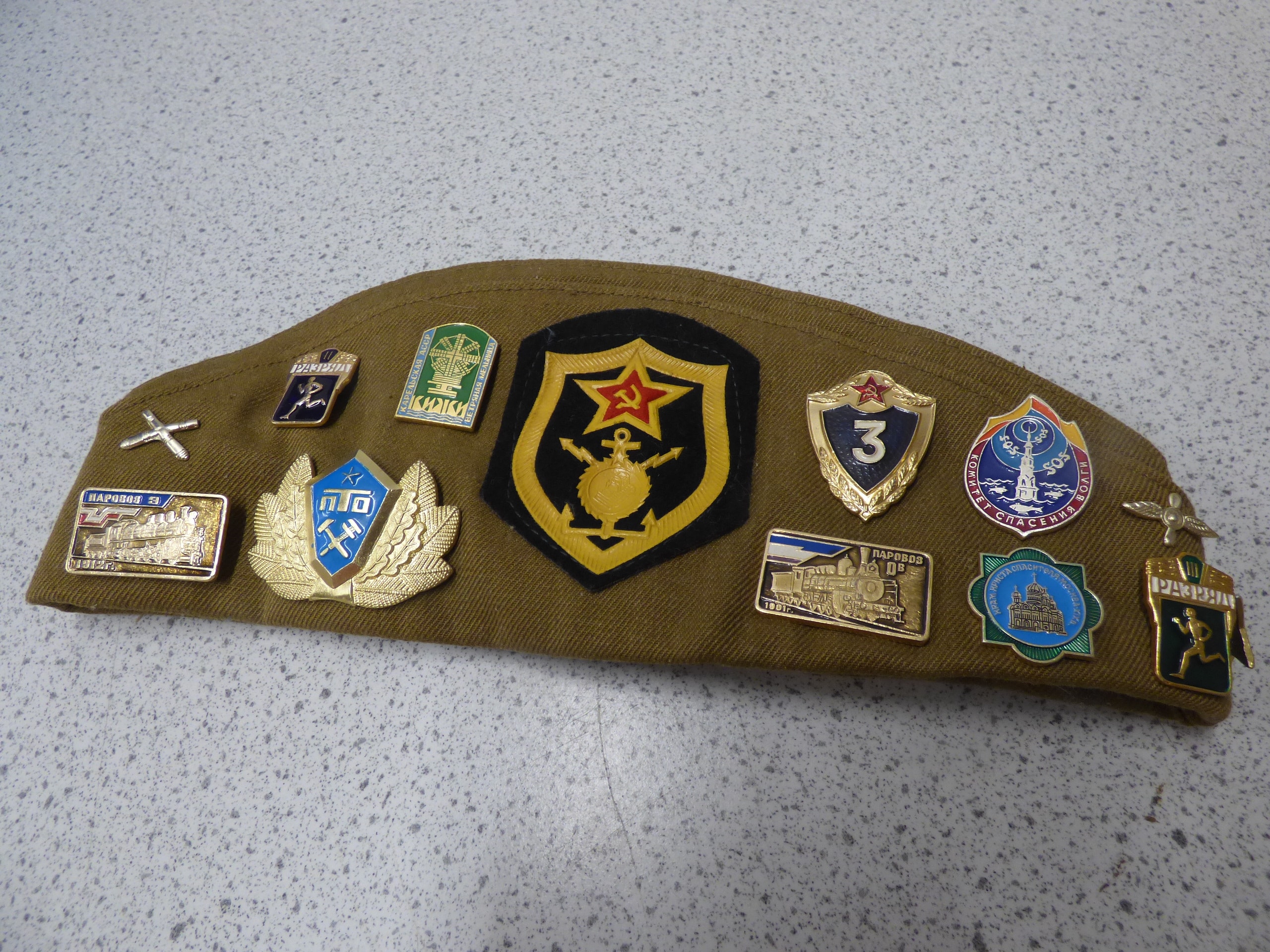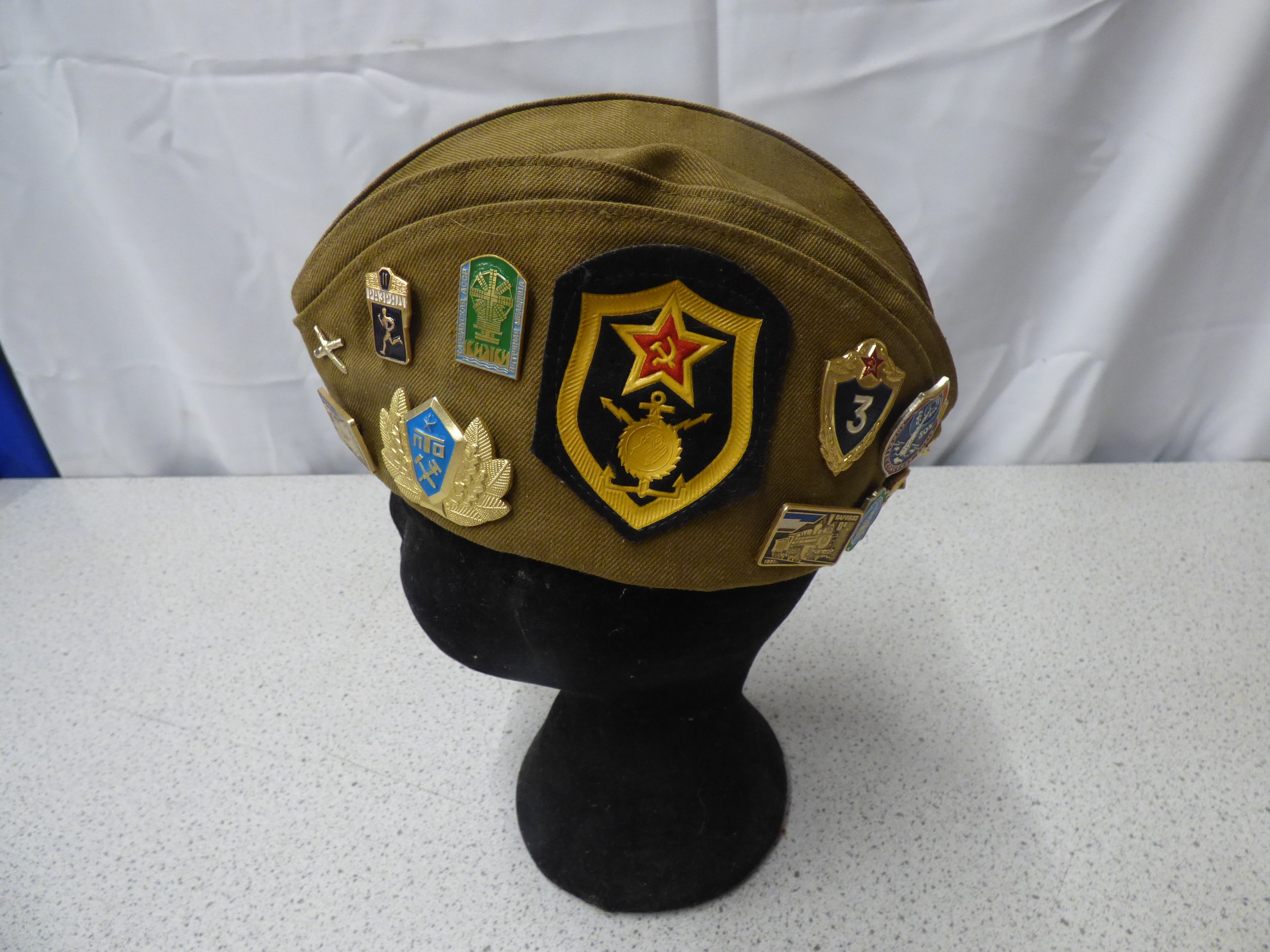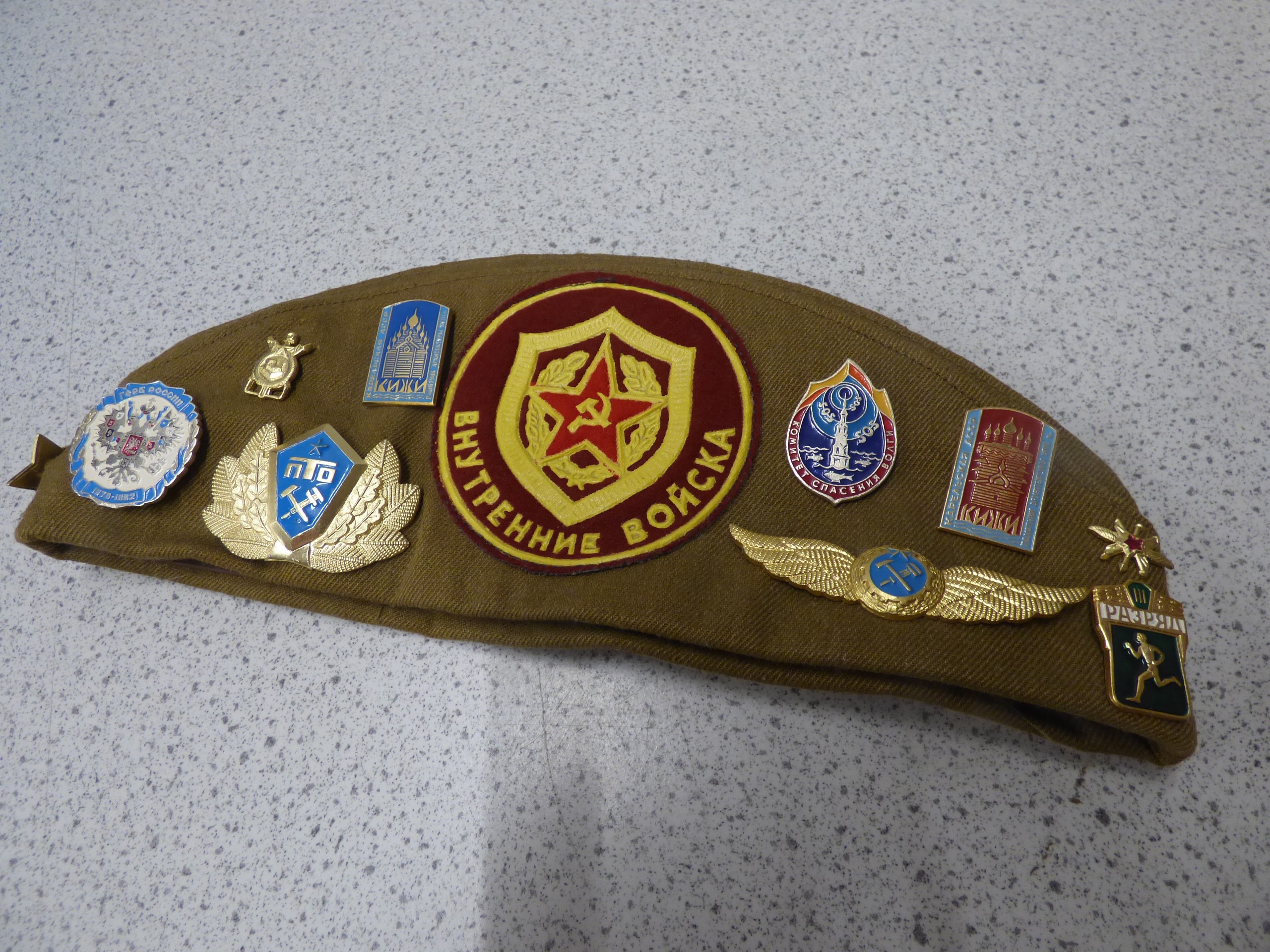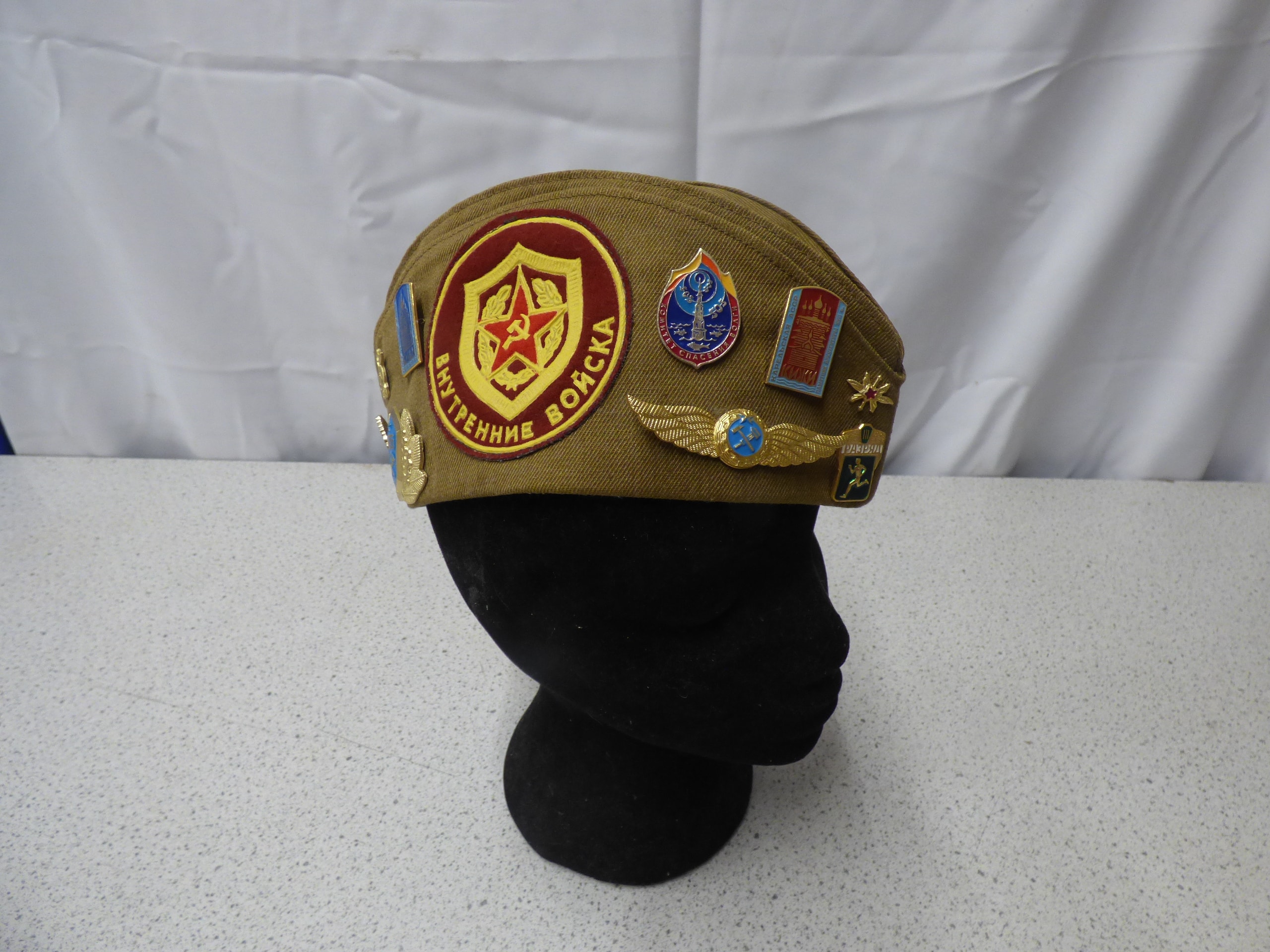 A single olive green military-style garrison cap adorned with numerous Soviet-era badges, featuring a patch that reads “ВНУТРЕННИЕ ВОЙСКА” (Internal Troops) and an internal label marking it as “СССР”, “ОТК-2”, “СОРТ 1”, and “ЦЕНА 3р. 00к.”.