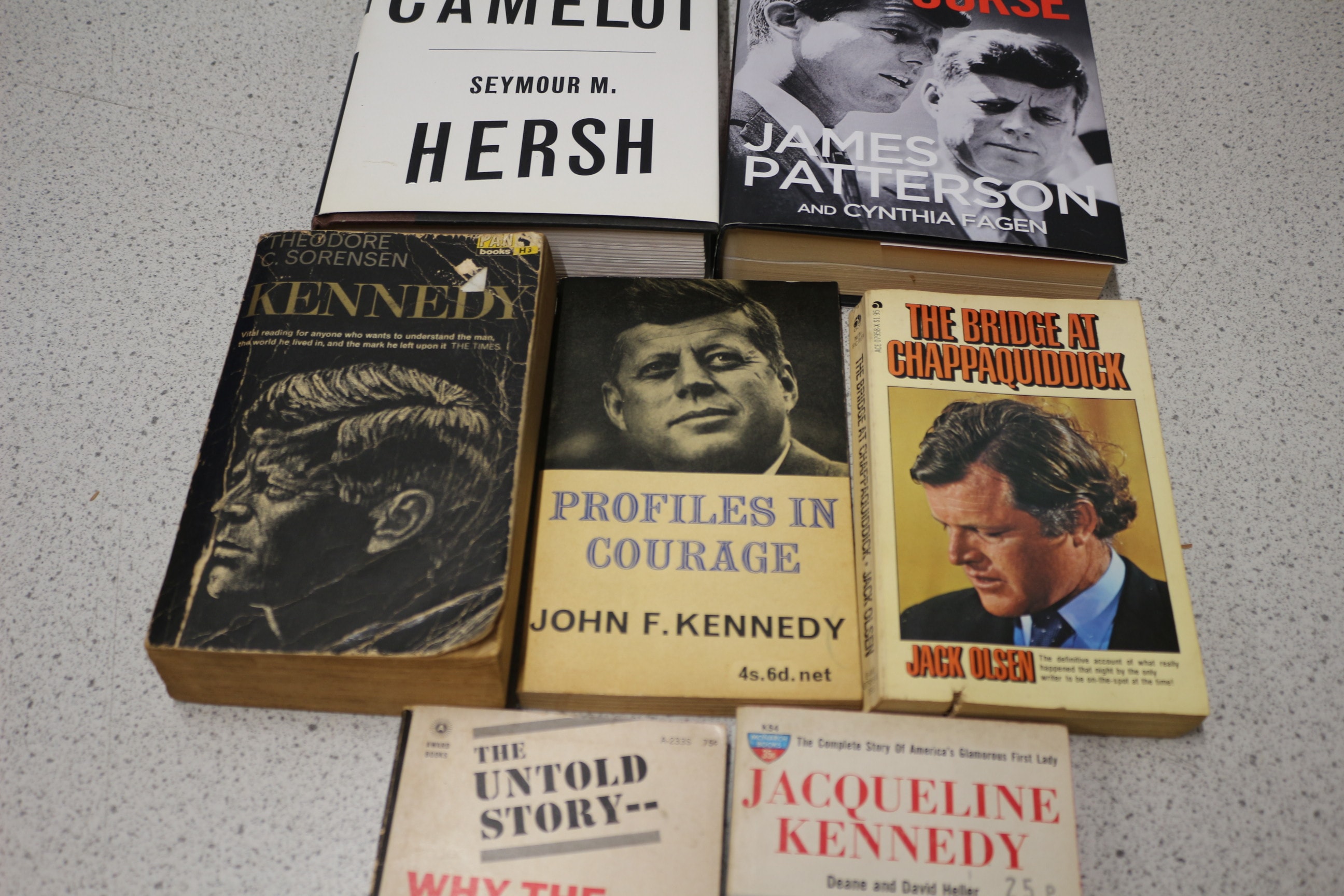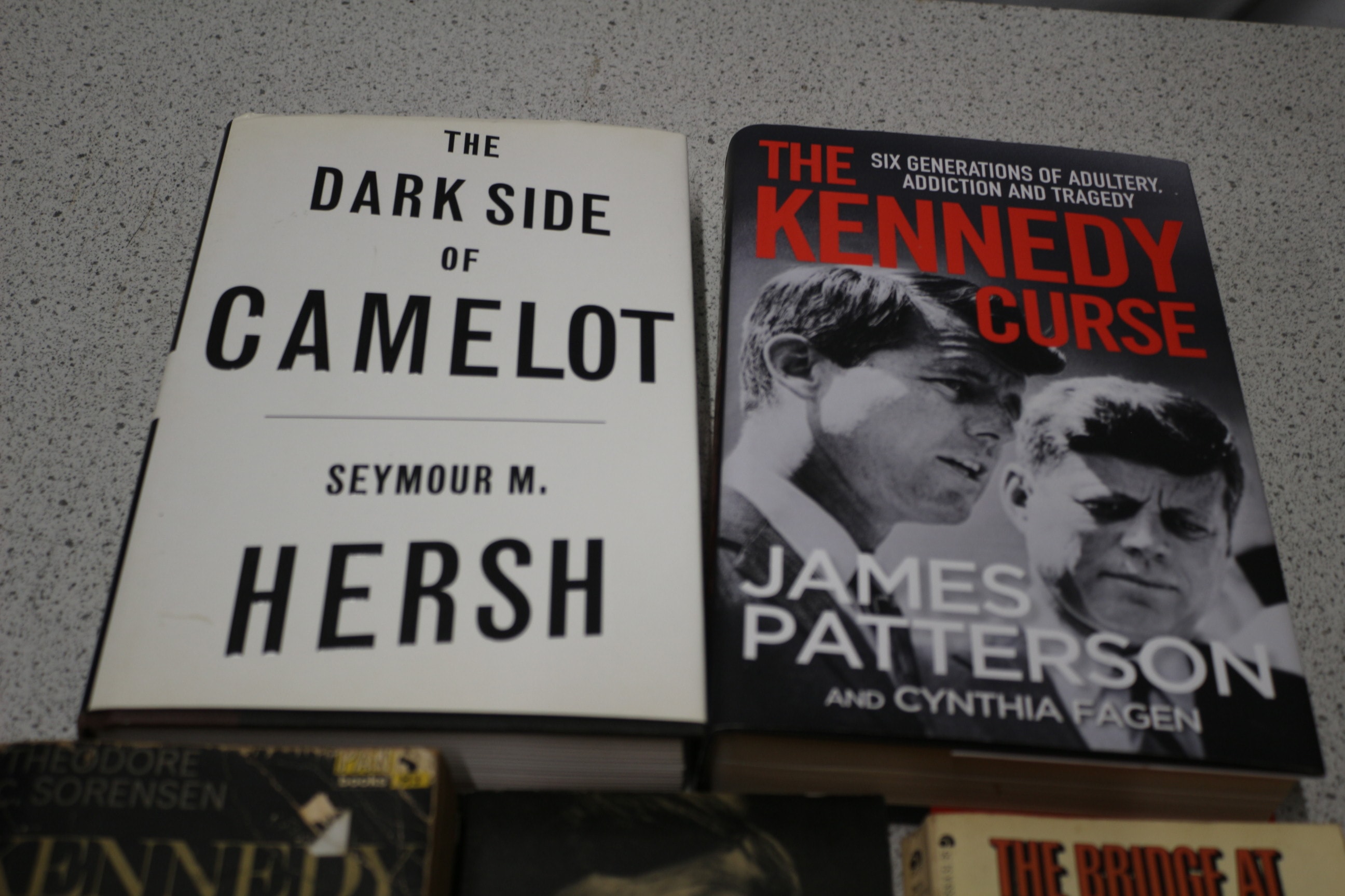 A collection of seven books related to John F. Kennedy and the Kennedy family, including ‘Profiles in Courage’ and ‘The Dark Side of Camelot’.