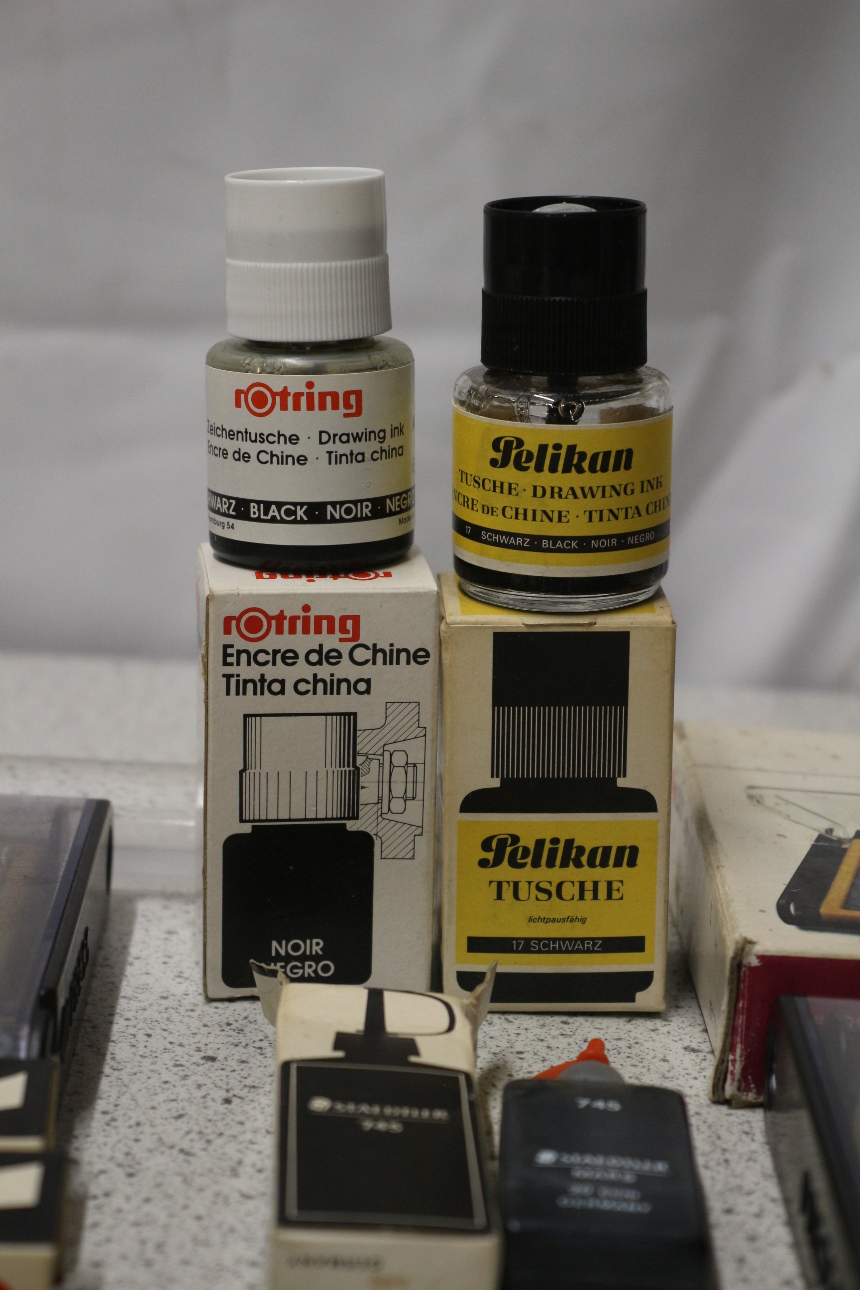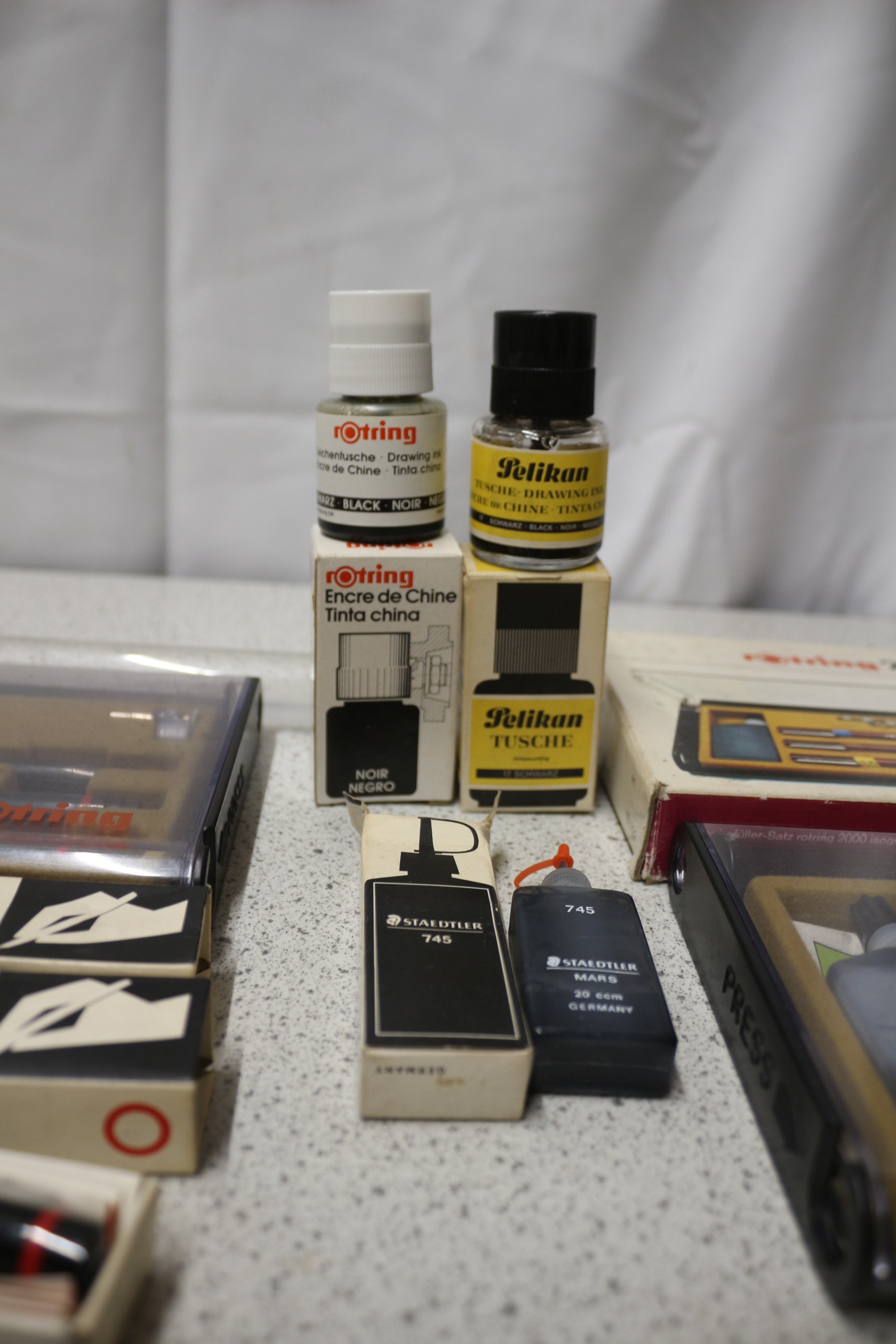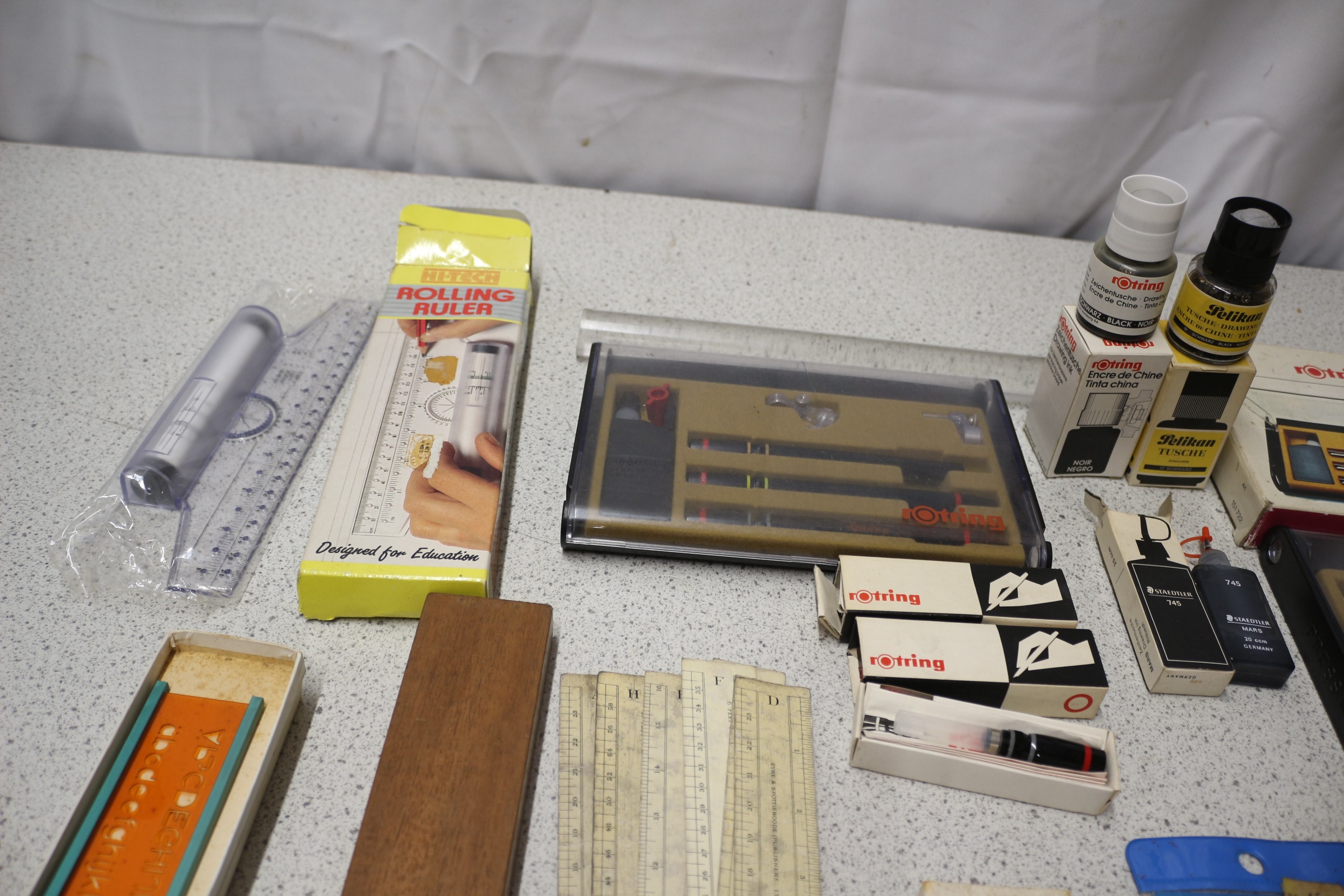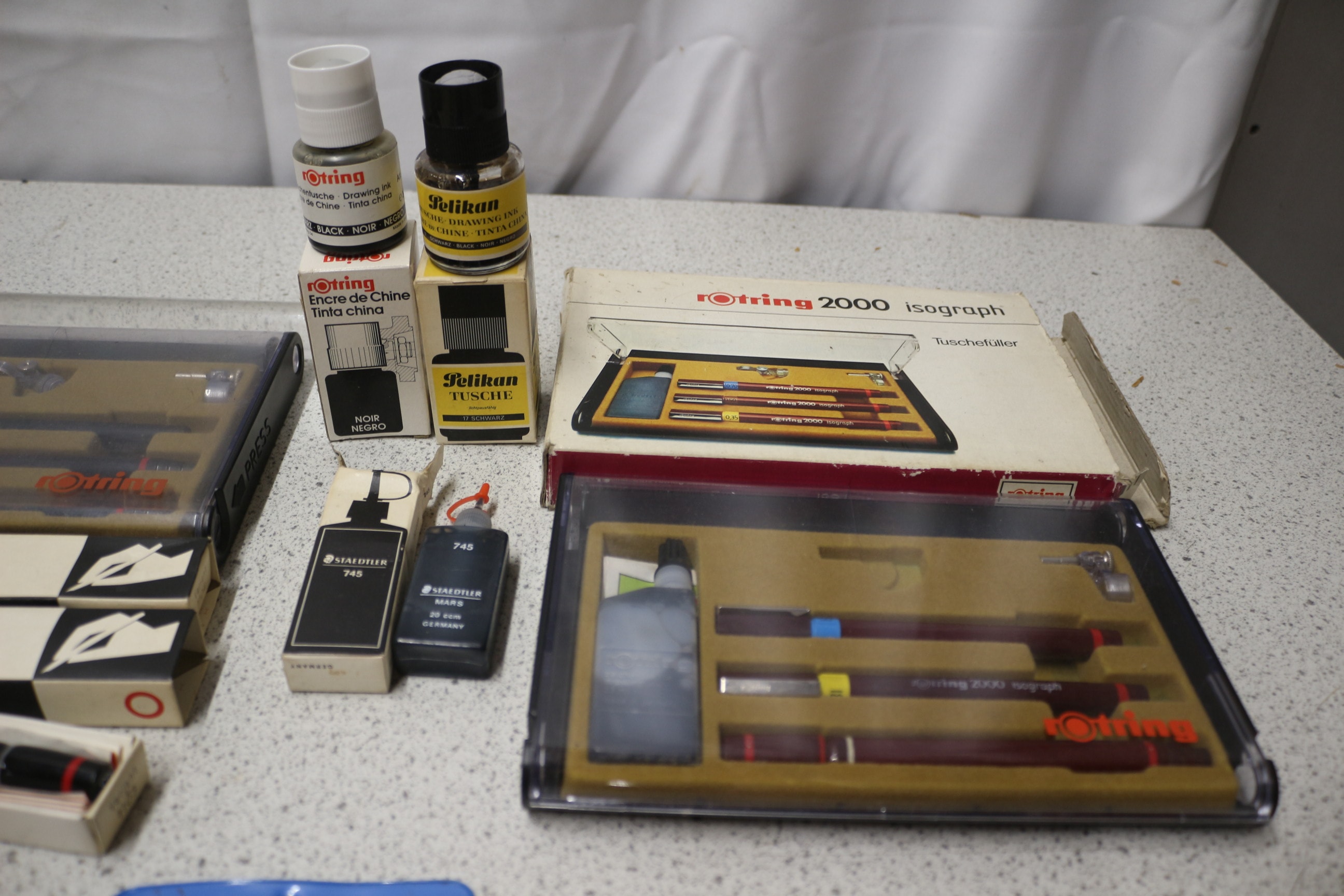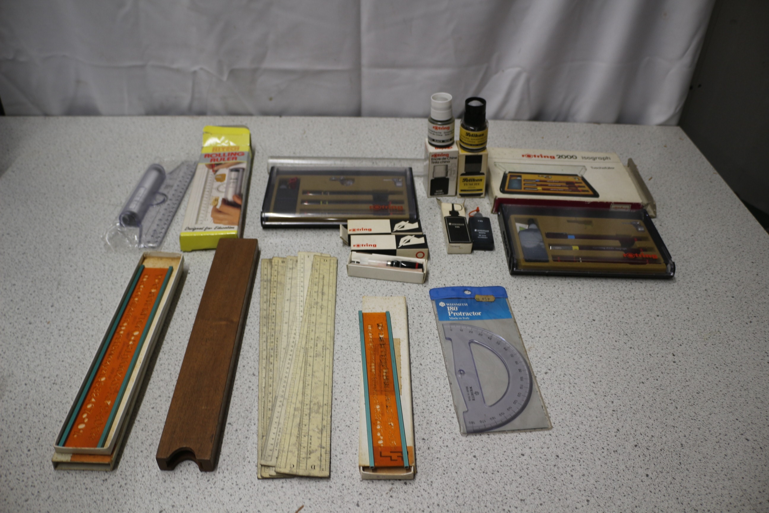 A Rotring 2000 isograph technical drawing instrument set, labelled “rotring 2000 isograph” and “Tuschfüller”, with multiple pens and silver accessories, presented with a collection of additional vintage drafting tools, rulers, and ink bottles.