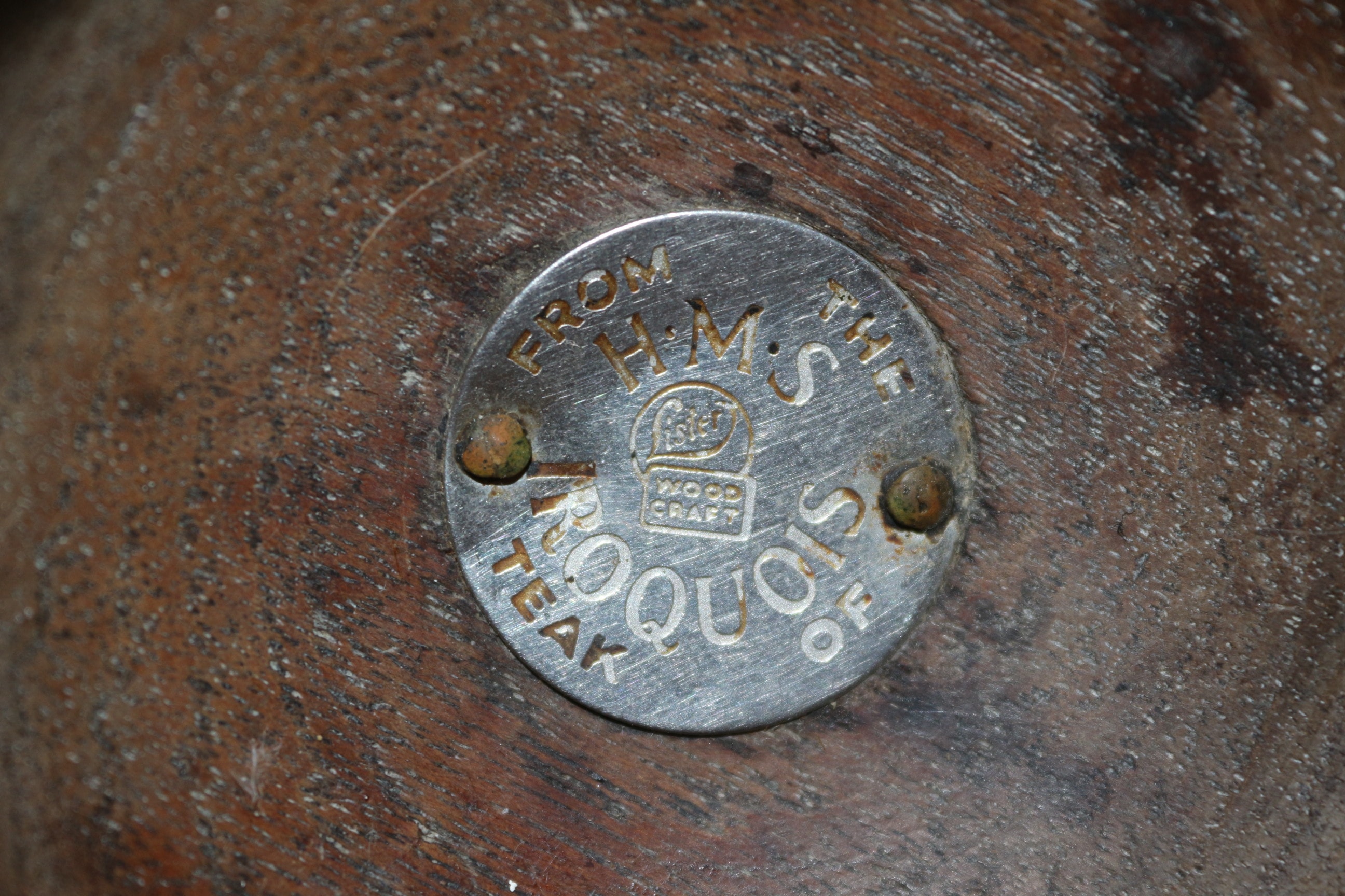 A round, lidded brown wooden box with a carved landscape scene and “Chamonix” inscription, a round brown wooden plaque with a metal disc inscribed “FROM H.M.S. THE IROQUOIS OF TEAK” and “WOOD CRAFT” logo, and a small, barrel-shaped brown wooden cup with a gold plaque reading “FROM THE TEAK OF H.M.S. IRON DUKE ADMIRAL JELLICOE’S FLAG SHIP JUTLAND 1916.” French Land carved trinket box made in Chamonix