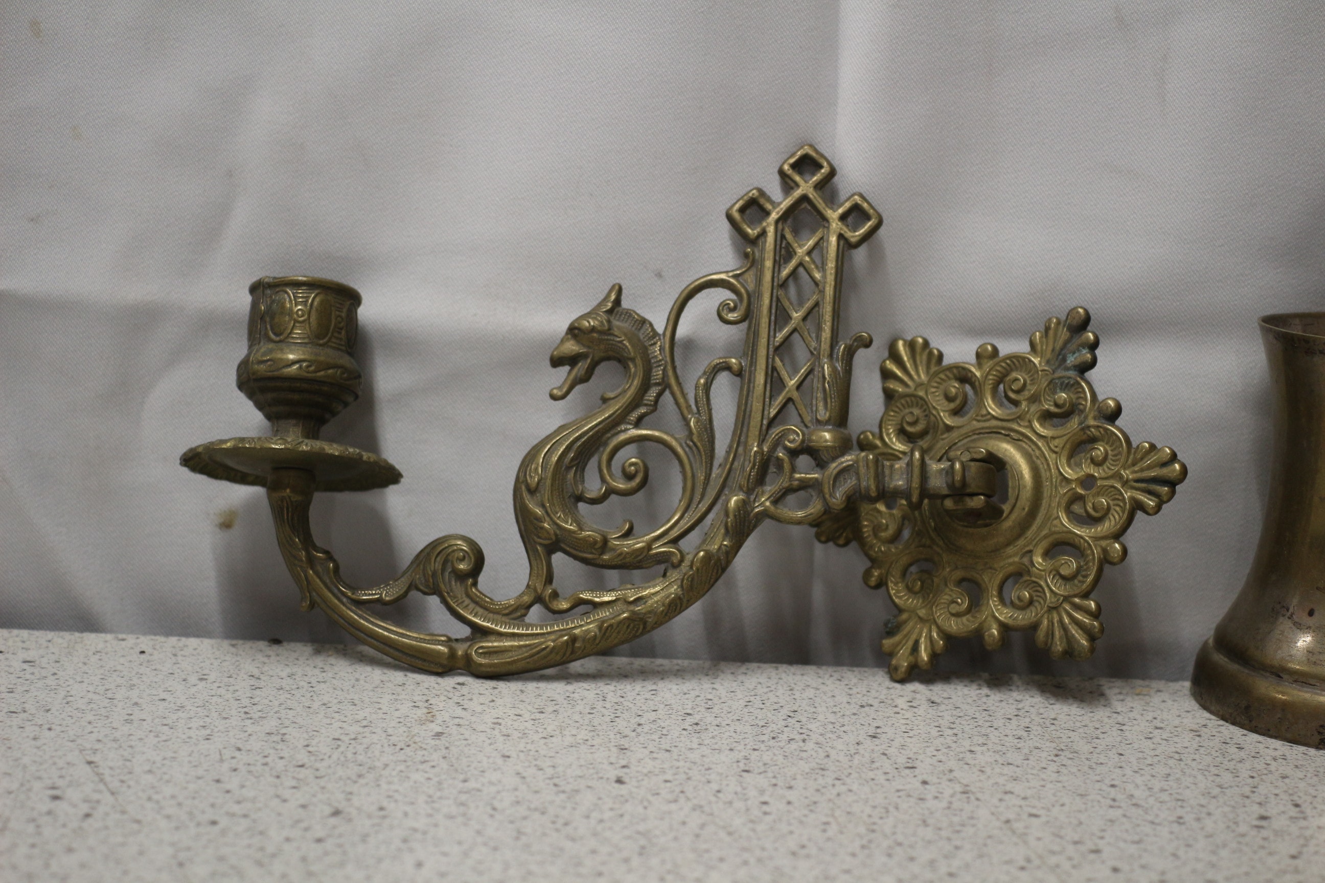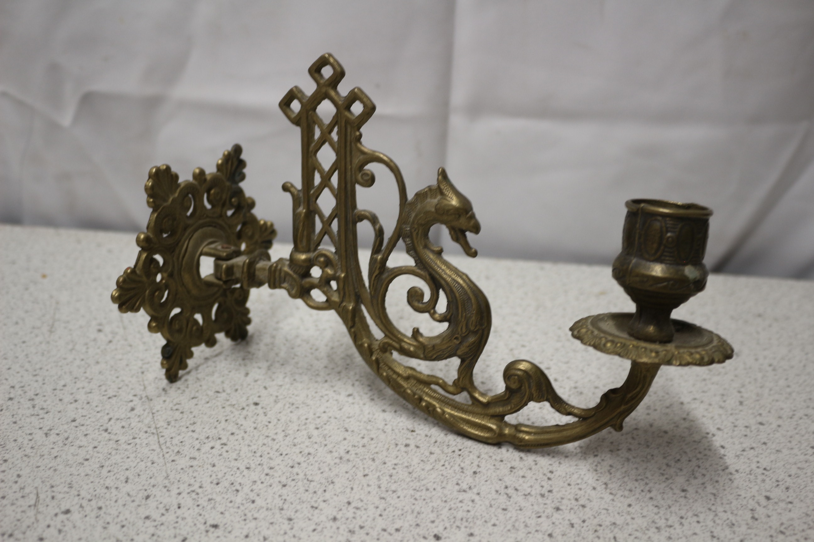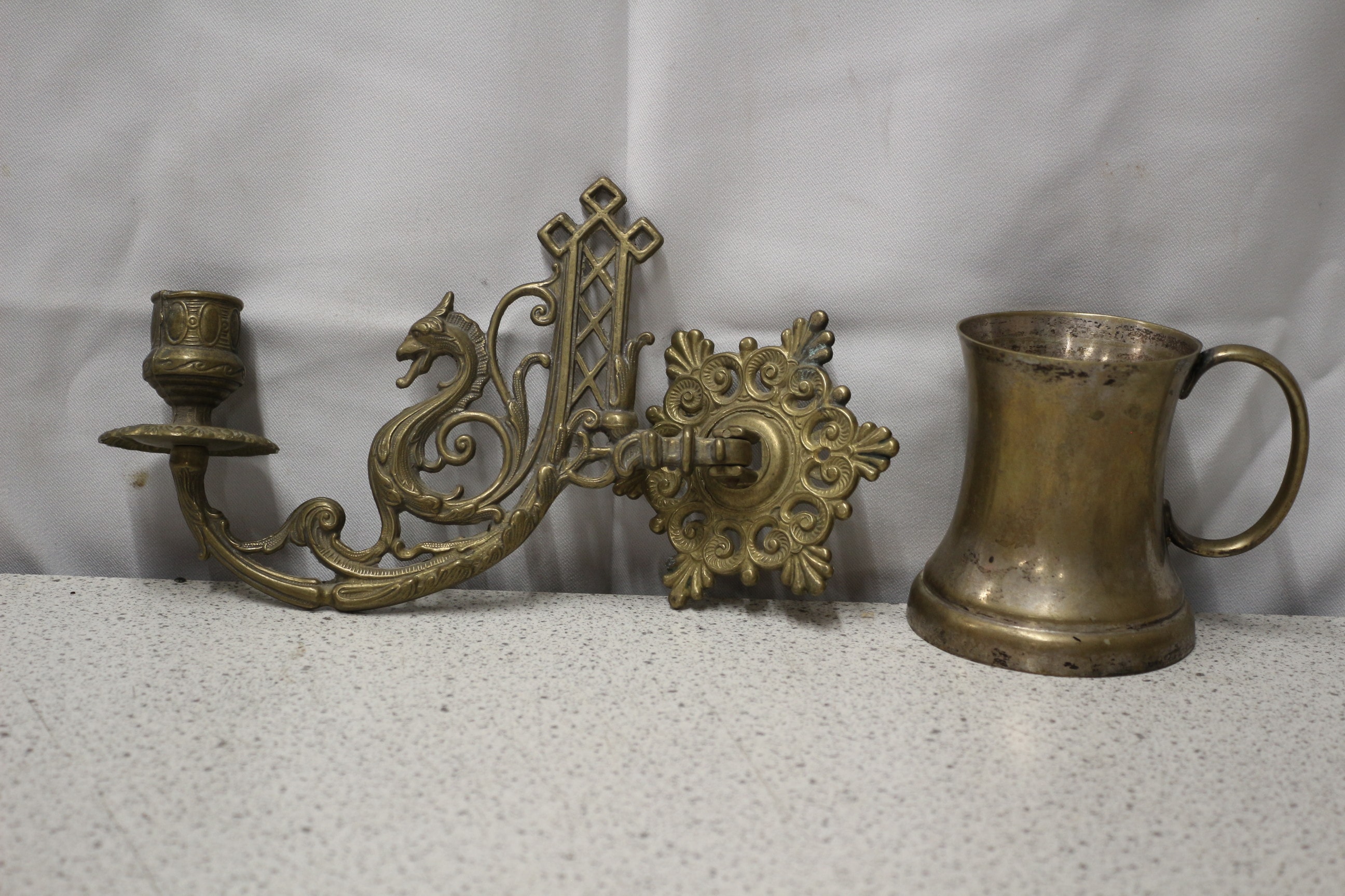 A lot containing one ornate, tarnished brass wall-mounted candlestick holder featuring a dragon motif, and one tarnished antique copper jug, marked ‘EPNS’ and ‘MADE IN INDIA’ on its base.