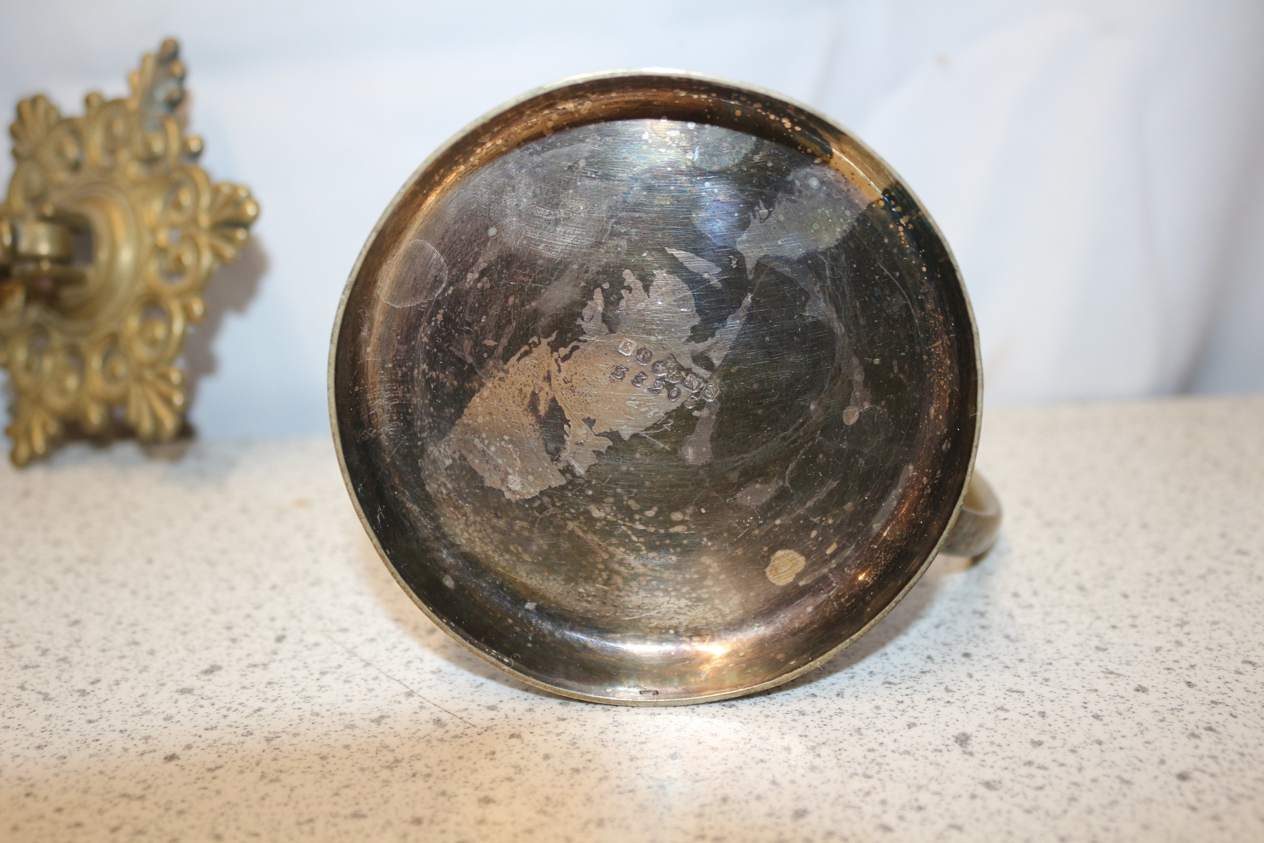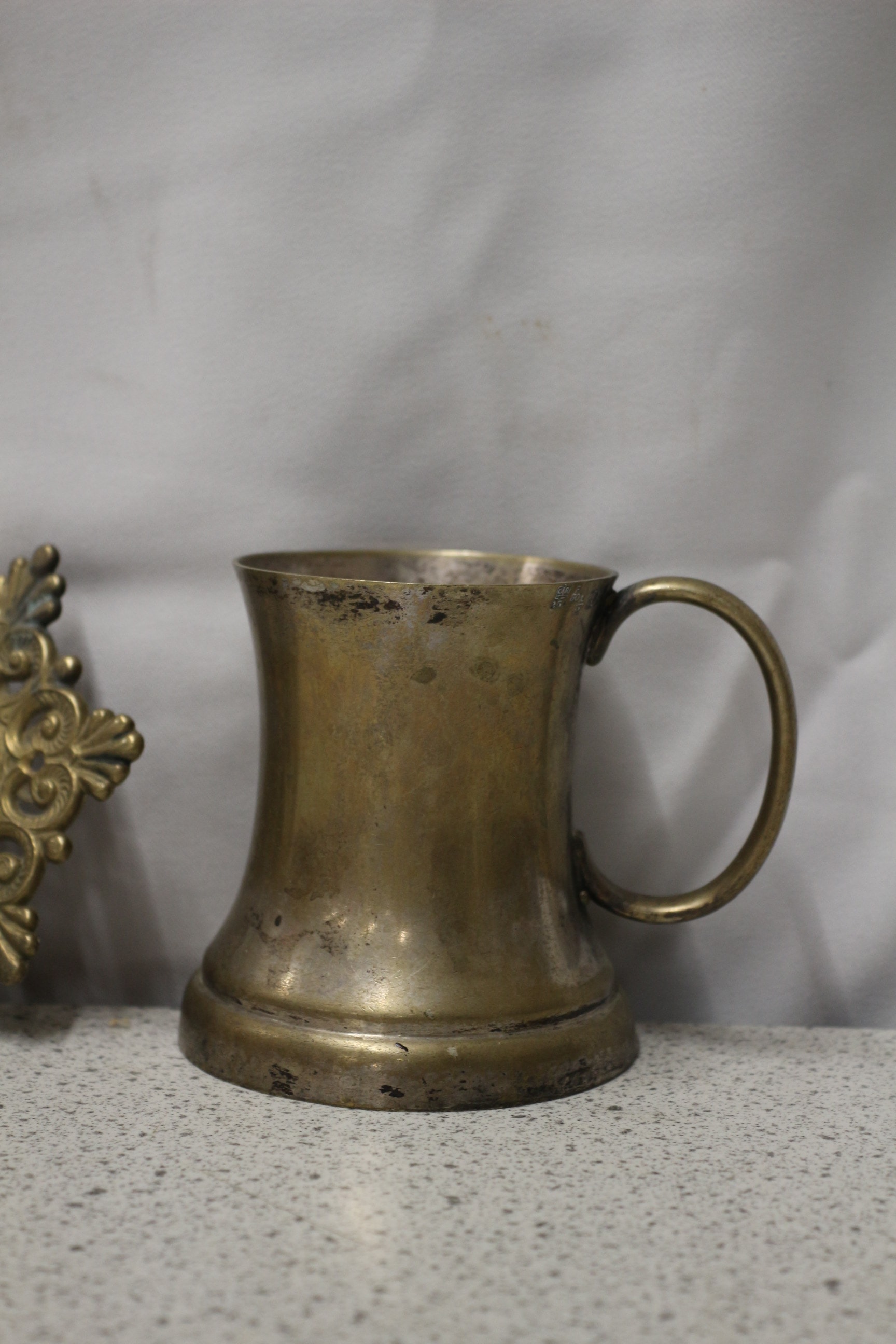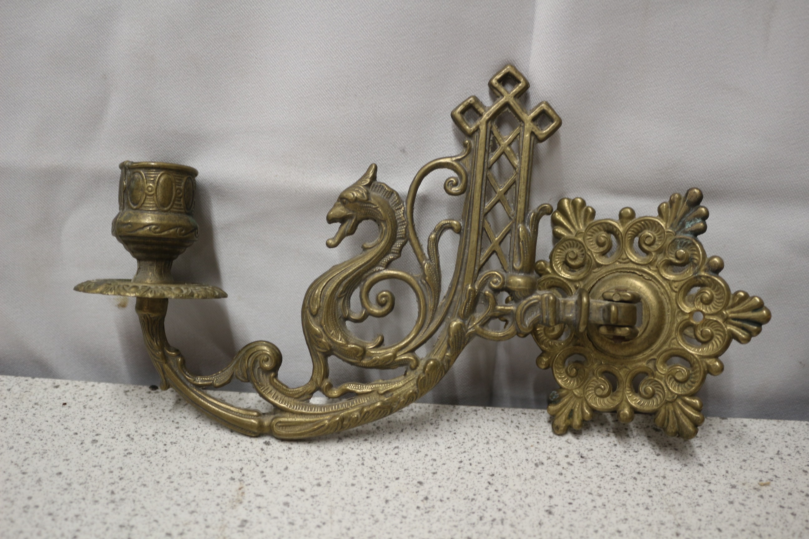 A lot containing one ornate, tarnished brass wall-mounted candlestick holder featuring a dragon motif, and one tarnished antique copper jug, marked ‘EPNS’ and ‘MADE IN INDIA’ on its base.