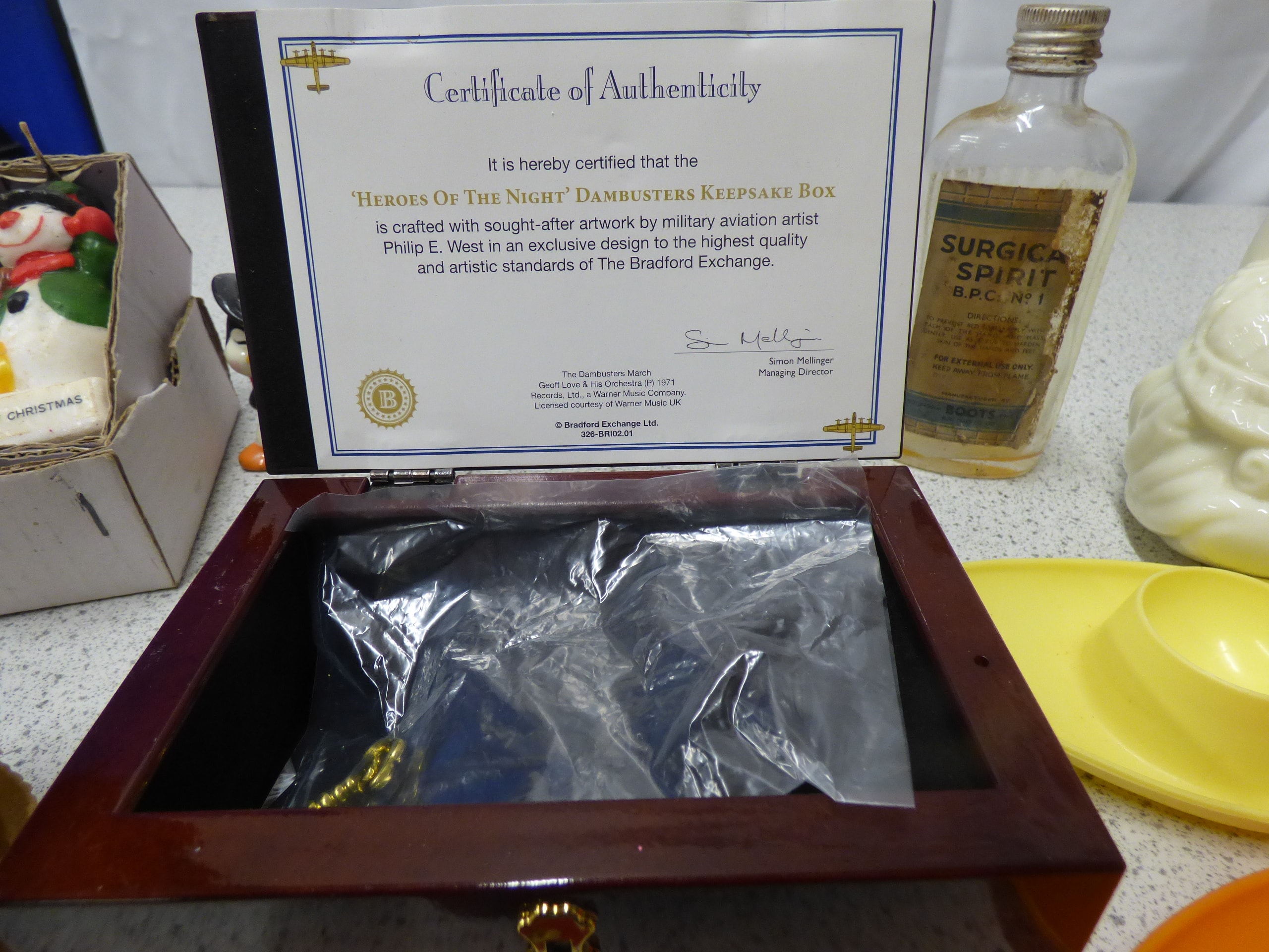Mixed lot including A dark brown wooden keepsake box and a white Certificate of Authenticity identifying it as the ‘HEROES OF THE NIGHT’ DAMBUSTERS KEEPSAKE BOX by Philip E. West for The Bradford Exchange.