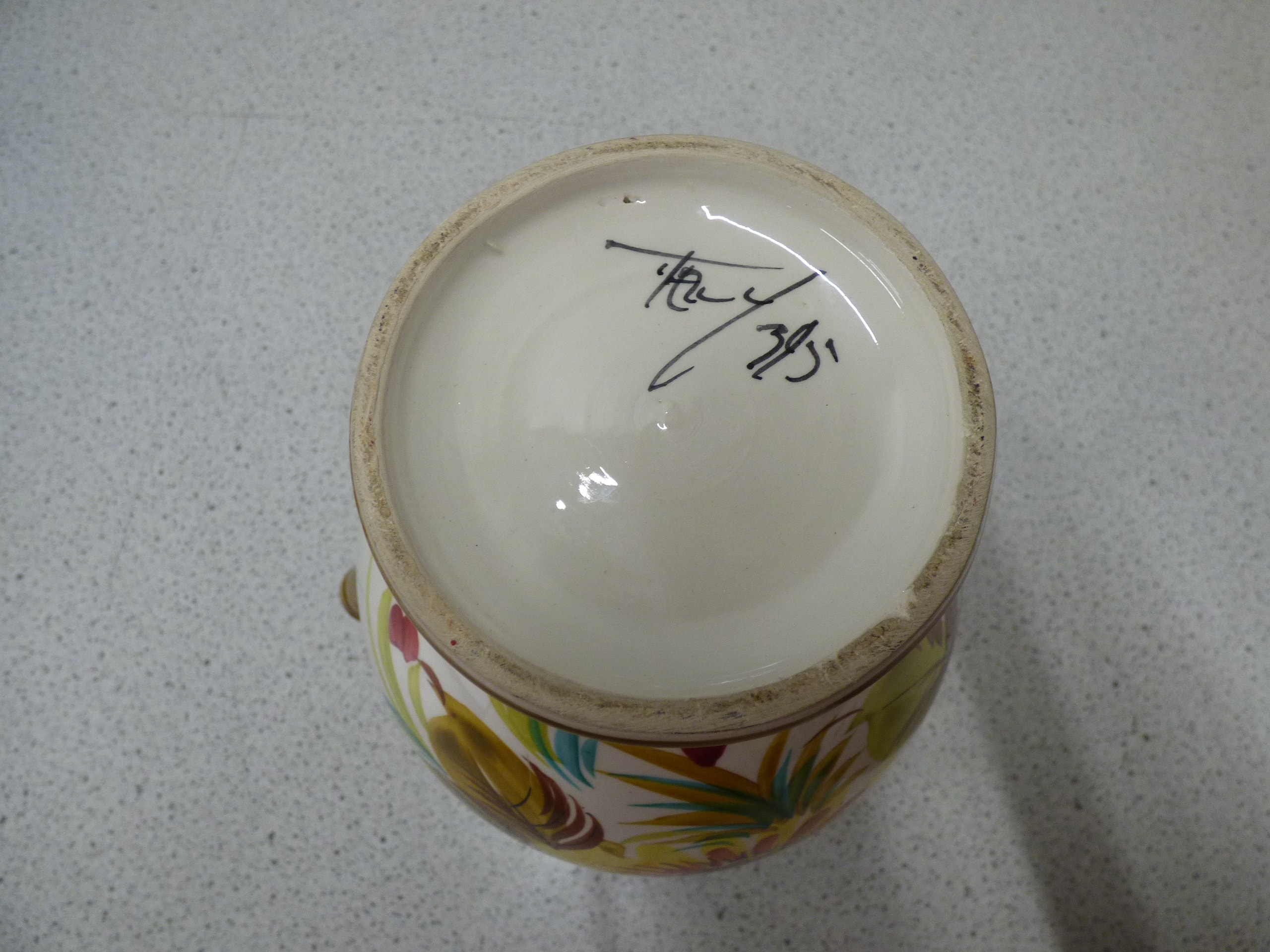 A white ceramic pitcher with a braided brown/gold handle and rim, decorated with multi-coloured floral and leaf patterns in shades of red, yellow, green, teal, and brown, inscribed on the base with ‘Ray’ and ‘3/51’. 27cm tall. Small chips on rim, handle AF.