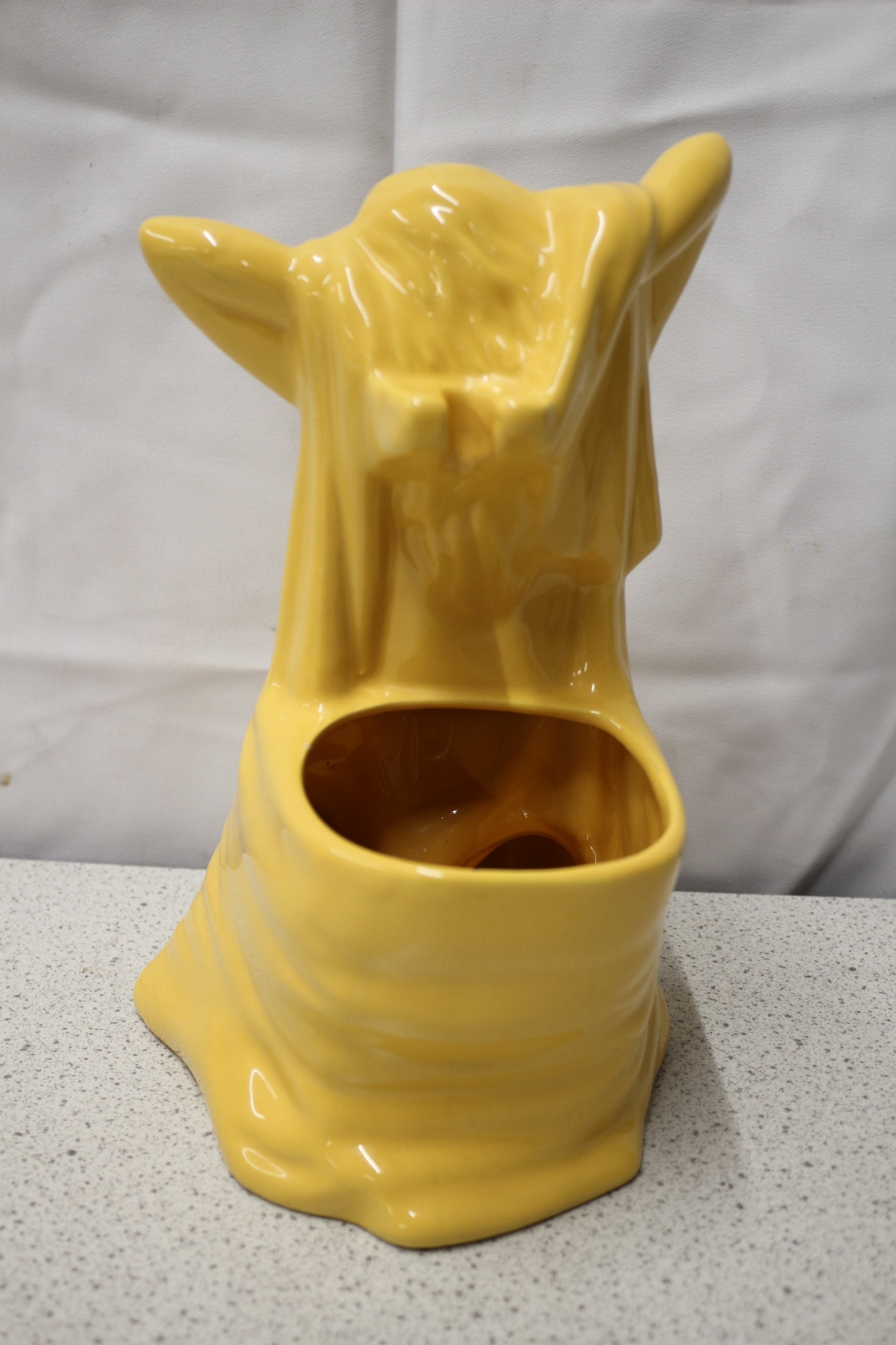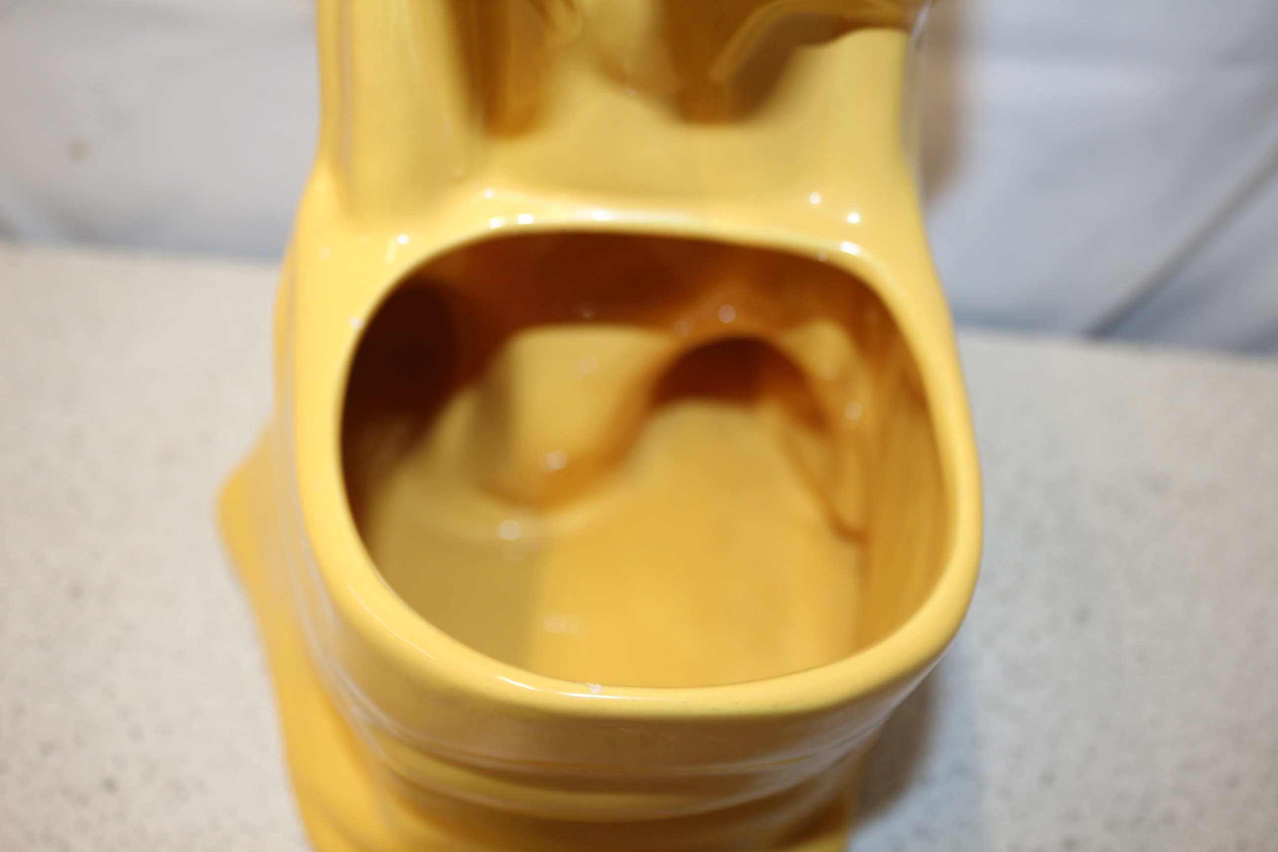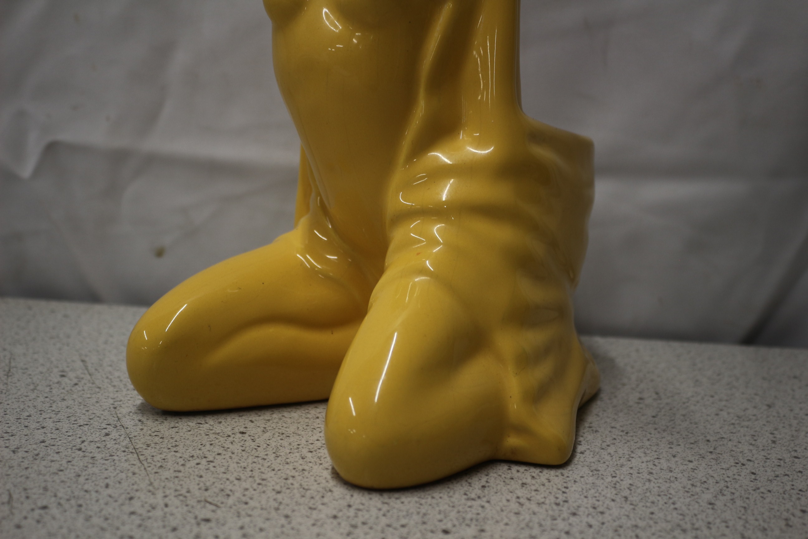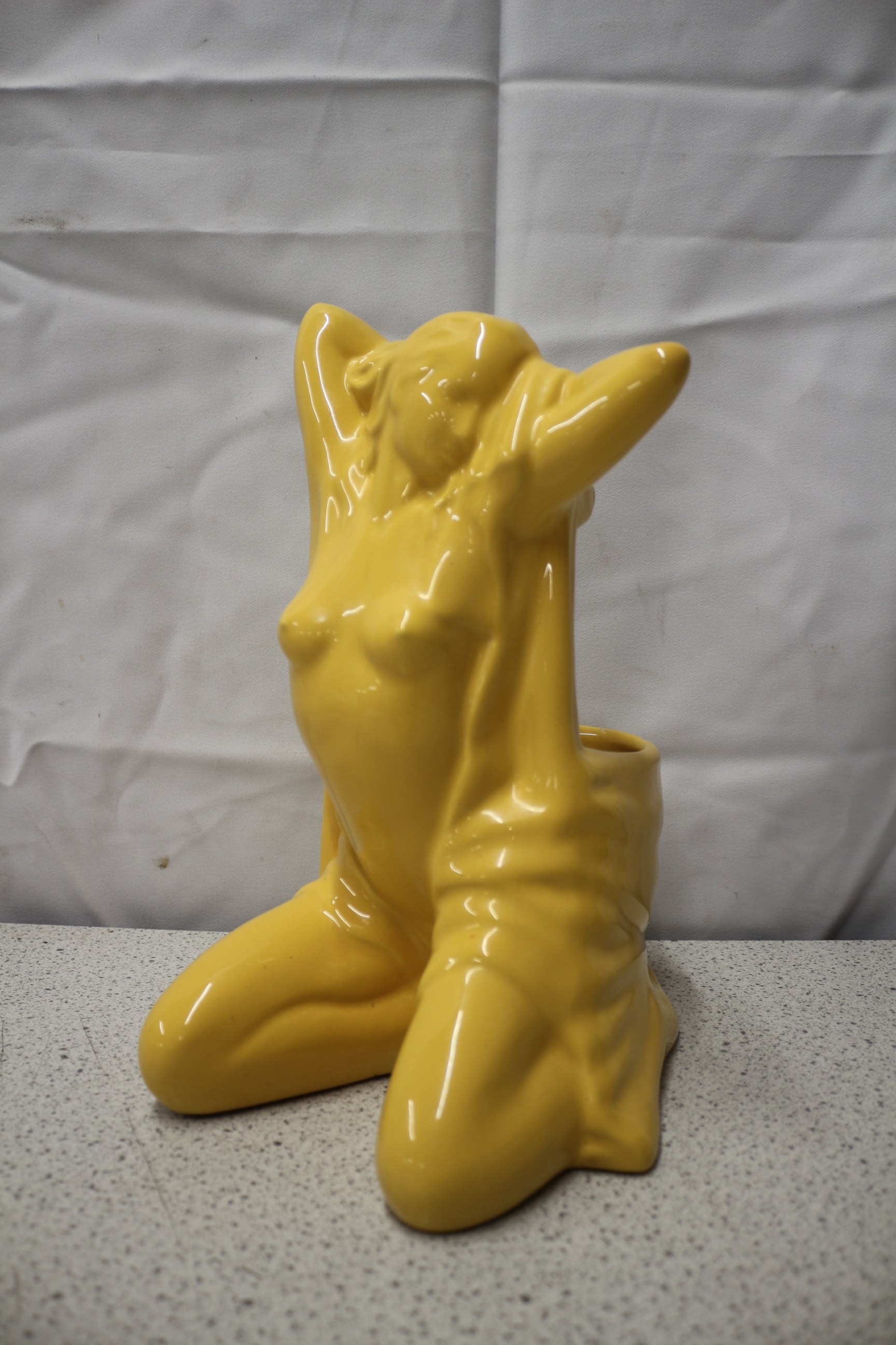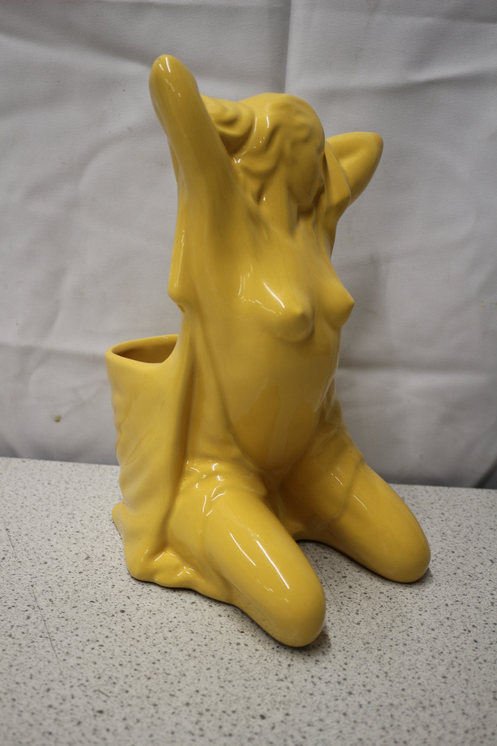 A single, glossy yellow ceramic figural toilet brush holder depicts a kneeling/reclining nude female figure. 28.5cm tall