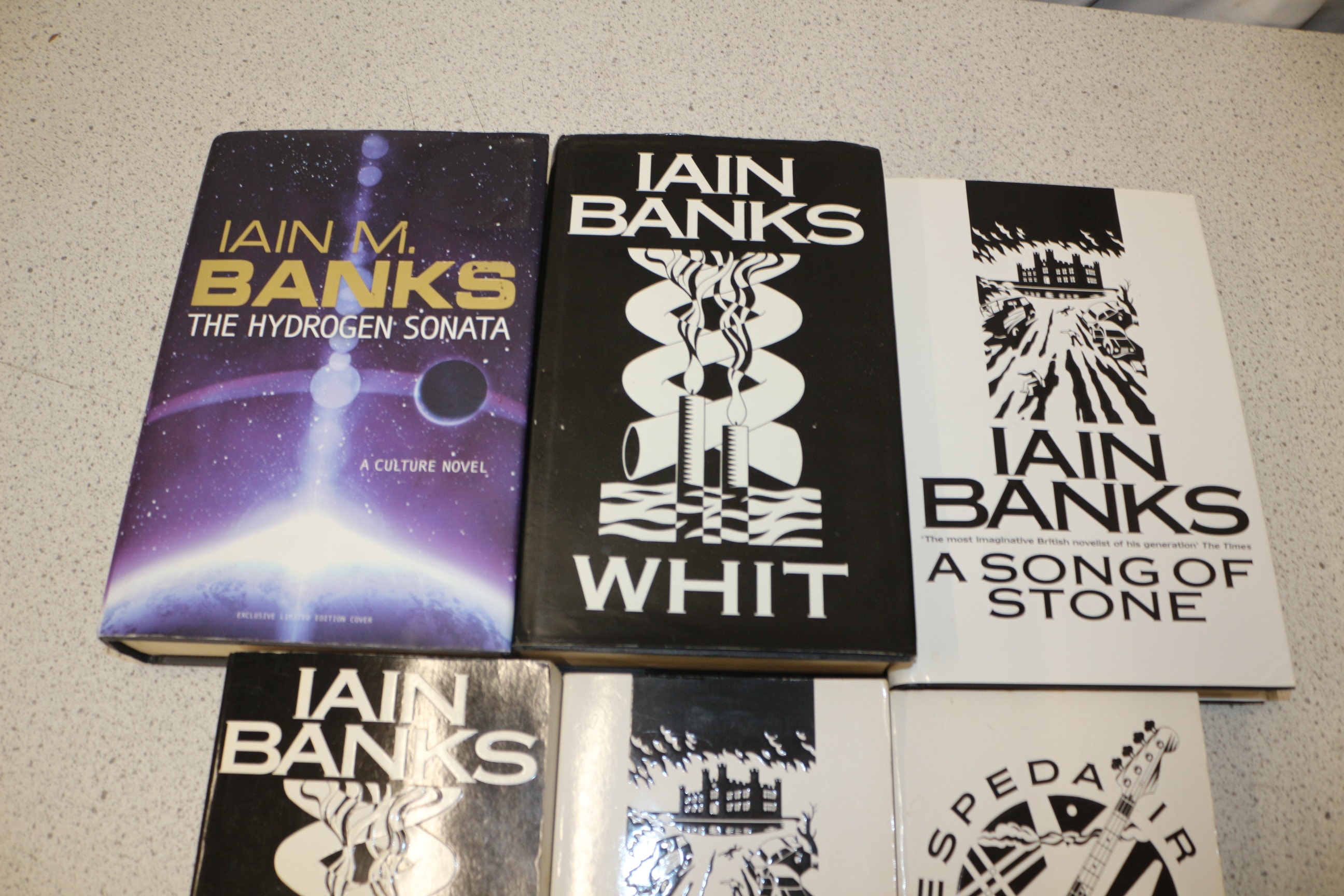 Six books by Iain Banks, including “The Hydrogen Sonata”, two copies of “Whit”, two copies of “A Song of Stone”, and “Espedair Street”.