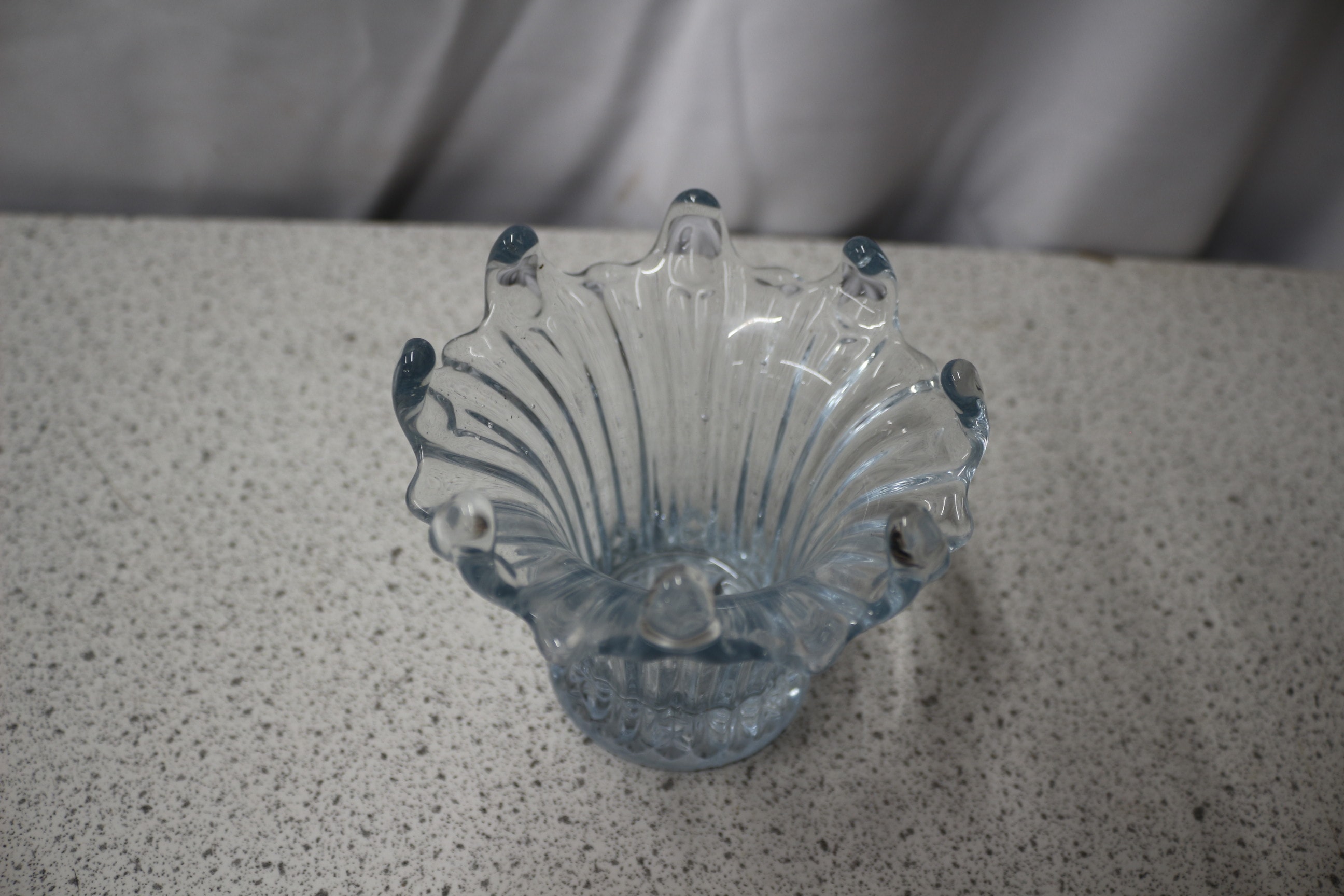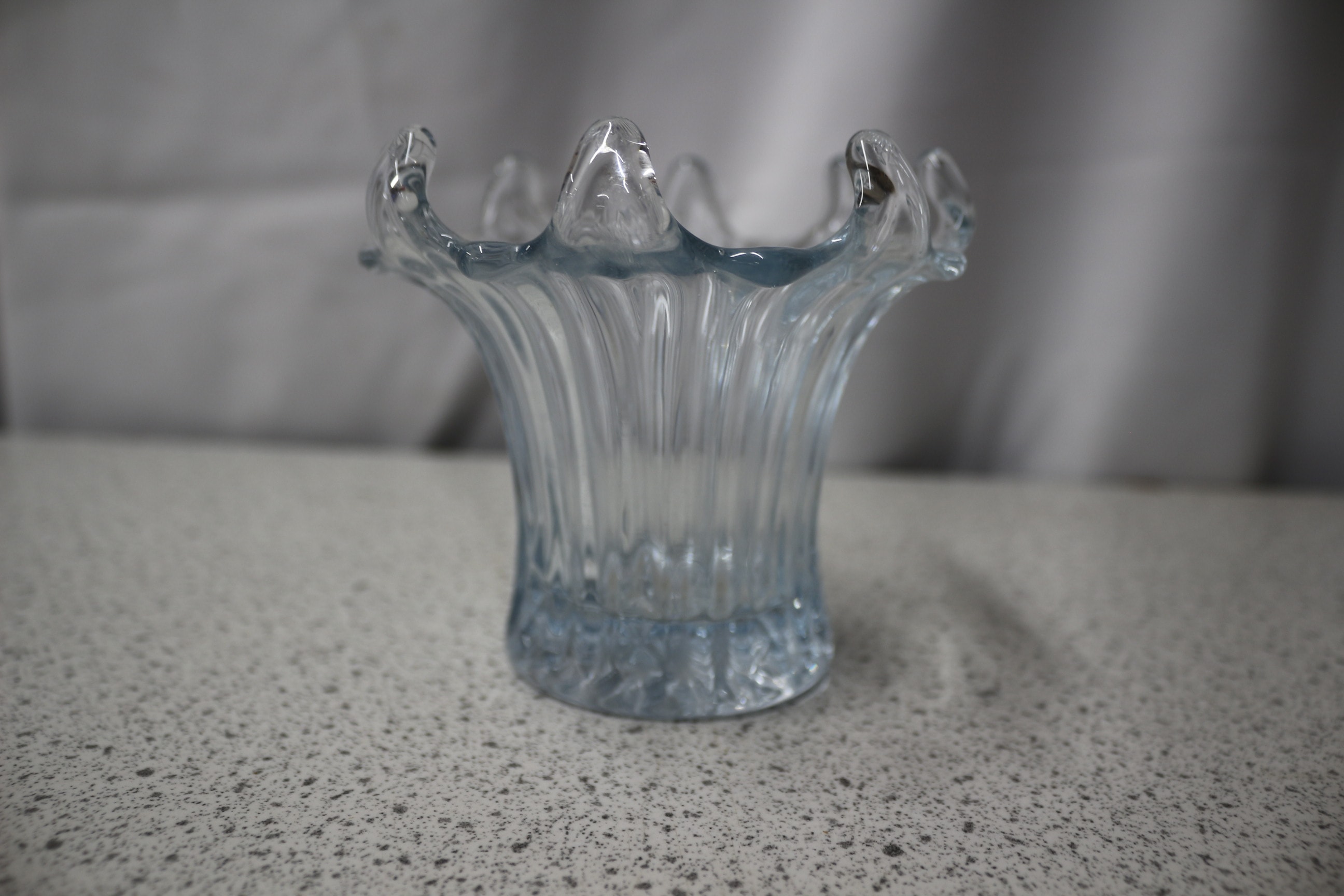 A clear/light blue fluted glass vase or candle holder with a lily-form rim, in Art Deco style. 9.5cm tall