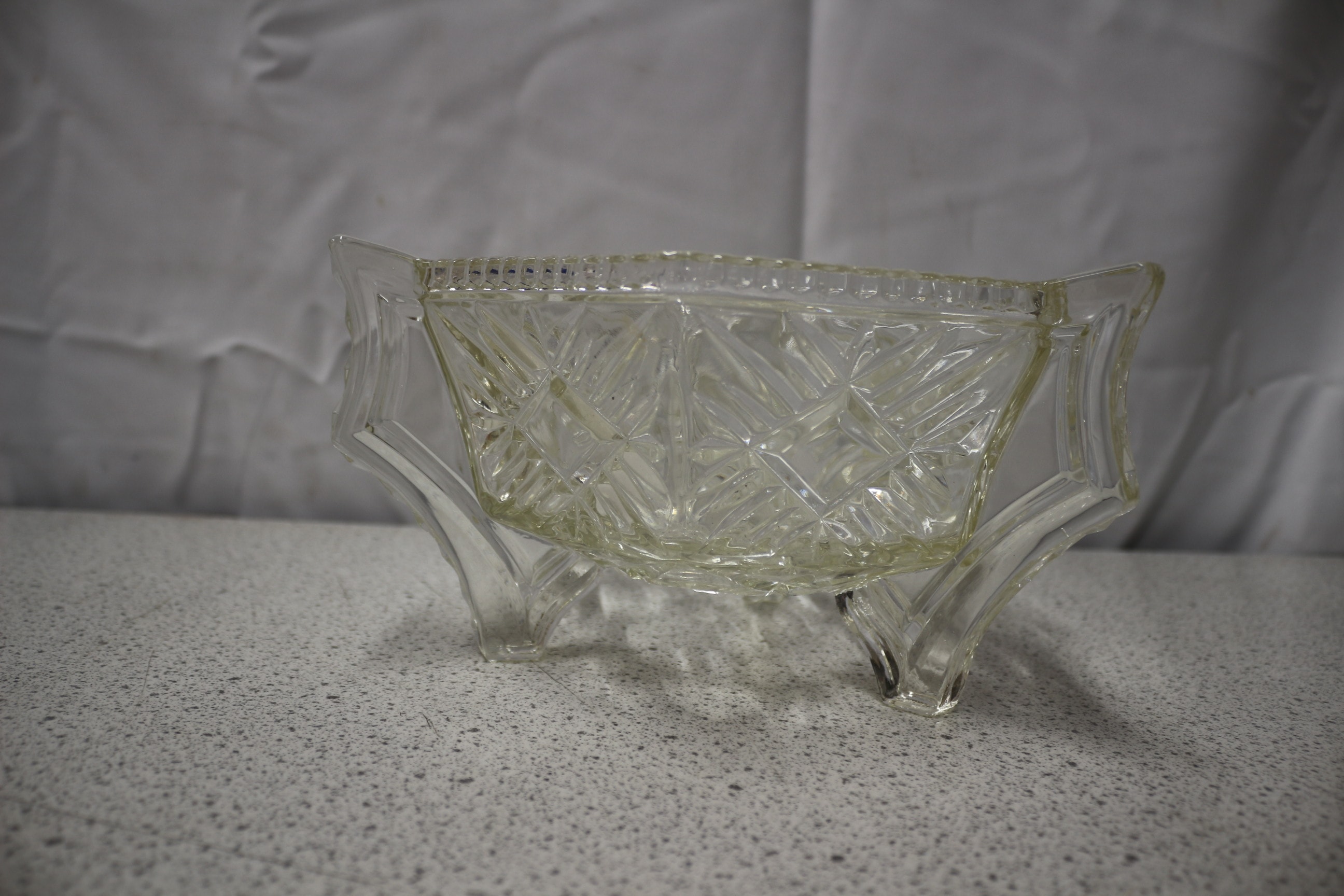 A clear, hexagonal, footed, pressed glass, divided candy dish or serving bowl with a geometric pattern.
