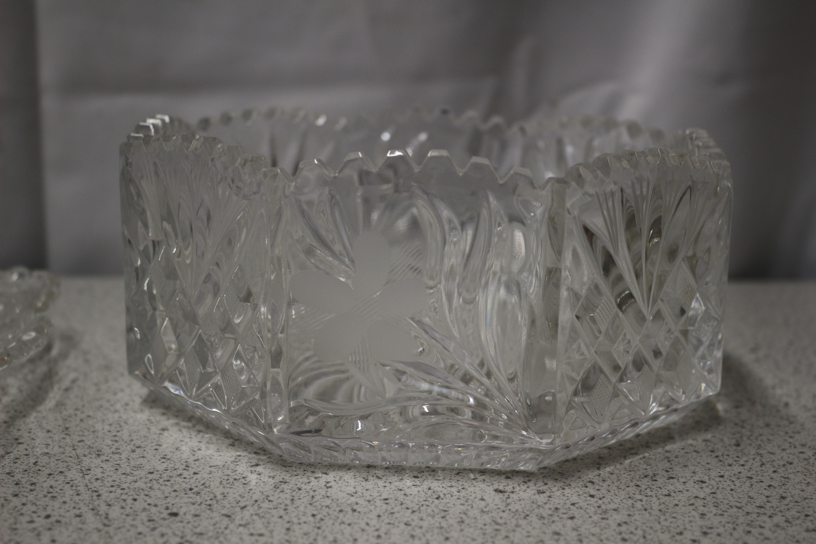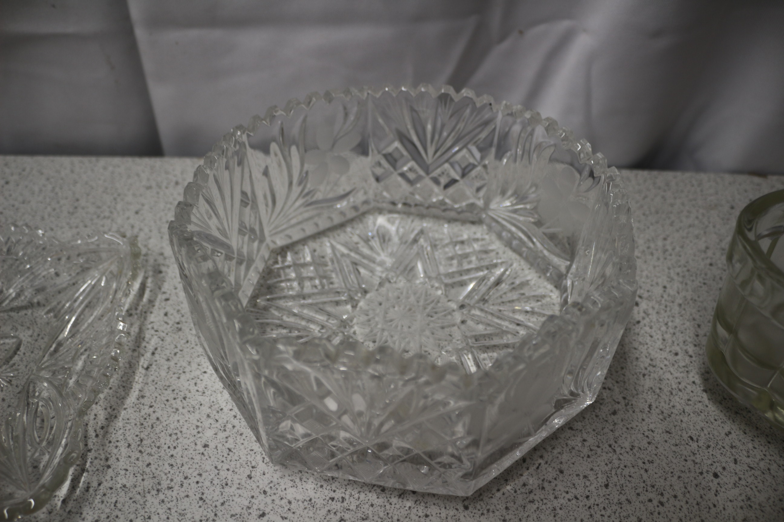 The lot consists of four clear glass serving items: one small round ribbed bowl, one square cut-glass dish, one large hexagonal cut-glass bowl with frosted floral designs, and one medium-sized oval ribbed bowl.
