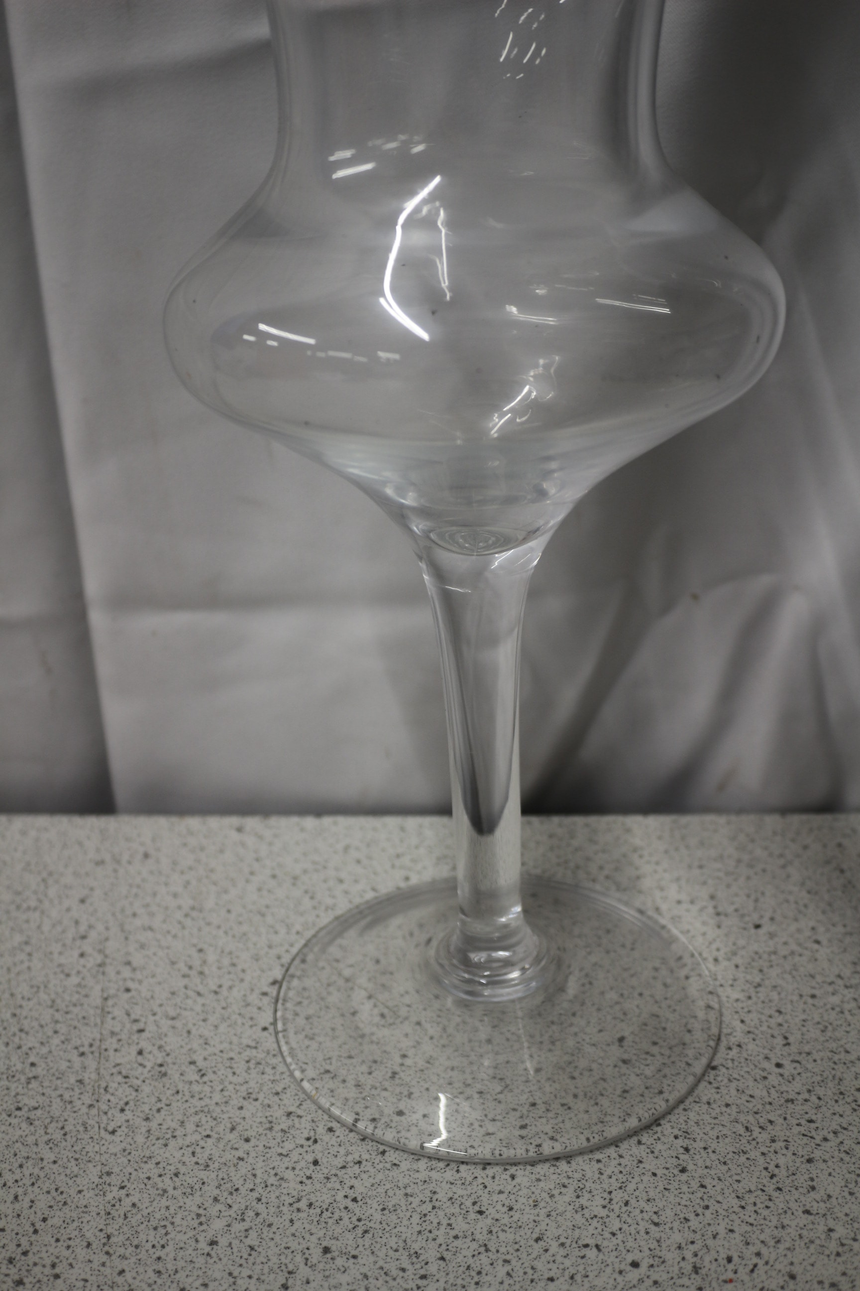 A clear glass decorative vase or goblet with a flared rim, bulbous body, and stemmed base. 40cm tall