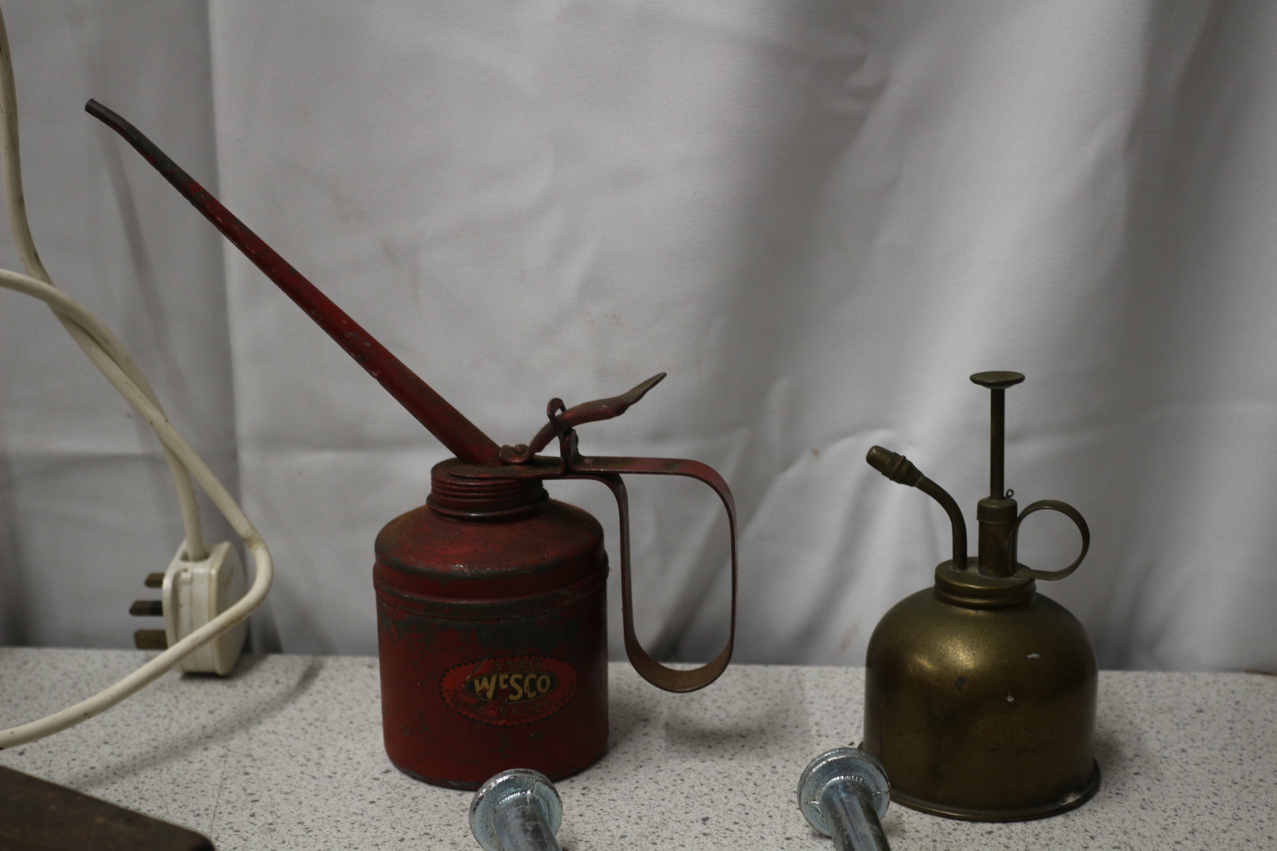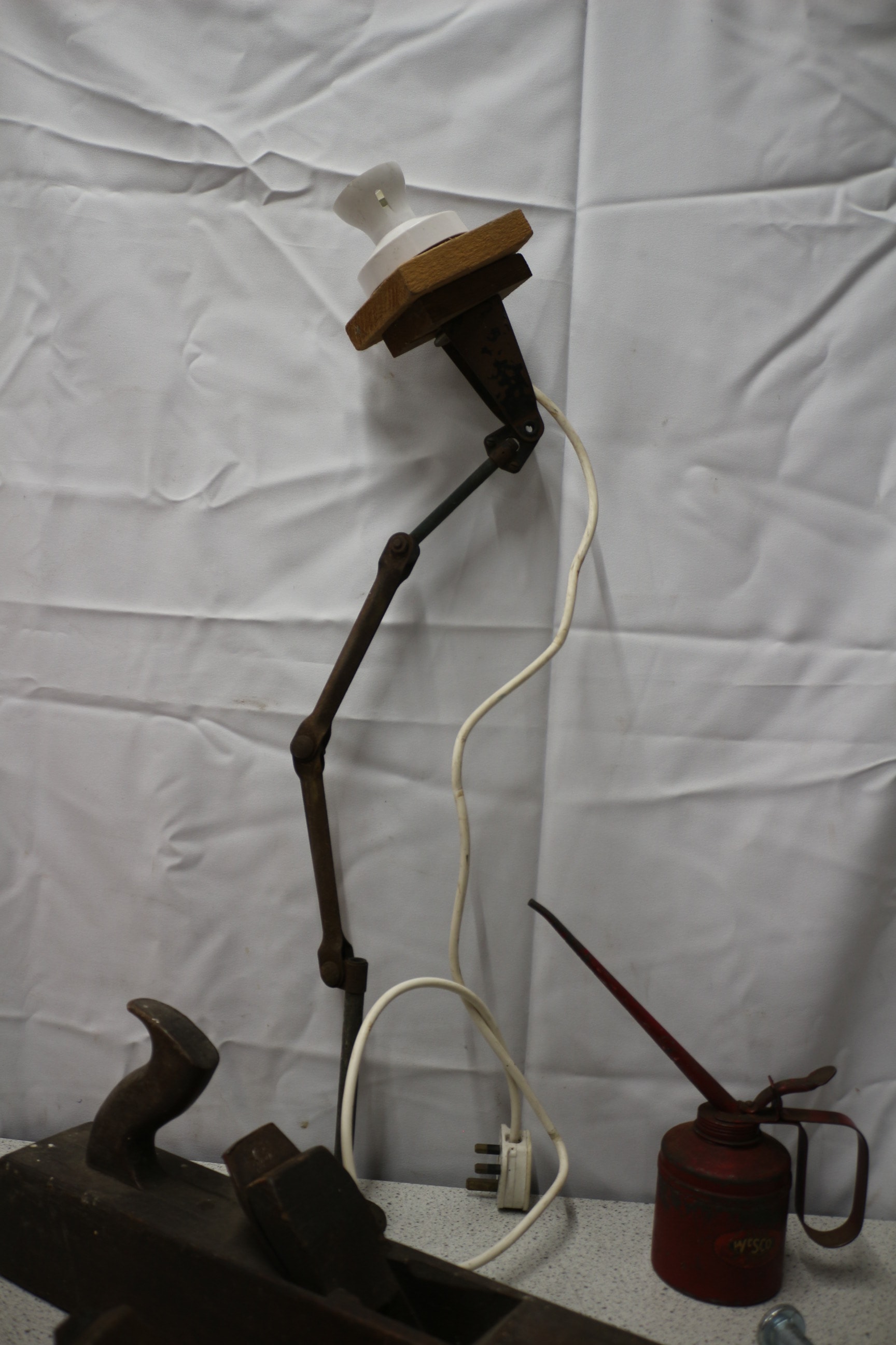 An articulated metal and wood desk lamp, three dark brown wooden hand planes, a red metal oil can labelled “WESCO”, a brass-coloured metal oil mister, one rusty metal open-ended Kingdick spanner, and two silver-coloured metal pegs.