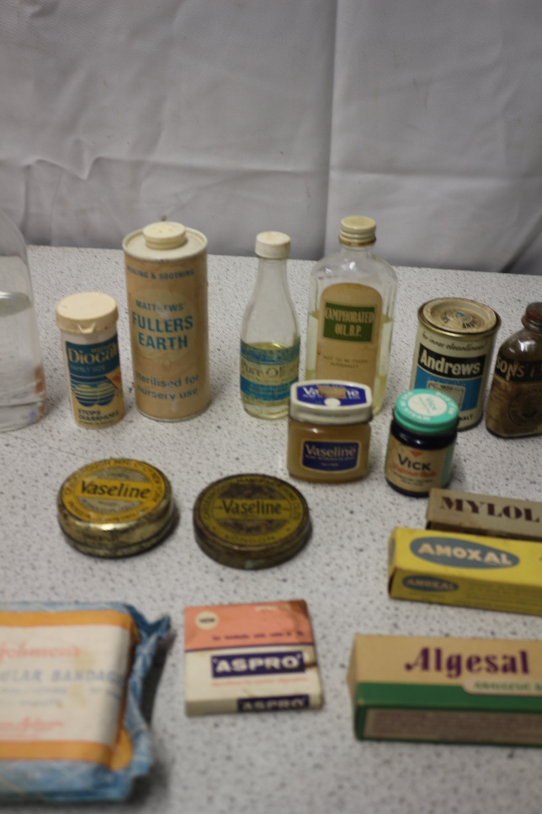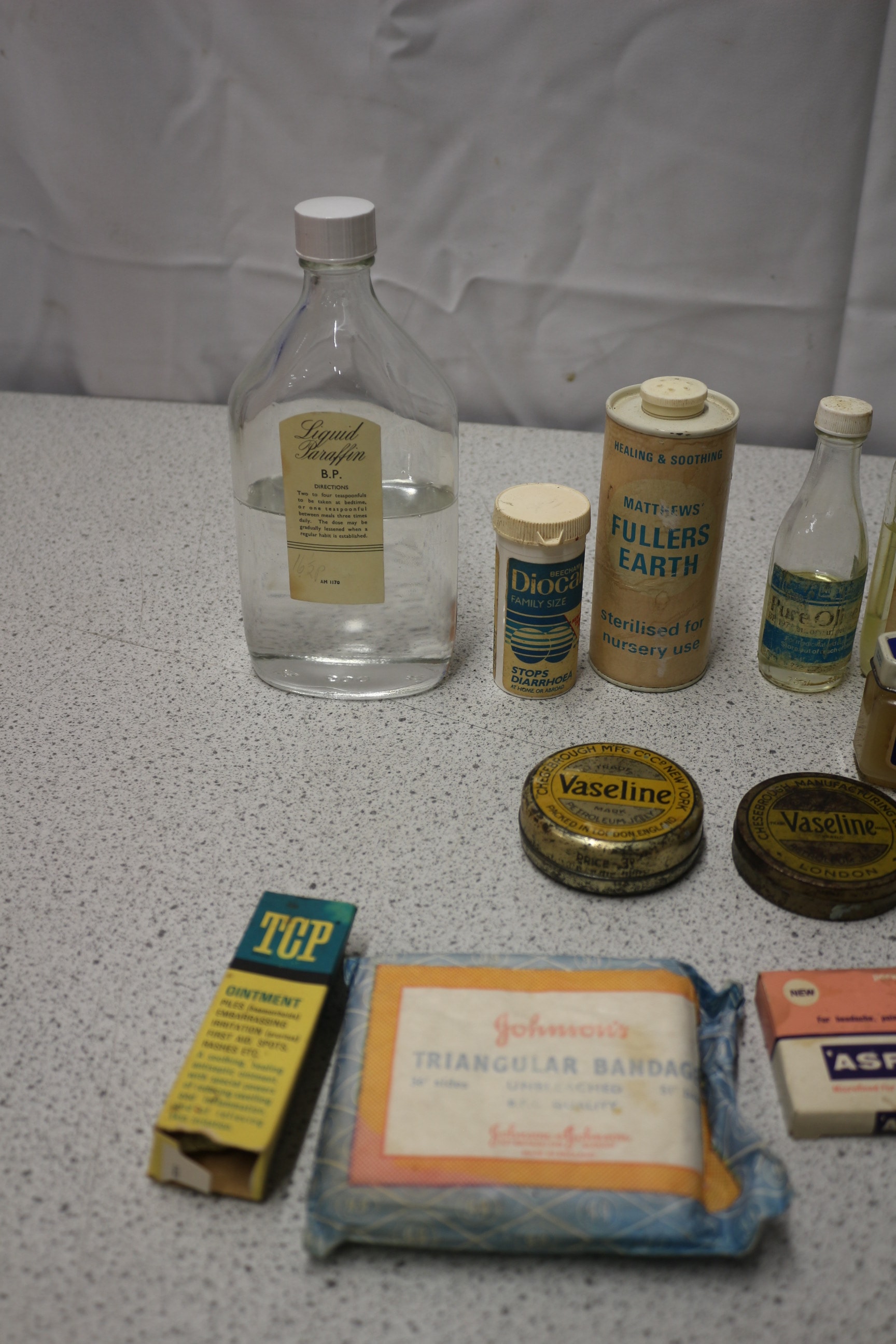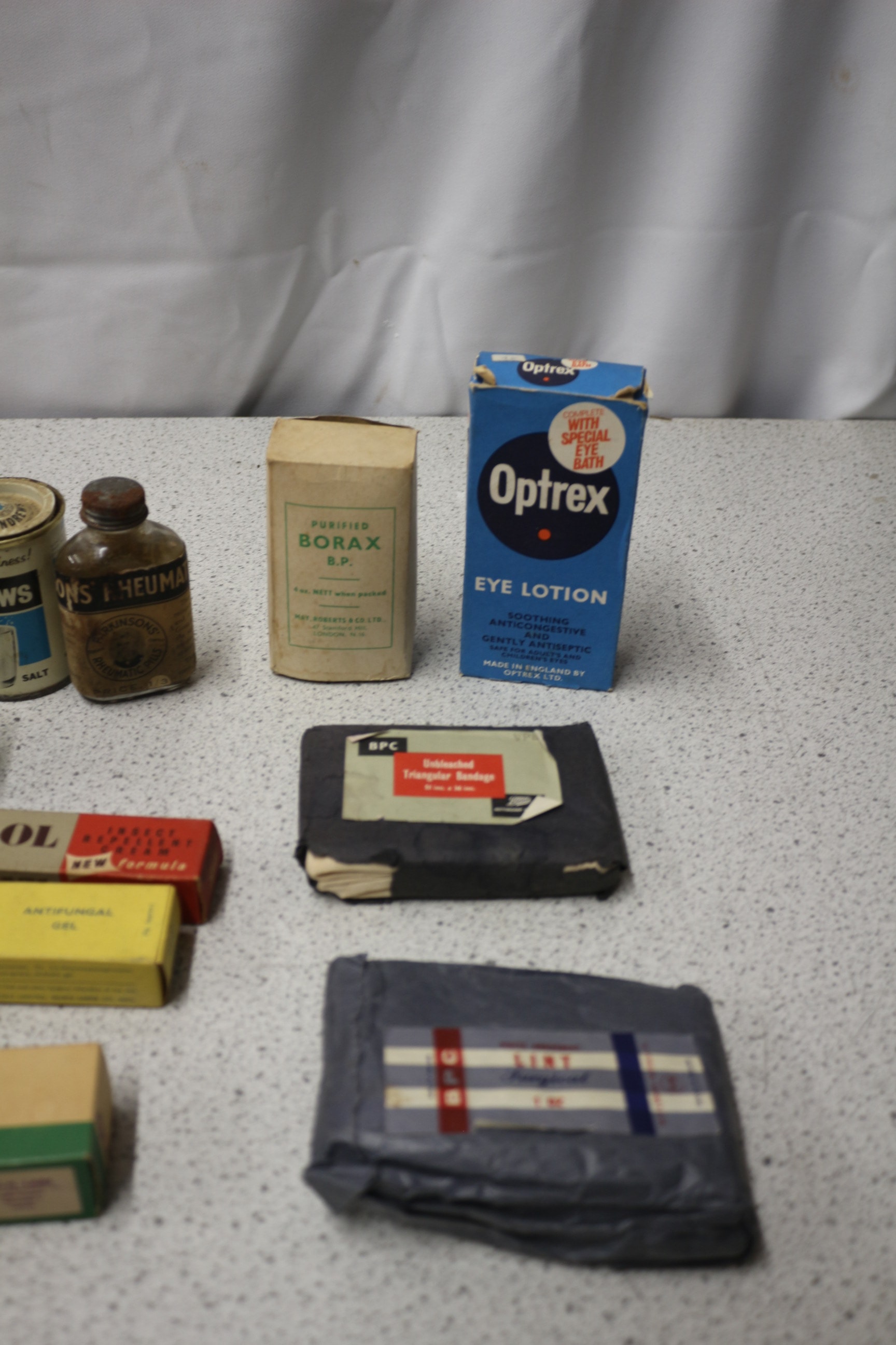 Selection of vintage chemist items including a blue and white box of Optrex EYE LOTION, stating ‘WITH SPECIAL EYE BATH’ and ‘SOOTHING ANTICONGESTIVE ANTISEPTIC’, made in England by Optrex Ltd. Vaseline tin and more
