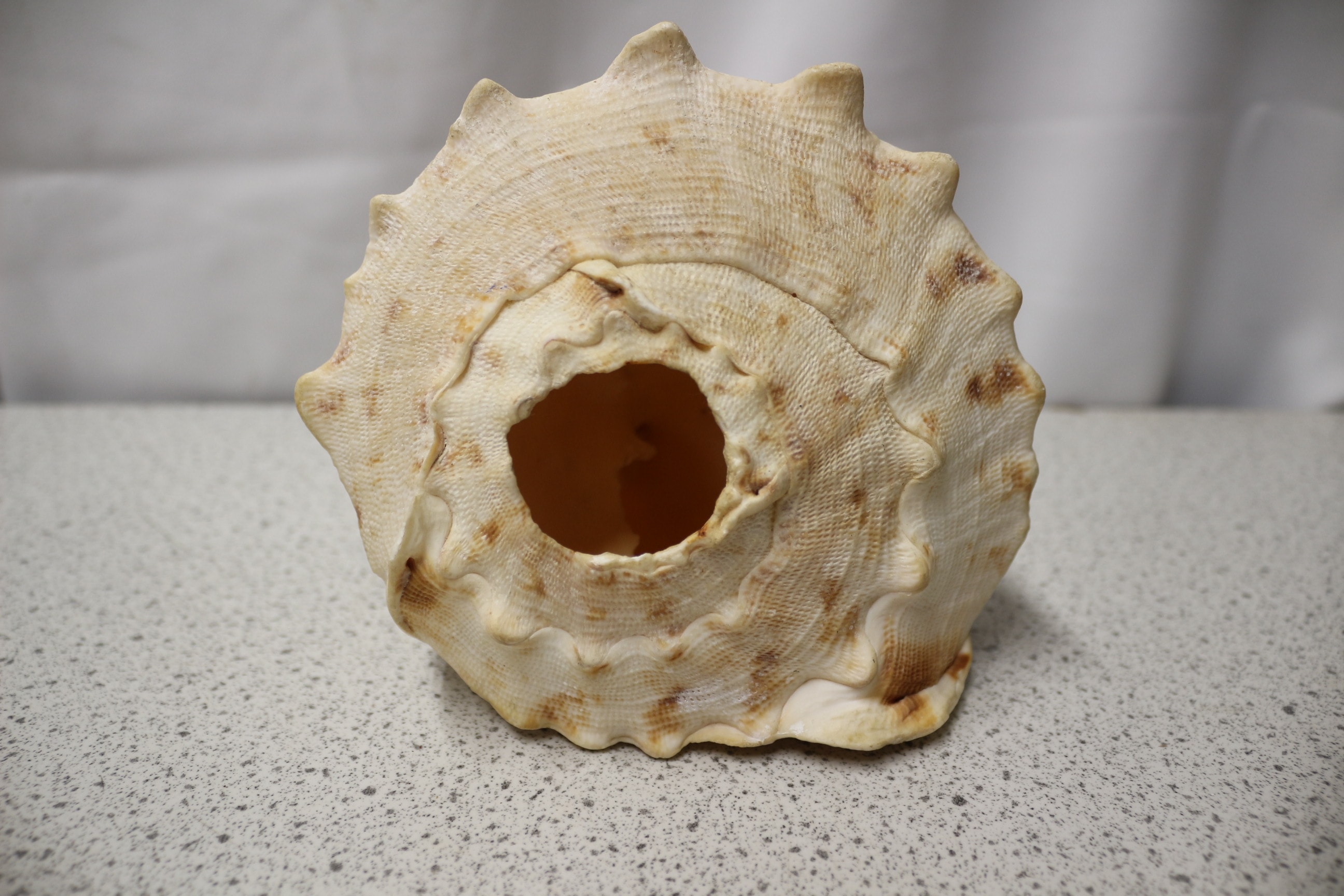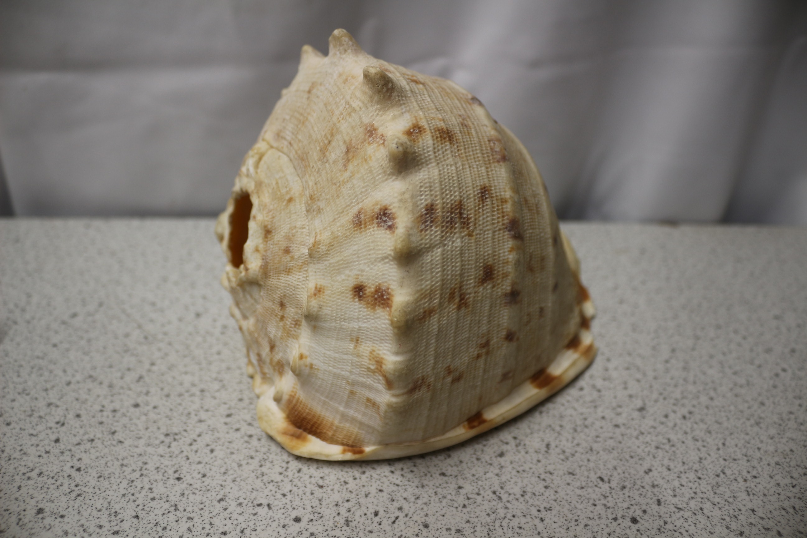 A beige and orange conch-type shell mounted on a light brown wooden base, accompanied by an electrical cord with a white plug and switch, alongside a cream/beige conch-type shell with brown spots and markings. Untested