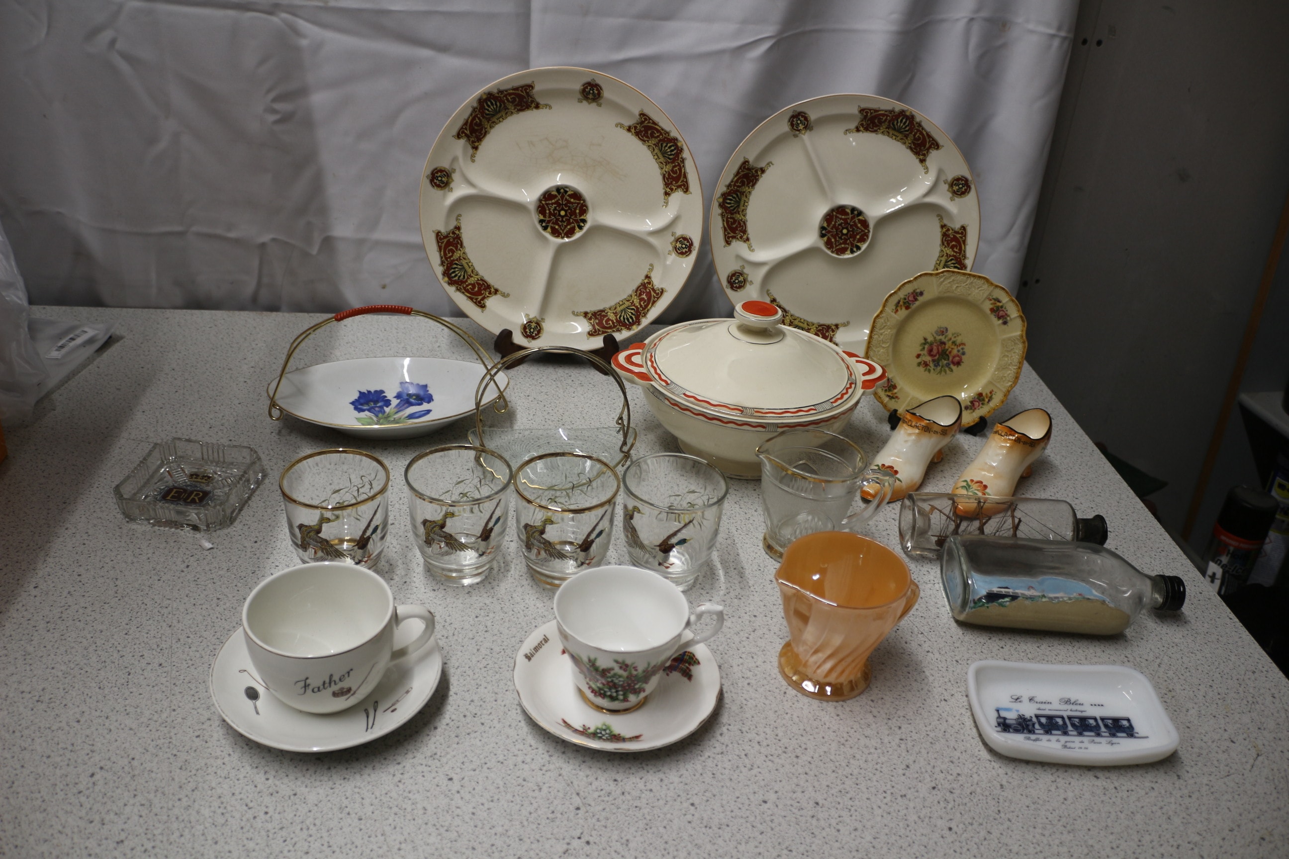 A collection of assorted tableware and decorative items, including two cream segmented platters, an oval white dish, a white covered casserole, a small cream floral plate, two cream ceramic shoes, a set of four clear bird-motif glasses, a clear ‘ER’ ashtray, a clear glass pitcher and mug, ‘Father’ and ‘Balmoral’ teacups and saucers, an orange glass creamer, two scene-filled glass bottles, and a ‘Le train train’ dish.