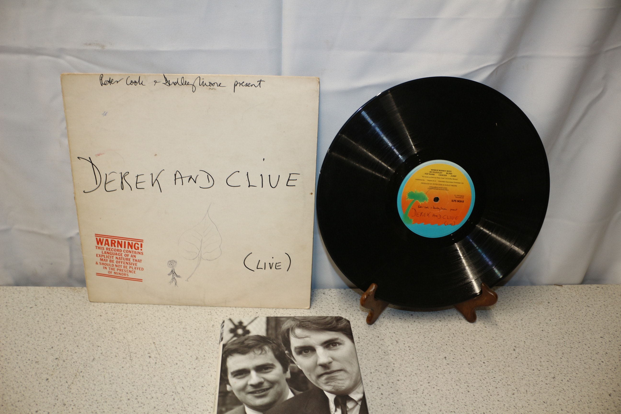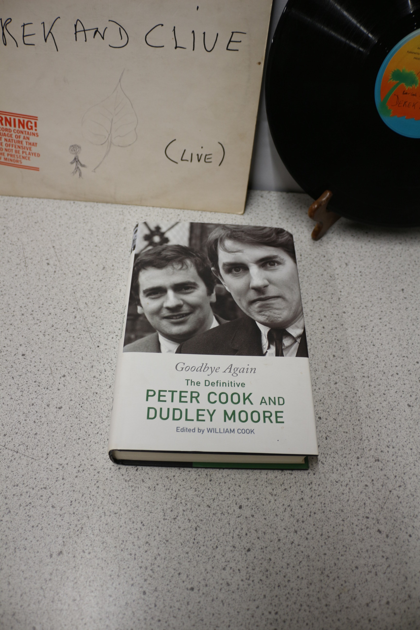 A Peter Cook & Dudley Moore ‘Derek and Clive (Live)’ vinyl record with its sleeve, accompanied by ‘Goodbye Again The Definitive Peter Cook and Dudley Moore’ book.