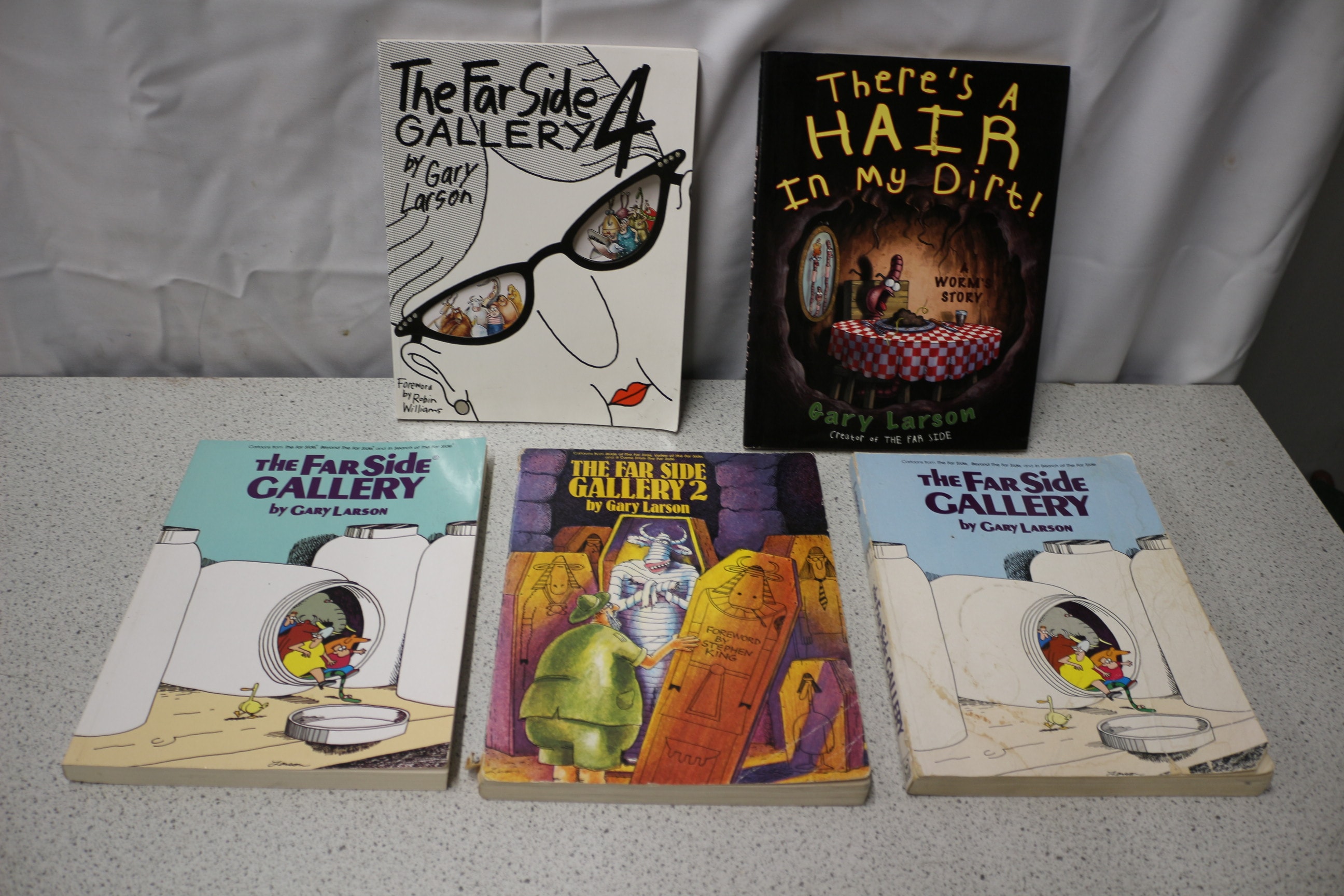 A collection of five books by Gary Larson, including two copies of ‘The Far Side Gallery’, ‘The Far Side Gallery 2’, ‘The Far Side Gallery 4’, and ‘There’s a Hair in My Dirt!’.