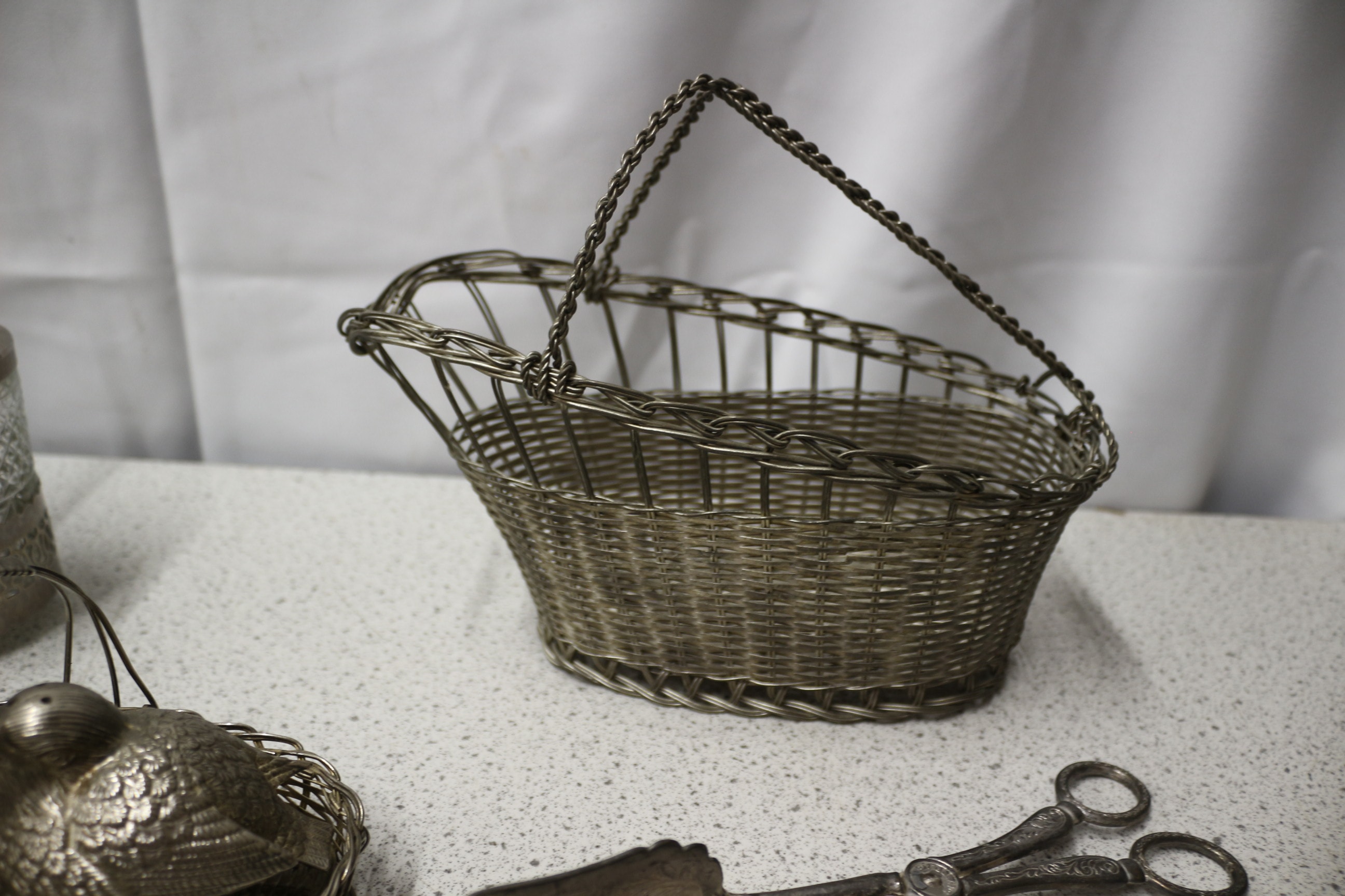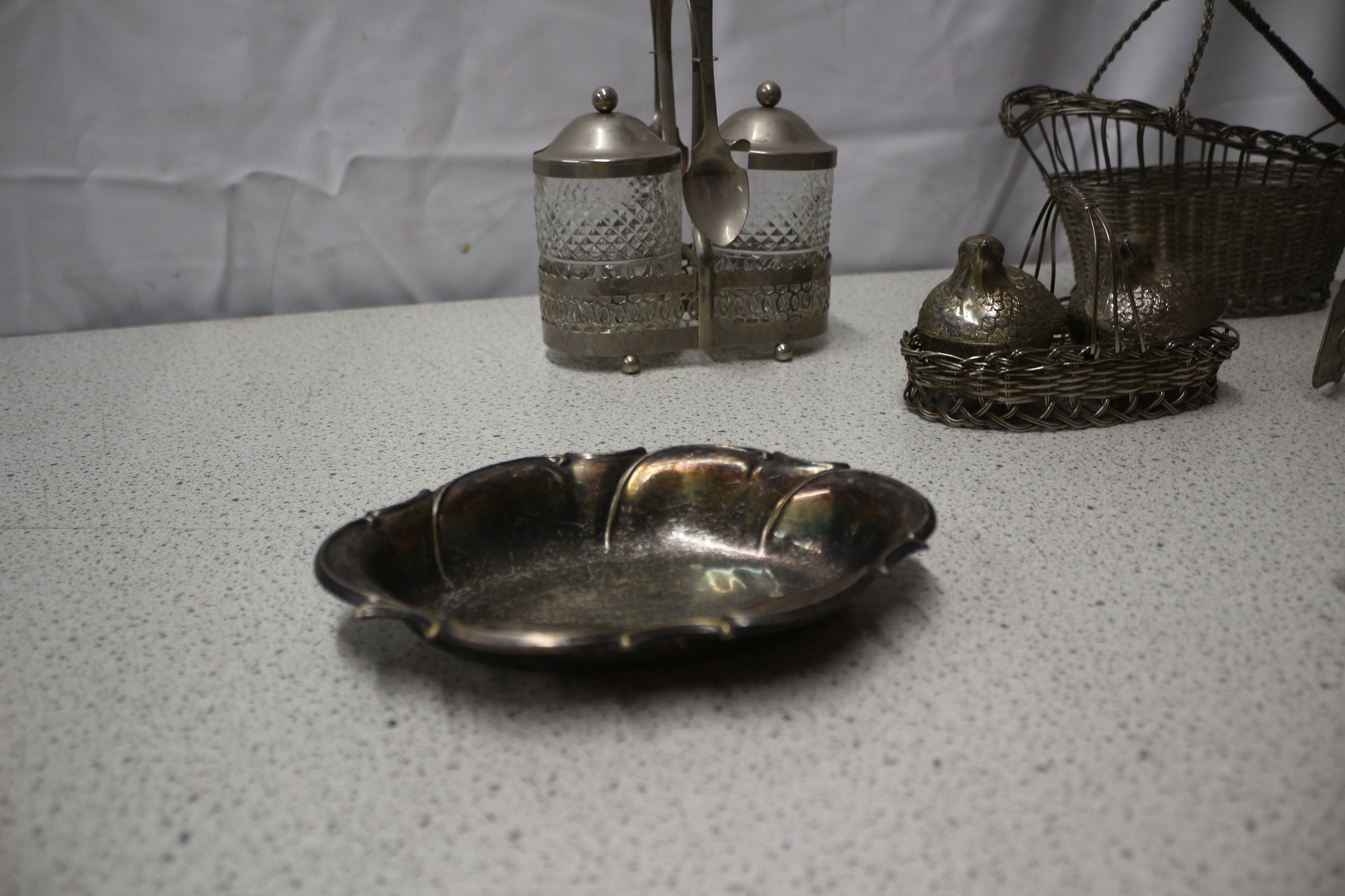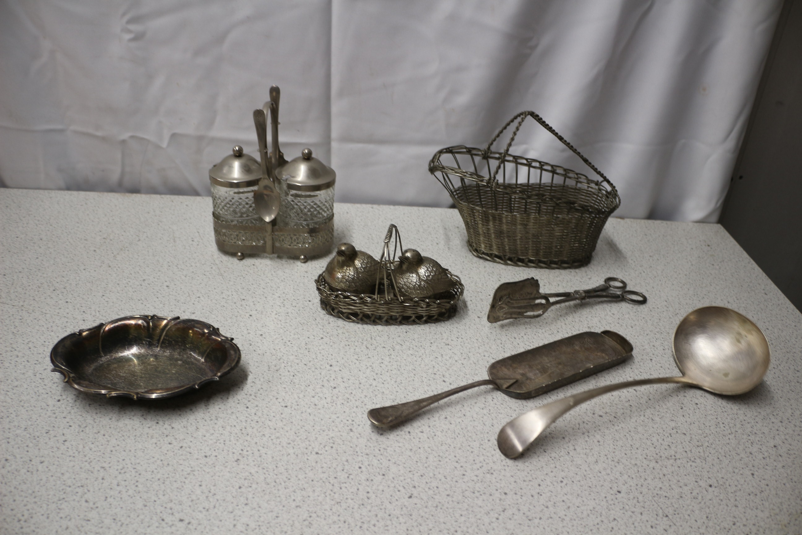 A cruet set, a small fluted dish, two woven baskets, two bird-shaped lidded containers, and five assorted serving utensils (tongs, spatula, two ladles/spoons) of tarnished silver-toned metal kitchen and serving ware.