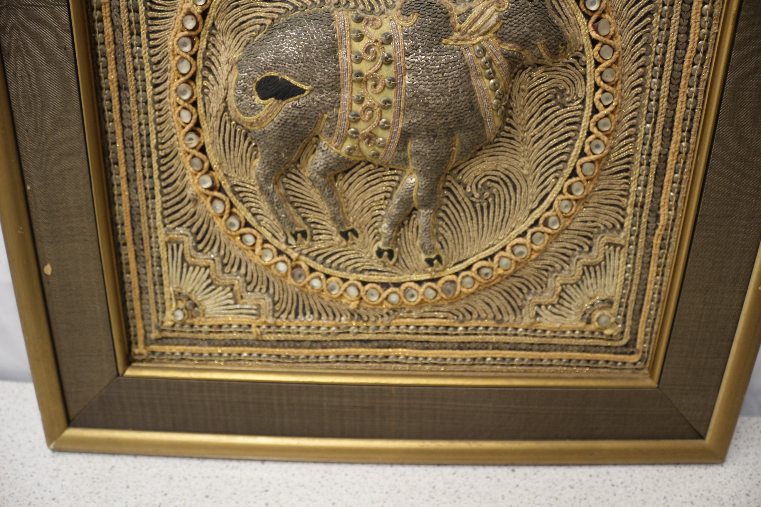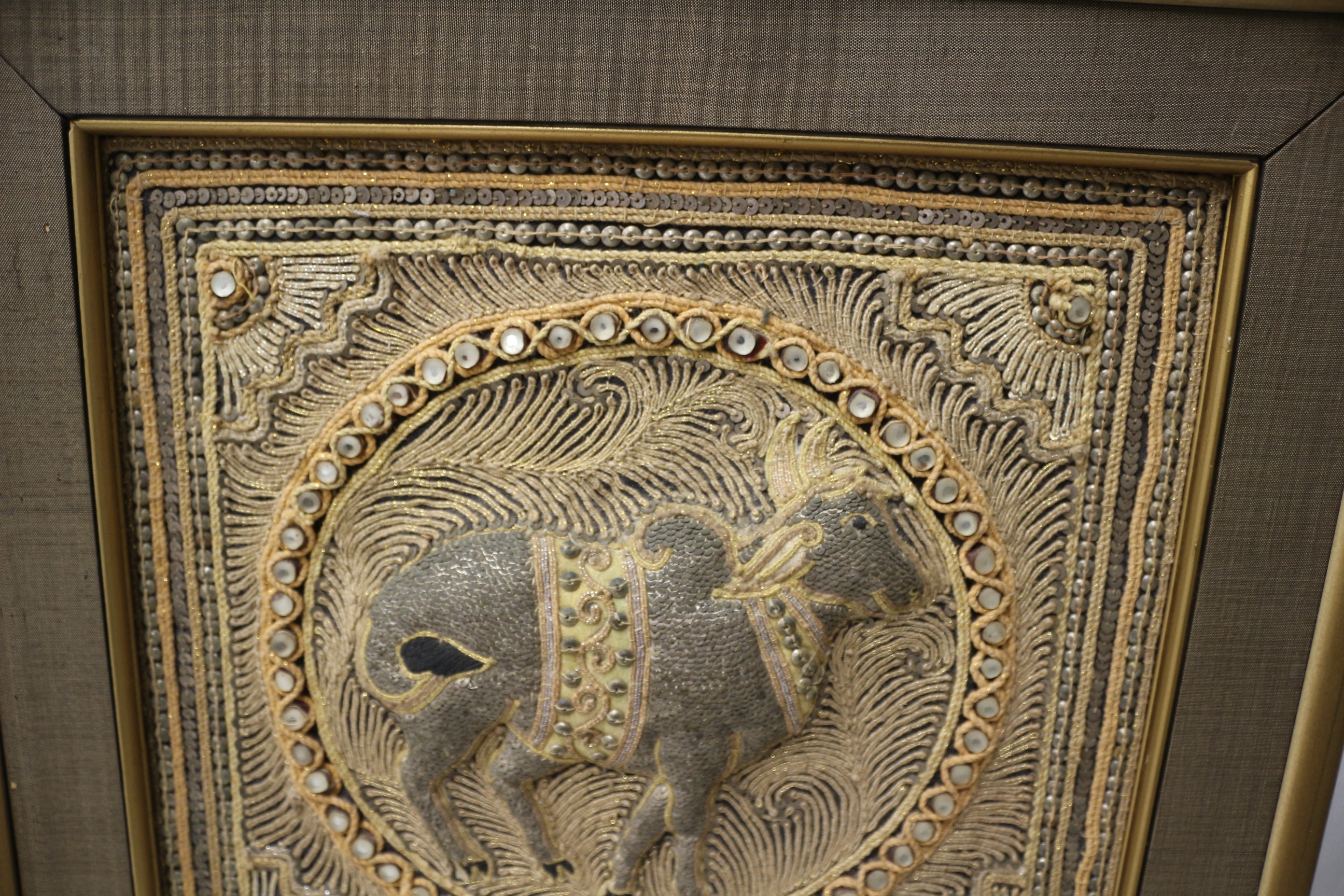 A framed textile artwork depicting a grey and gold embellished bull or ox within a circular design of gold, silver, and cream threadwork accented with mirror-like sequins, set in a gold and dark brown frame. 47.5×47.5cm