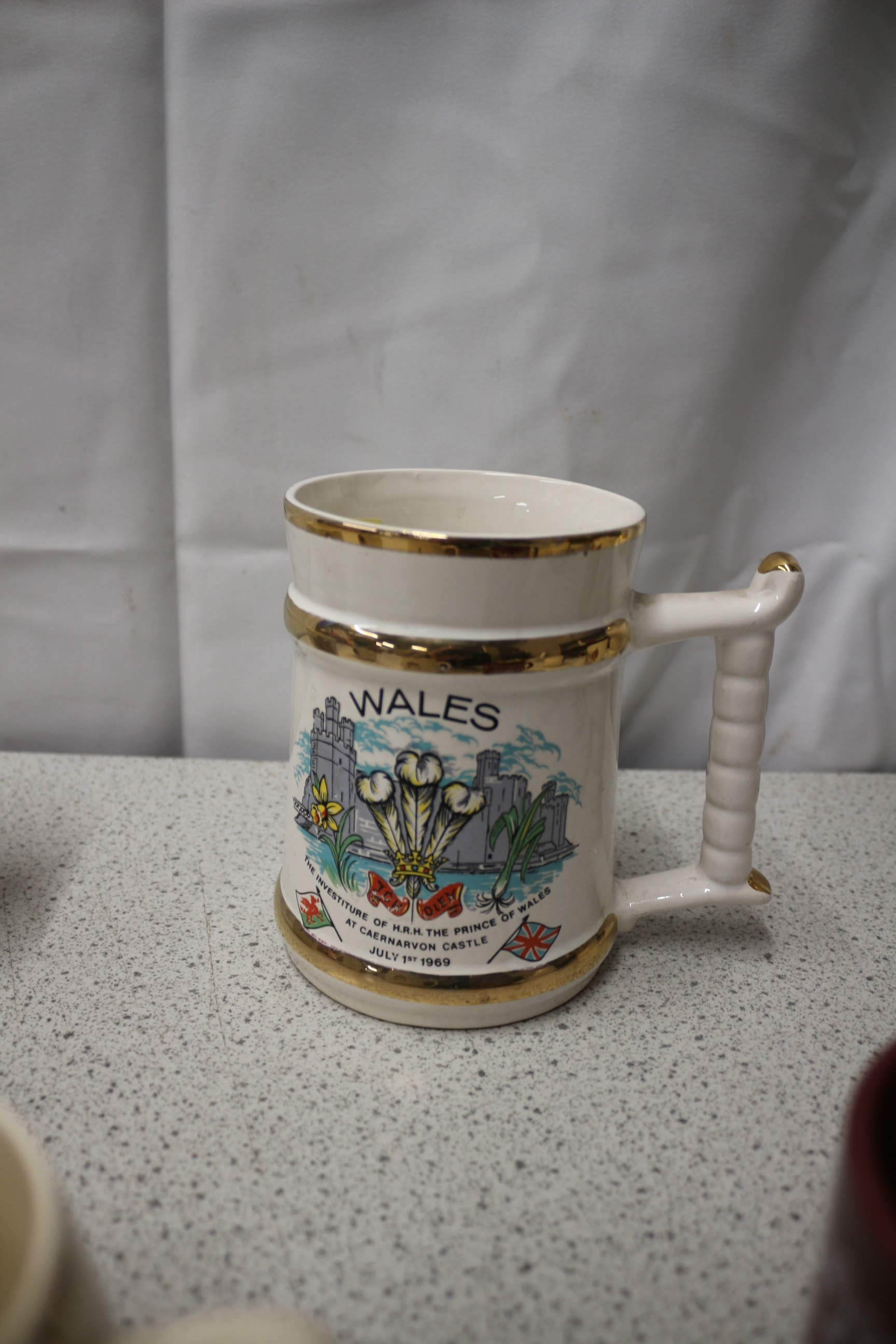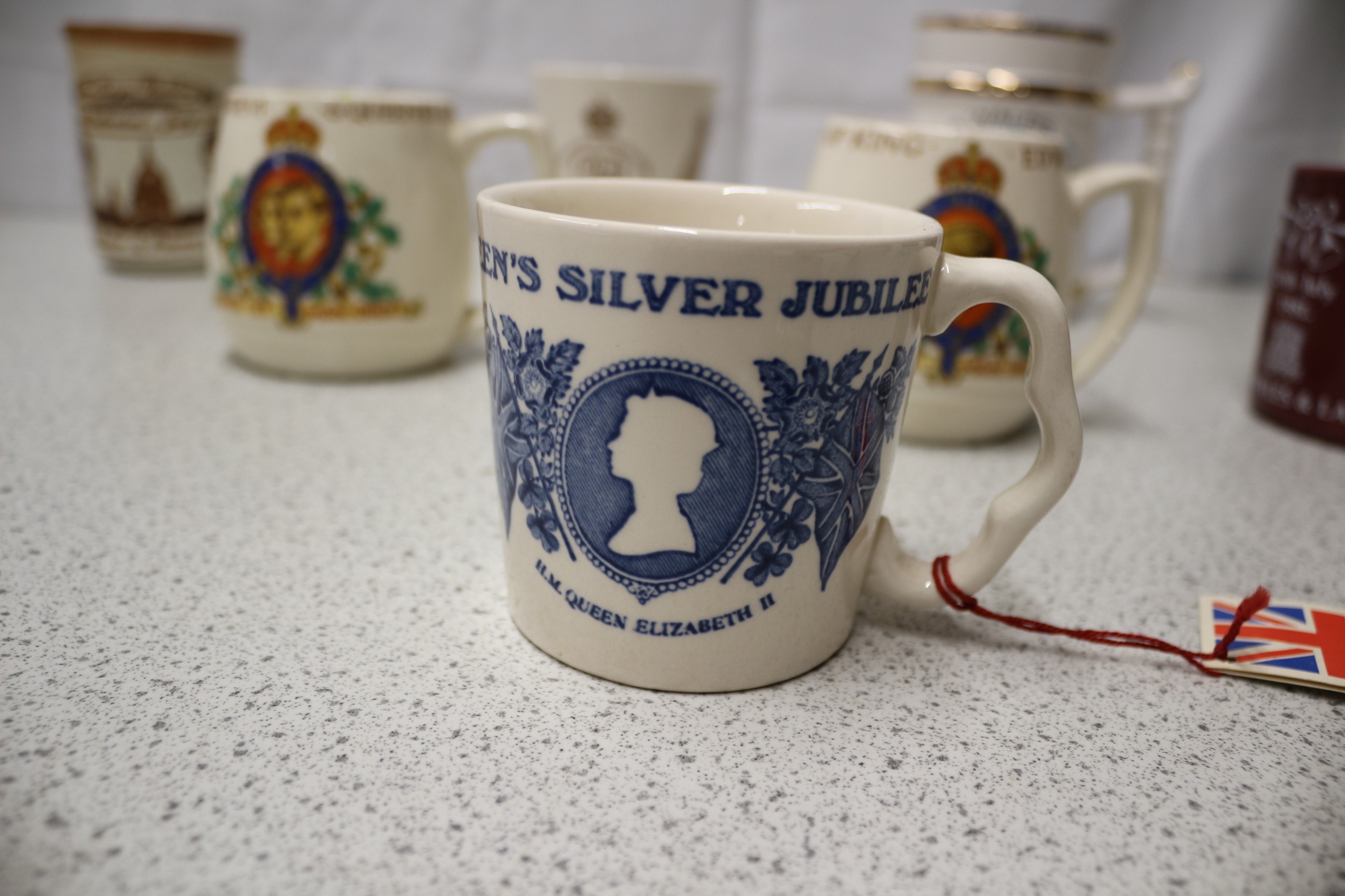 Collection of Royal mugs. An off-white ceramic mug with blue and white decoration, marked “QUEEN’S SILVER JUBILEE” and “H.M. QUEEN ELIZABETH II”, featuring a silhouette of Queen Elizabeth II, with a Union Jack flag tag.